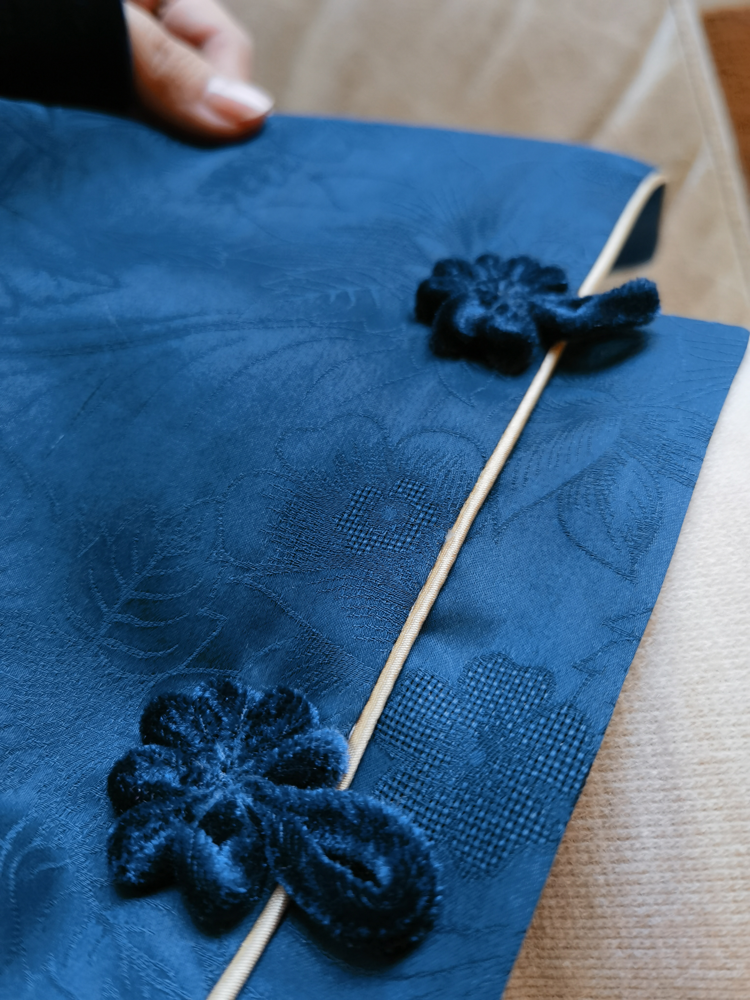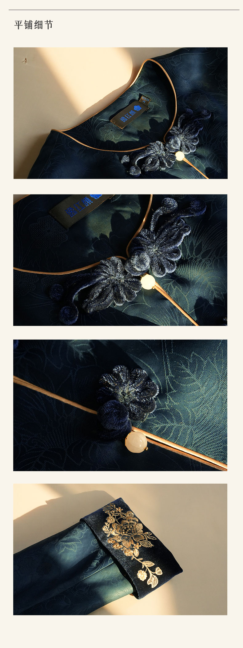 👉领口还搭配了一对手工丝绒缠枝花扣,让整体更加和谐。