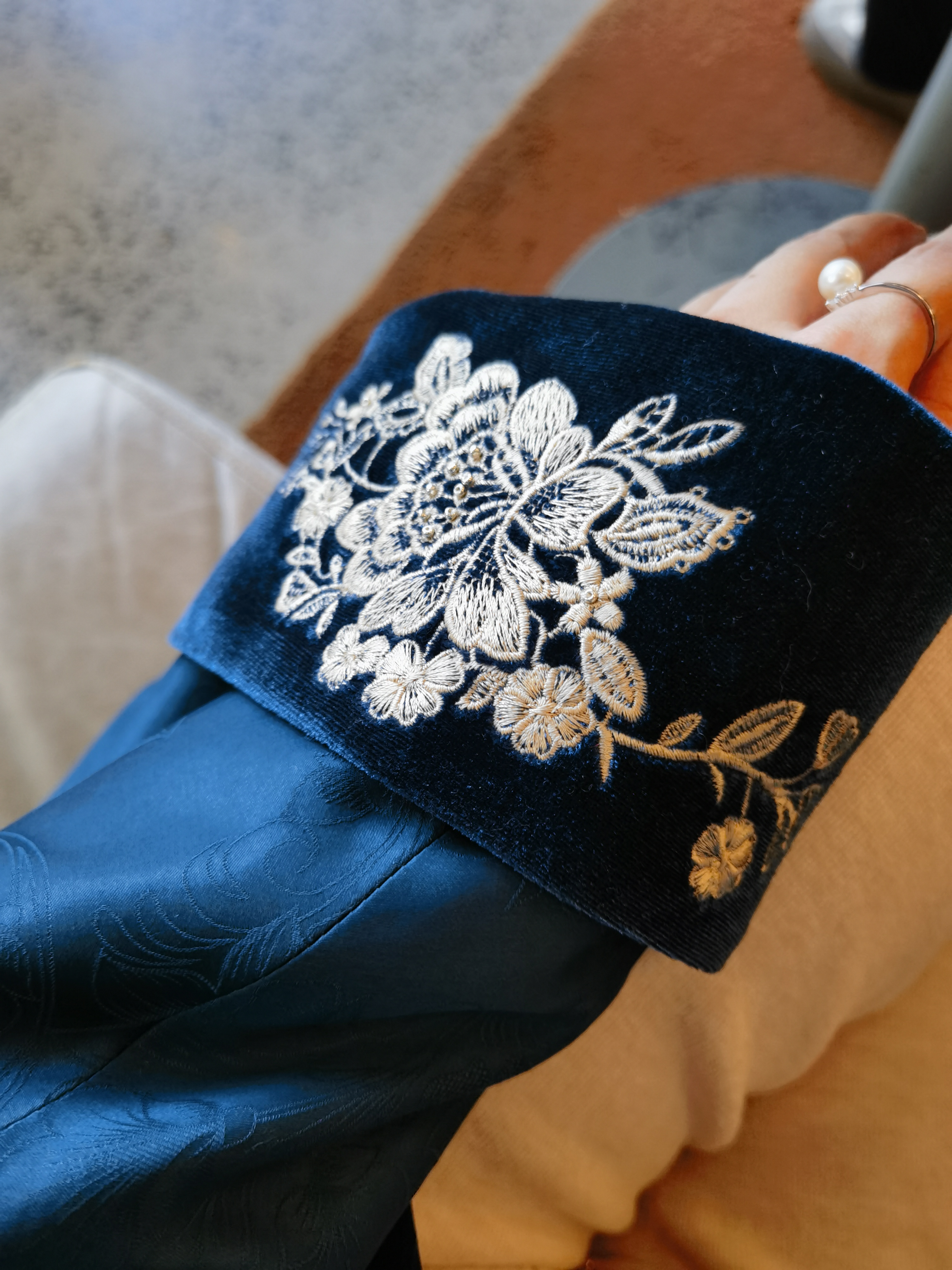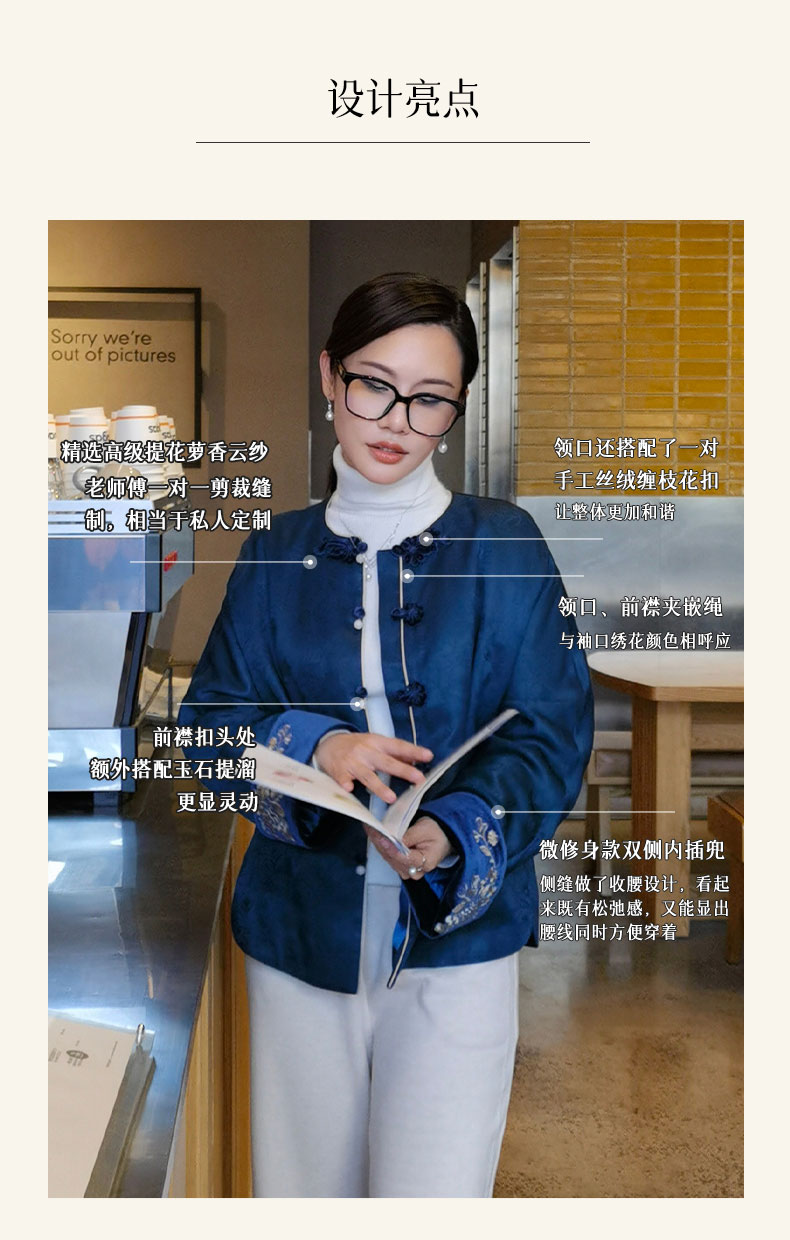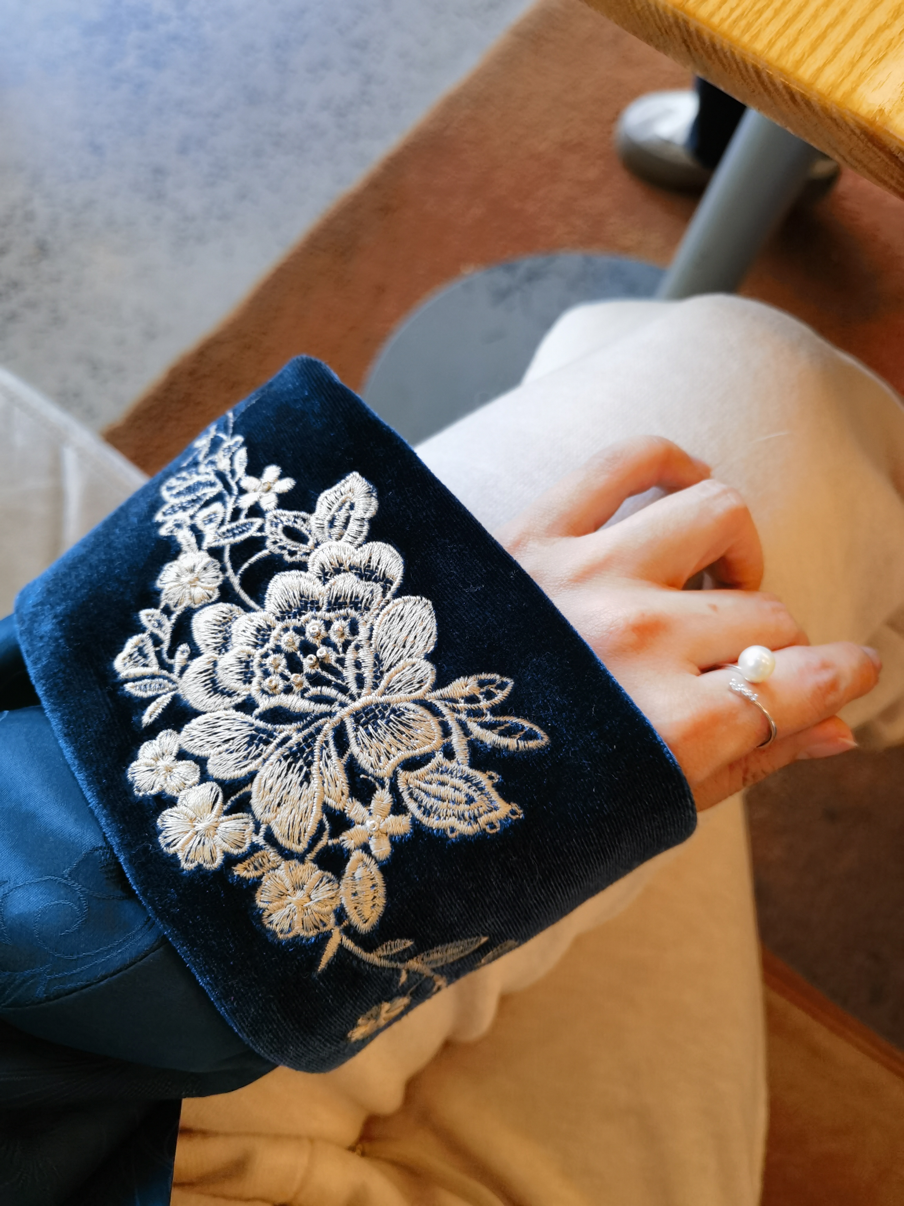 👉袖口拼接丝绒,在哑光金色缠枝牡丹纹刺绣的加持下,给整体增加一抹亮色的同时,更显矜贵。局部手工钉以同色系的小米珠,增加立体肌理和细节感。