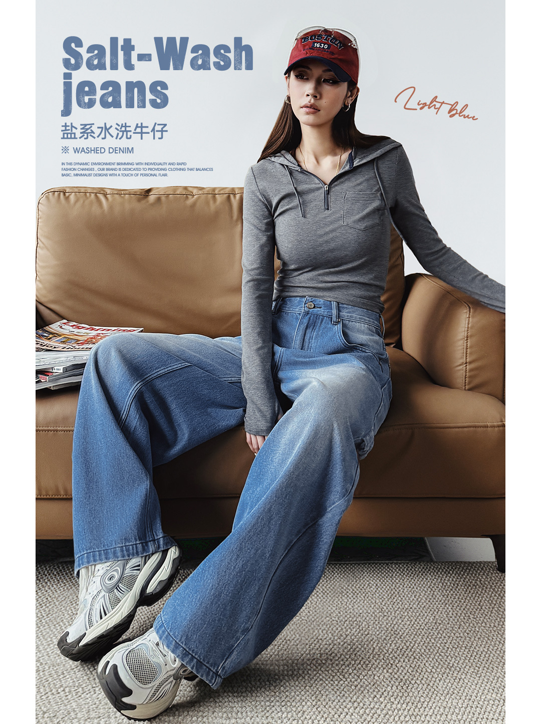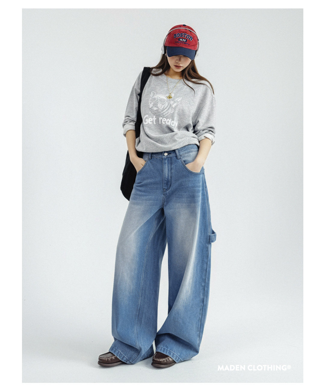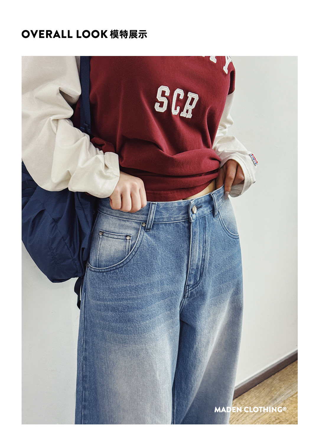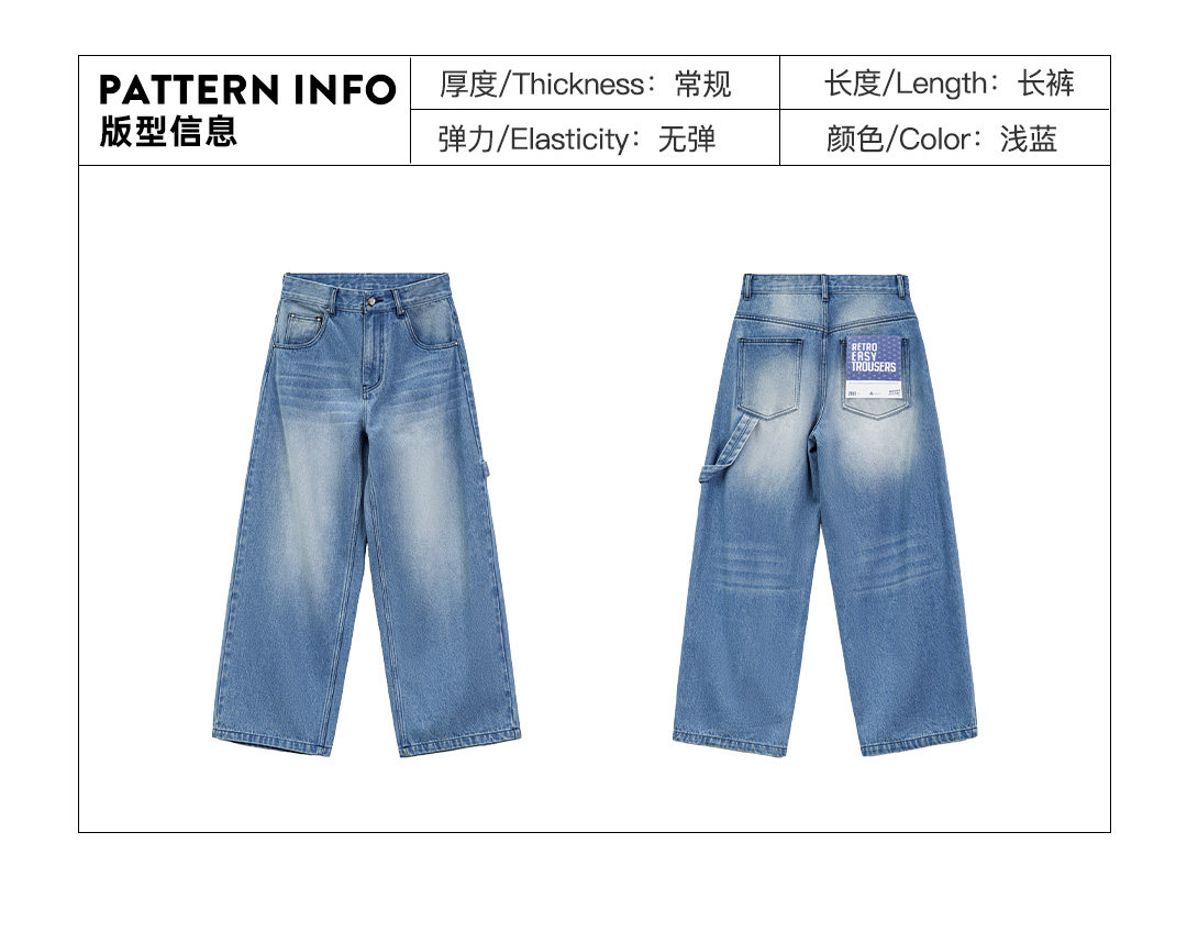 马登浅蓝色美式复古水洗做旧宽松阔腿直筒牛仔裤拖地长裤子女士春