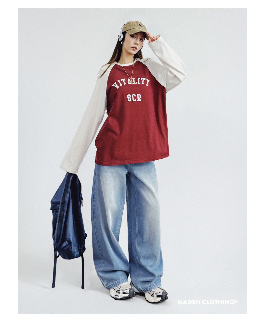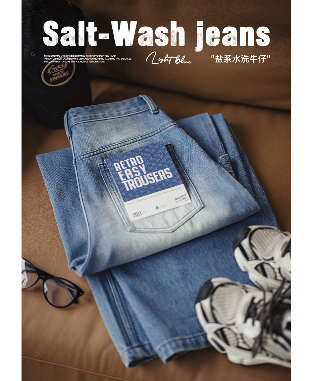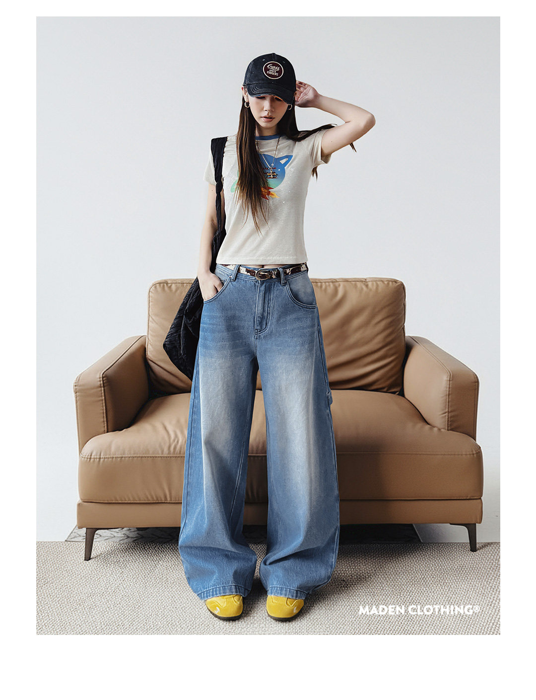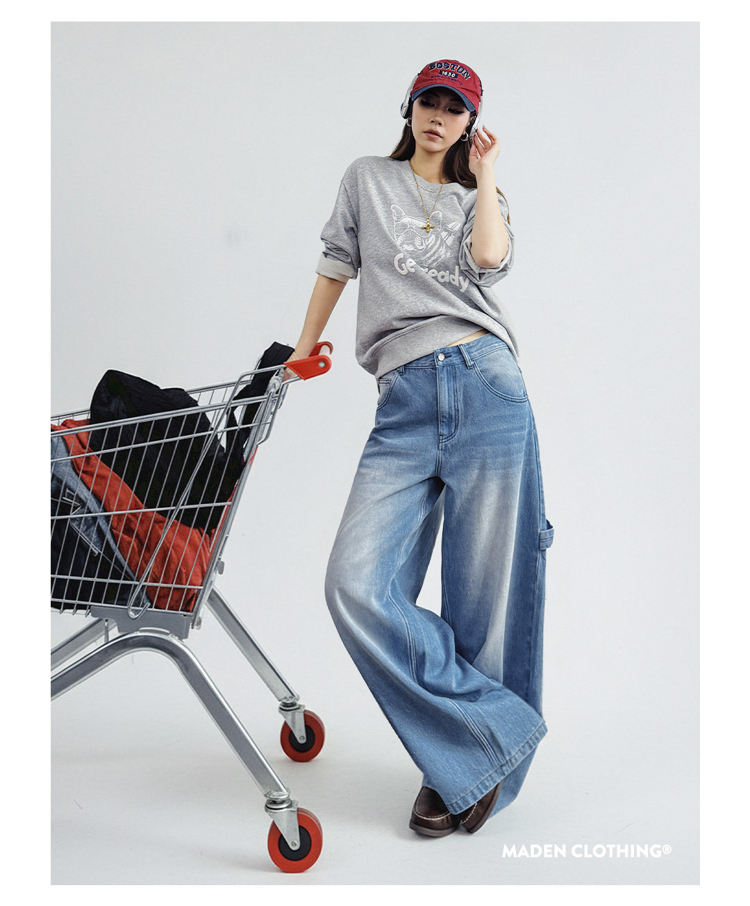 马登浅蓝色美式复古水洗做旧宽松阔腿直筒牛仔裤拖地长裤子女士春