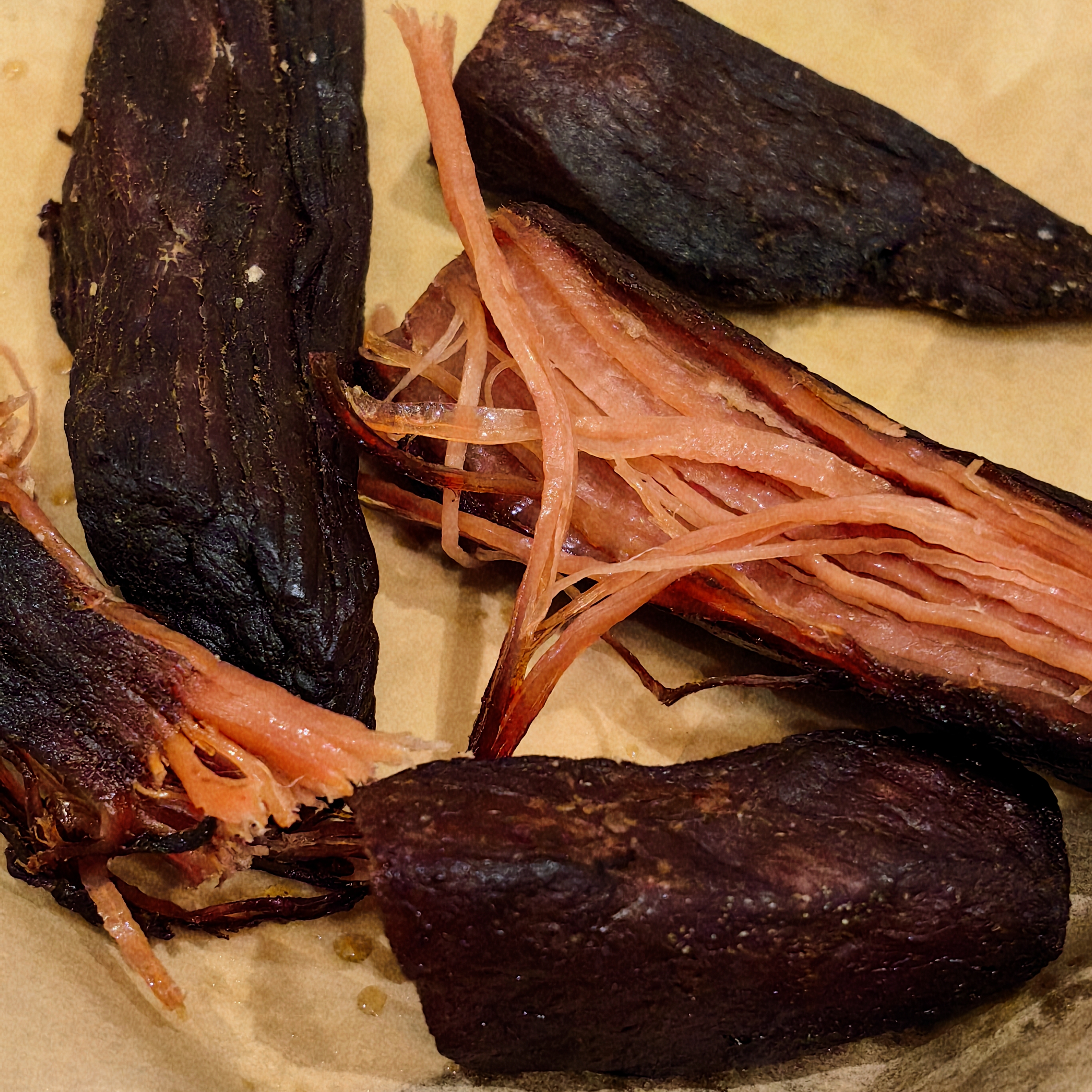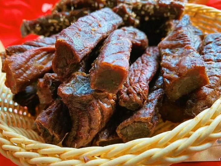 每头黄牛仅挑选后腿肉来进行制作,其肉质鲜嫩之余,也相当入味,是牛肉中的黄金肉。三斤生牛肉仅能制作一斤风干碳烤牛肉