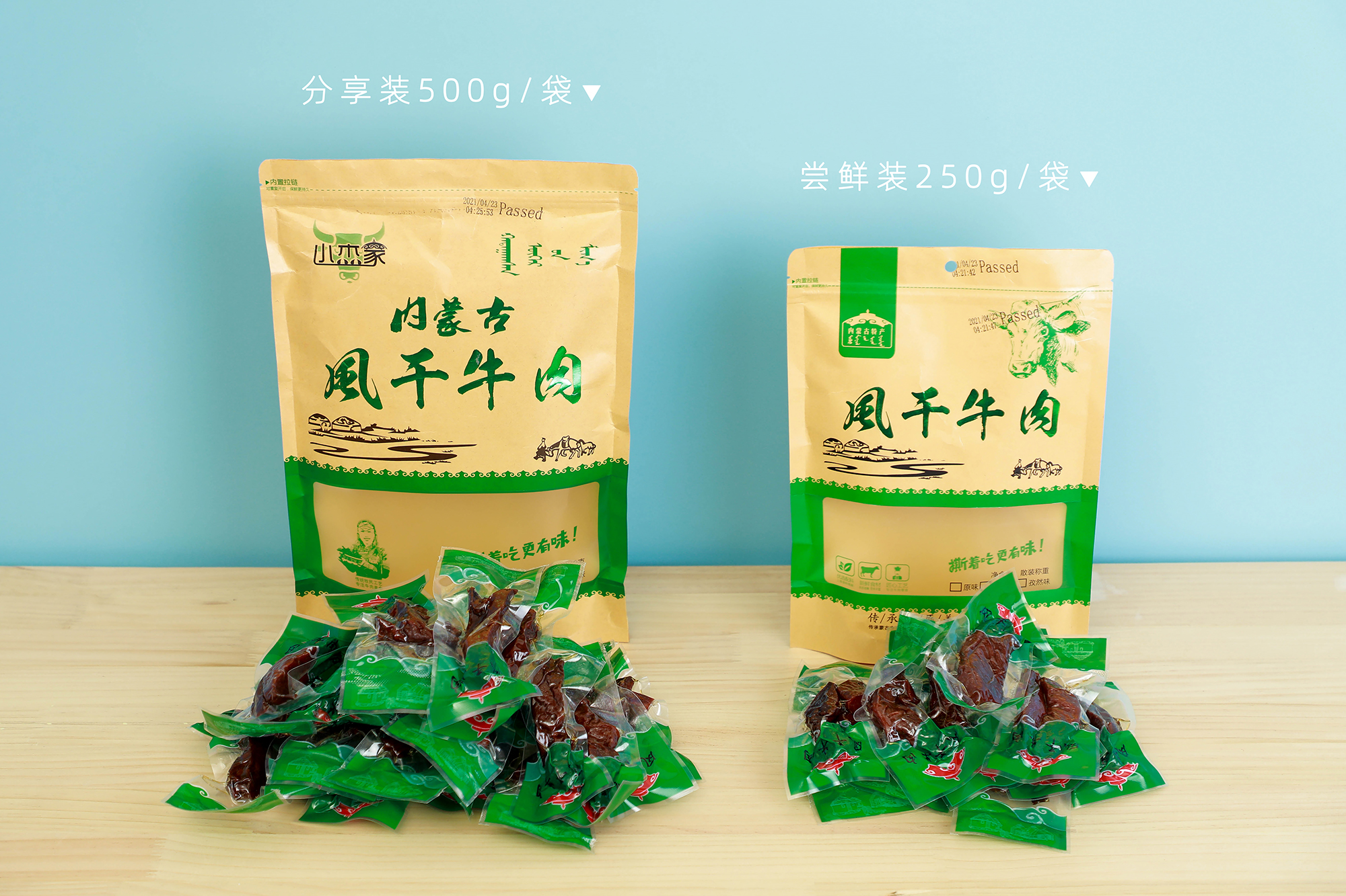 一袋是500g,因为牛肉条大小不同,所以小包装是在18-20根不等。牛肉干每天都烤制,所以发出的日期都很新鲜,也因为没有防腐剂,所以收到切记一定要放冰箱,这样是可以放很久的!跟TB、豆印上那些用鸭肉混充牛肉卖的真的不一样,贵有贵的道理,牛肉本身就一点都不便宜,一吃你们就知道区别了,可以去对比。