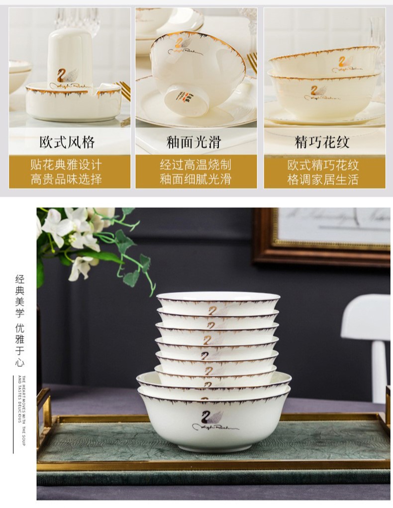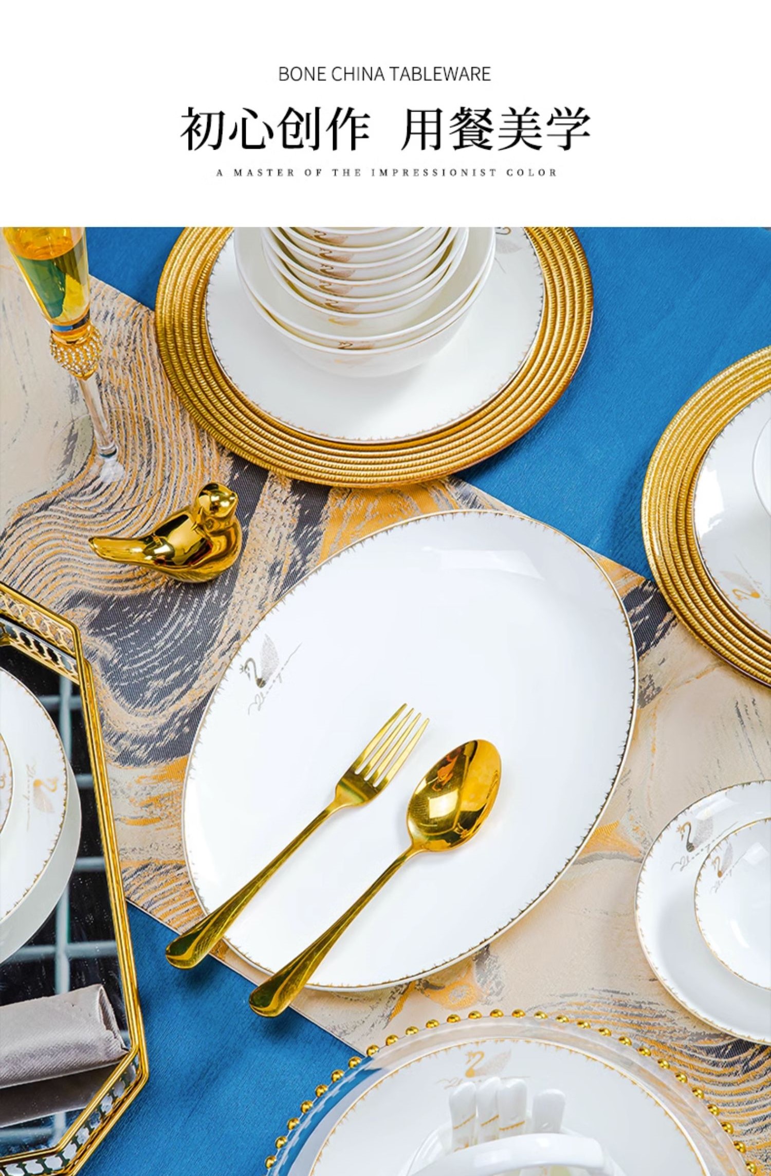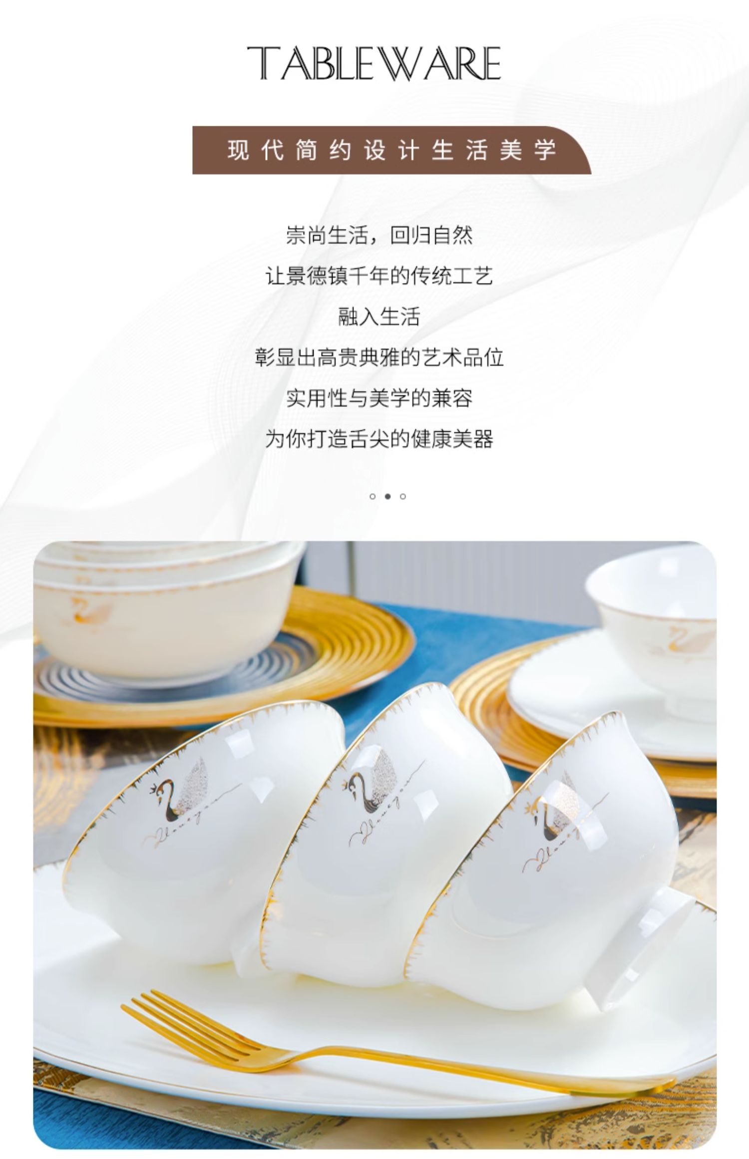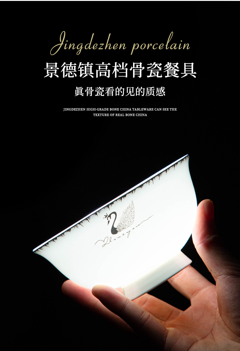 景德镇骨瓷餐具38件套-北欧风天鹅一号(38件套:九斗汤碗1;8英寸平盘2;8寸深盘4;高脚碗6;大勺1;小勺6;味碟6;合金筷子10;烟灰缸1;牙签筒1)