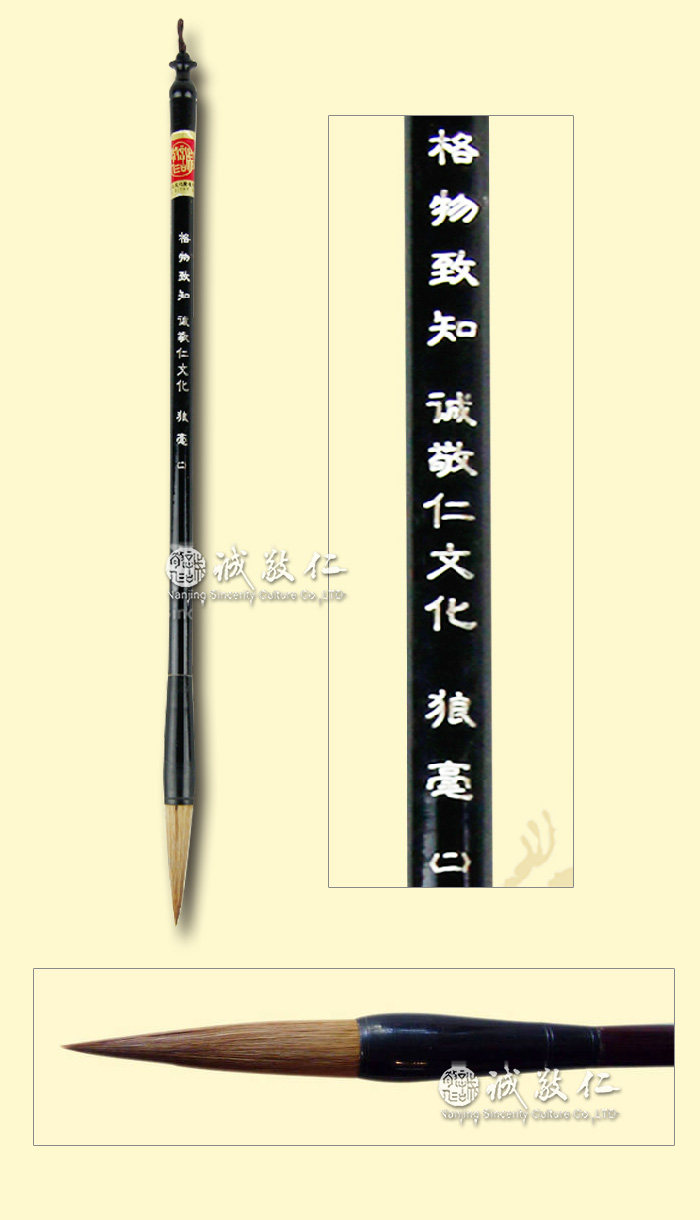 【基本信息】 产品材质:竹+狼毫 狼毫,毛笔的一种,用黄鼠狼(鼬鼠)毛制成,故名。特点是润滑而富有弹性,宜书宜画,以画为主。梁同书《笔史·狼毫》:“笔有丰狐、蟓蛉、龙筋、虎仆及猩猩毛、狼豪(毫)。”狼毫其力介乎羊毫、紫毫之间。质较脆,不耐摩擦。狼毫的吸水量大,较硬,容易掌握。 产品规格: 笔杆长22.6cm,笔毛长4.2cm 产品价格: 零售价:18元 【产品文化】 笔 最早的毛笔,大约可追溯到二千多年之前。西周以上虽然迄今尚未见有毛笔的实物,但从史前的彩陶花纹、商代的甲骨文等上可觅到些许用笔的迹象。东周的竹木简、缣帛上已广泛使用毛笔来书写。湖北省随州市擂鼓墩曾侯乙墓发现了春秋时期的毛笔,是目前发现最早的笔。其后,湖南省长沙市左家公山出土的战国笔,湖北省云梦县睡虎地、甘肃省天水市放马滩出土的秦笔,及长沙马王堆、湖北省江陵县凤凰山、甘肃省武威市、敦煌市悬泉置和马圈湾、内蒙古自治区古居延地区的汉笔,武威的西晋笔等都是上古时代遗存的不可多得的宝贵资料。 古笔的品种较多,从笔毫的原料上来分,就曾有兔毛、白羊毛、青羊毛、黄羊毛、羊须、马毛、鹿毛、麝毛、獾毛、狸毛、貂鼠毛、鼠须、鼠尾、虎毛、狼尾、狐毛、獭毛、猩猩毛、鹅毛、鸭毛、鸡毛、雉毛、猪毛、胎发、人须、茅草等。从性能上分,则有硬毫、软毫、兼毫。从笔管的质地来分,又有水竹、鸡毛竹、斑竹、棕竹、紫擅木、鸡翅木、檀香木、楠木、花梨木、况香木、雕漆、绿沉漆、螺细、象牙、犀角、牛角、麟角、玳瑁、玉、水晶、琉璃、金、银、瓷等,不少属珍贵的材料。 |
