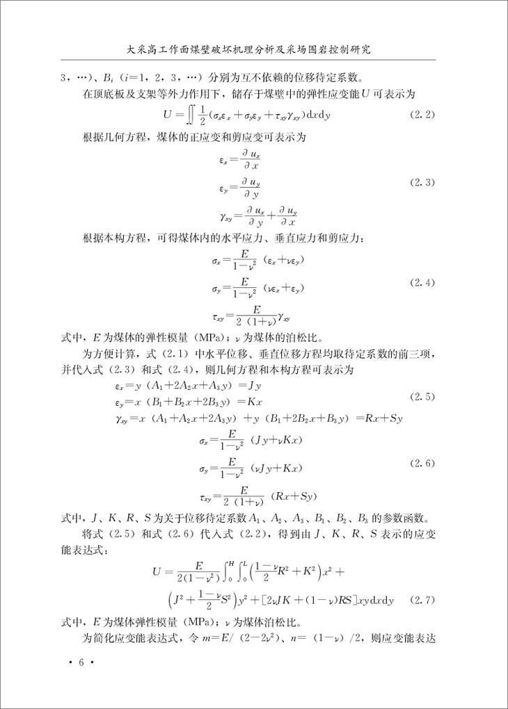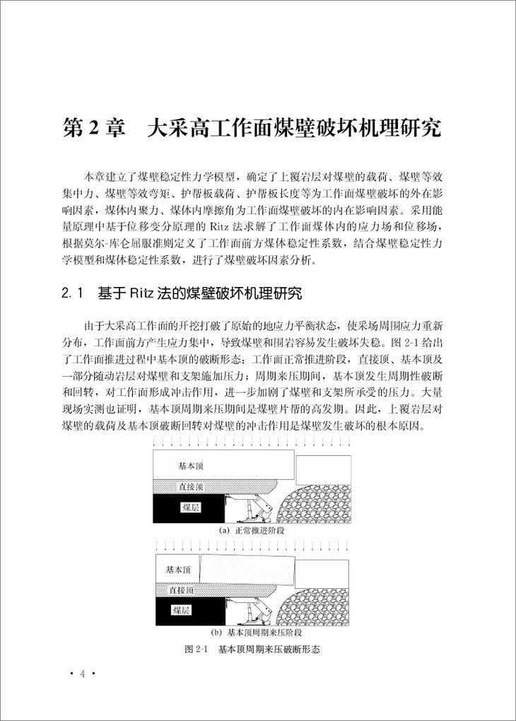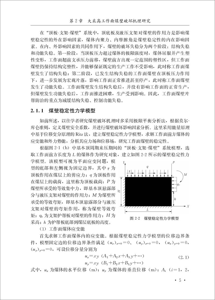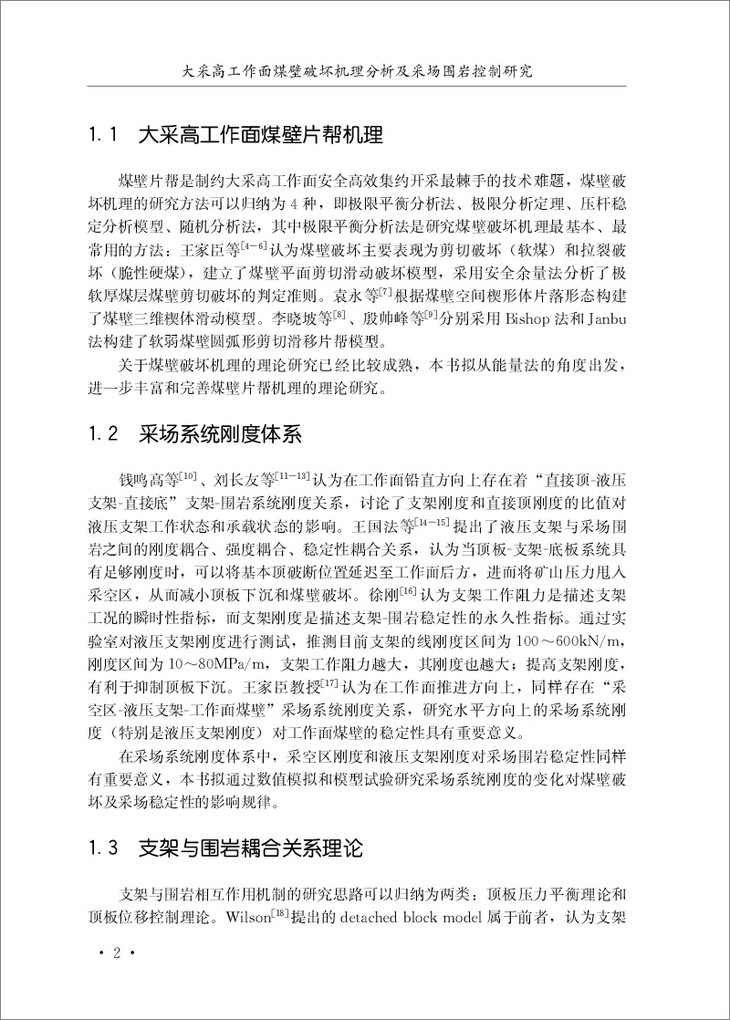 基于以上实践问题及其工程意义,笔者开展了理论分析、数值模拟、相似模拟、现场实践等研究工作,以期从能量法的角度进一步丰富煤壁片帮机理的理论研究,从采场系统刚度理论体系进一步完善煤壁片帮影响因素的敏感度分析,从伸缩式两级液压缸立柱的活动规律进一步阐述支架与围岩收敛变形的耦合关系,从采场围岩稳定性三维模型试验进一步揭示“顶板支架煤壁”协调变形机制。笔者在王家臣教授的指导下和采矿与岩石开挖实验室师兄弟的帮助下完成本著作,将这本著作呈现给读者,以期读者能加深对煤壁破坏机理及支架围岩耦合关系的认识,为采场围岩控制提供有益帮助。