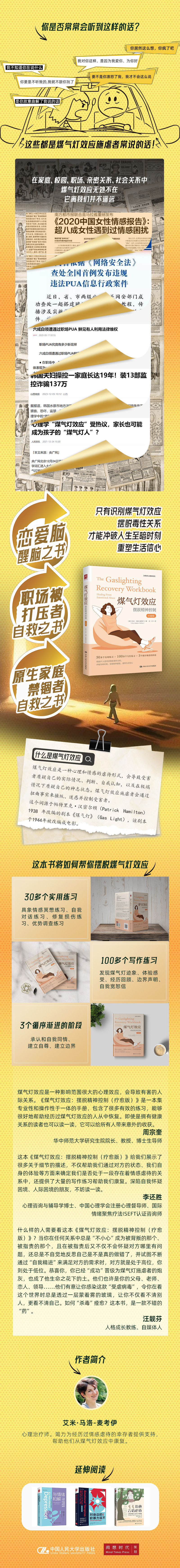 很多心理咨询师和我一样,通过咨询、讲座、视频等方式为人们提供帮助和科普,教大家如何反 PUA、如何设立边界、如何自我关怀,以及如何识别被精神控制等。像艾米·马洛 - 麦考伊这样,通过一本书来系统而全面地对煤气灯效应进行讲解,实属难能可贵。