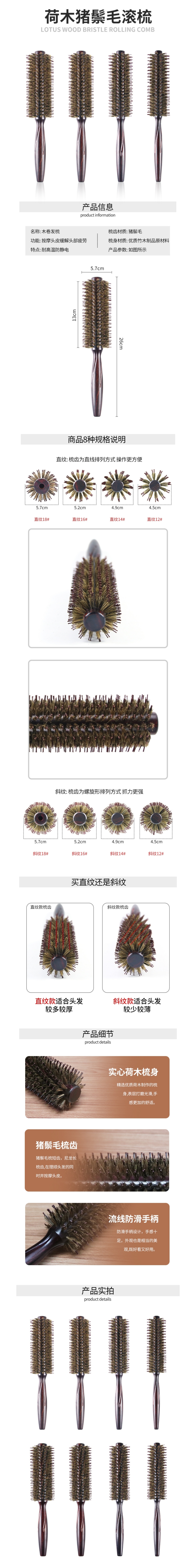 猪鬃毛卷发梳 荷木造型毛滚梳美发顺发圆筒滚梳木卷发梳