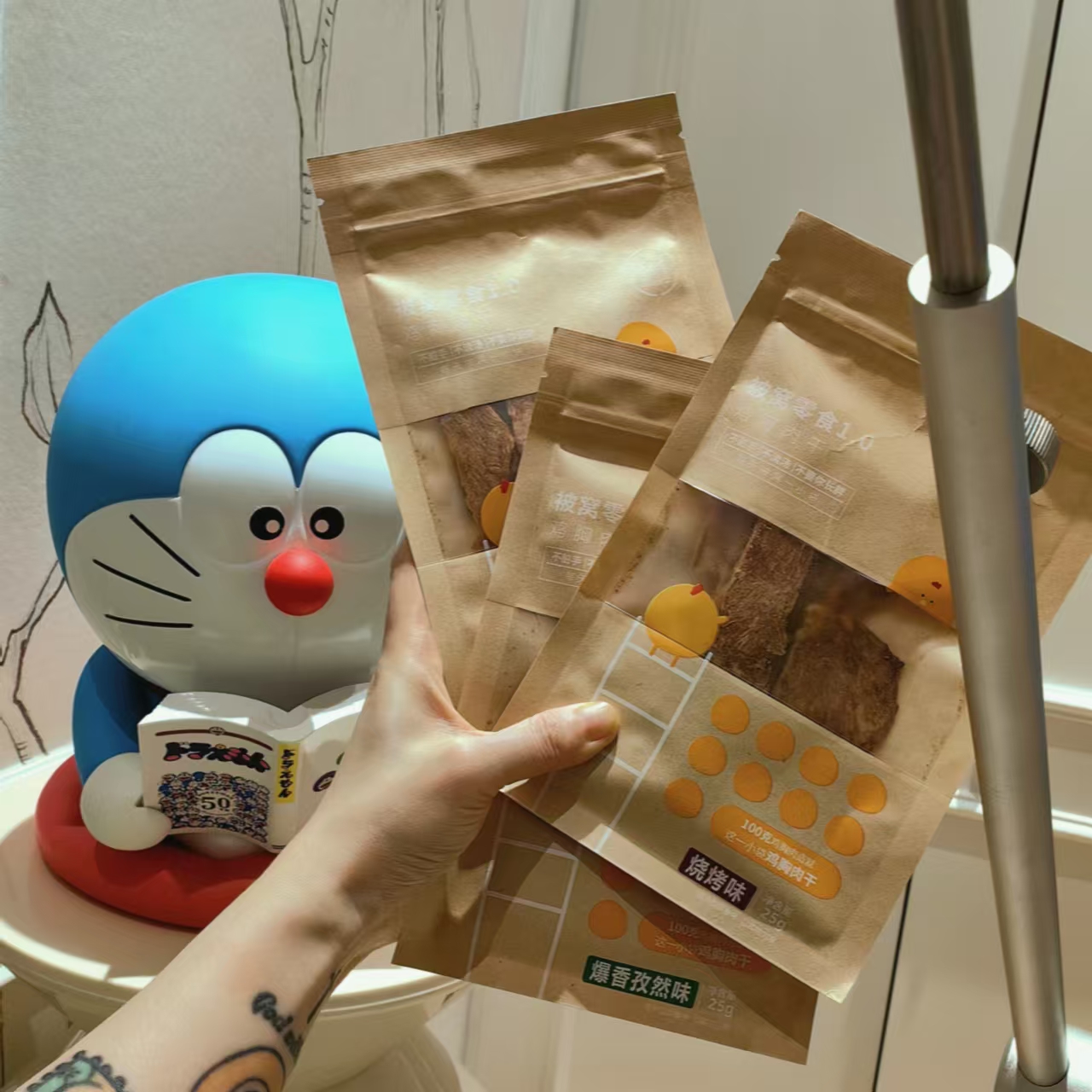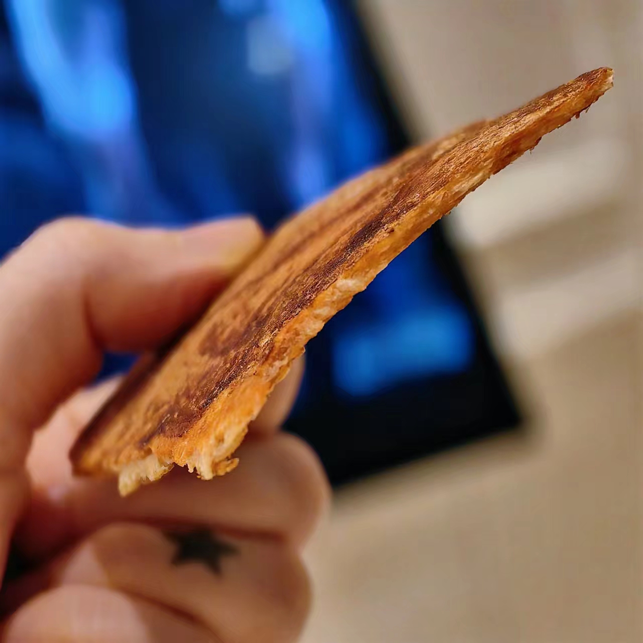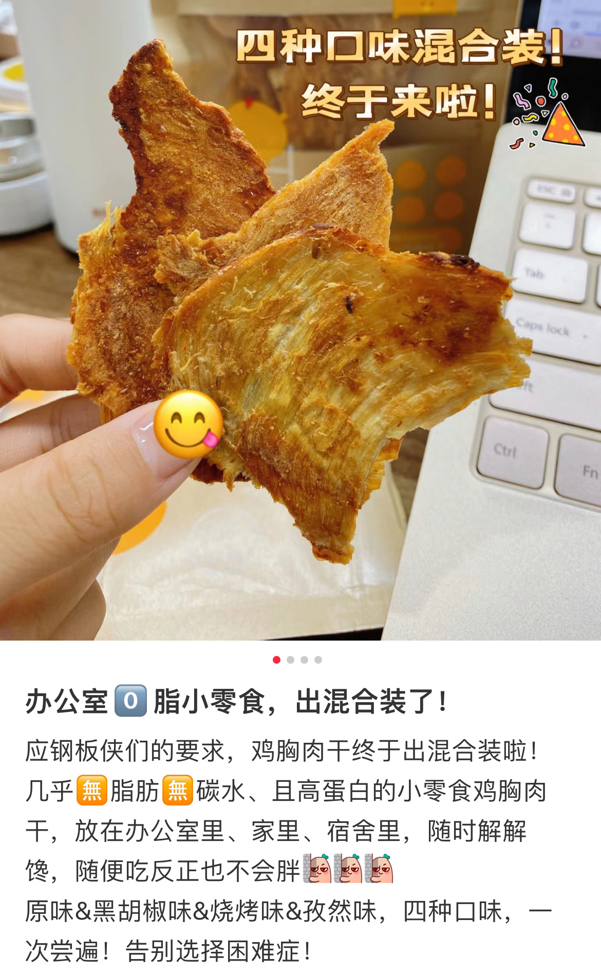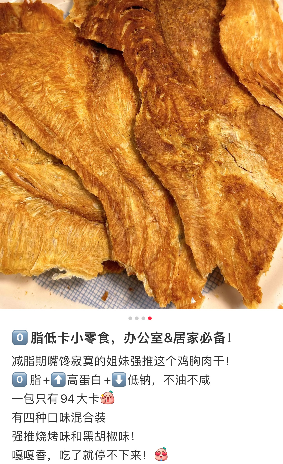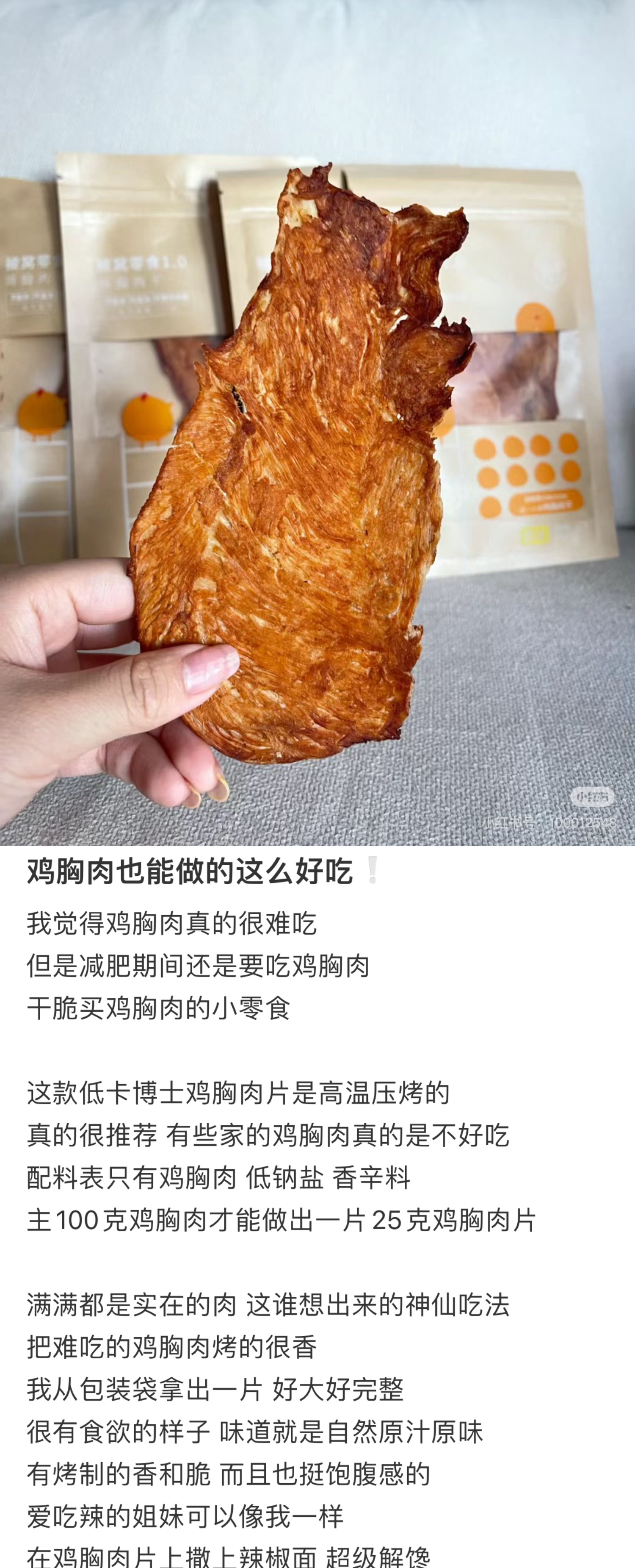 低卡博士鸡胸肉干,有孜然、黑胡椒、烧烤、原味四个口味可选,一包25g,解解馋刚刚好!薄薄的肉干,酥脆可口,像是薯片,但更有肉味,越嚼越上头!原味肉香浓郁,黑胡椒就带一丝辛辣,孜然更是有独特的辛香,我自己是比较爱烧烤口味,有点点烟熏味,恰到好处地提升了鸡肉的层次感,都好吃!上新有好价,四袋19.8元,减脂控卡的老粉们可以吃吃!