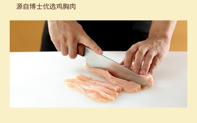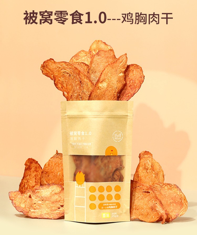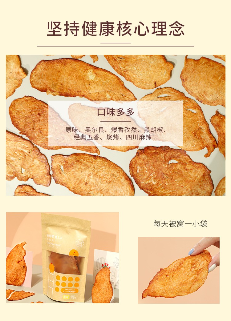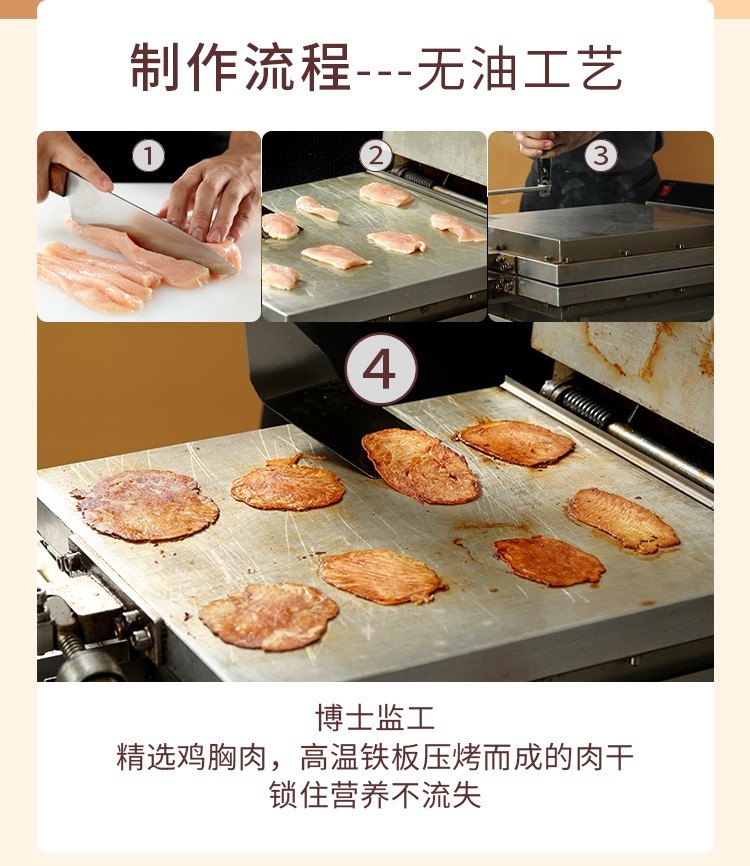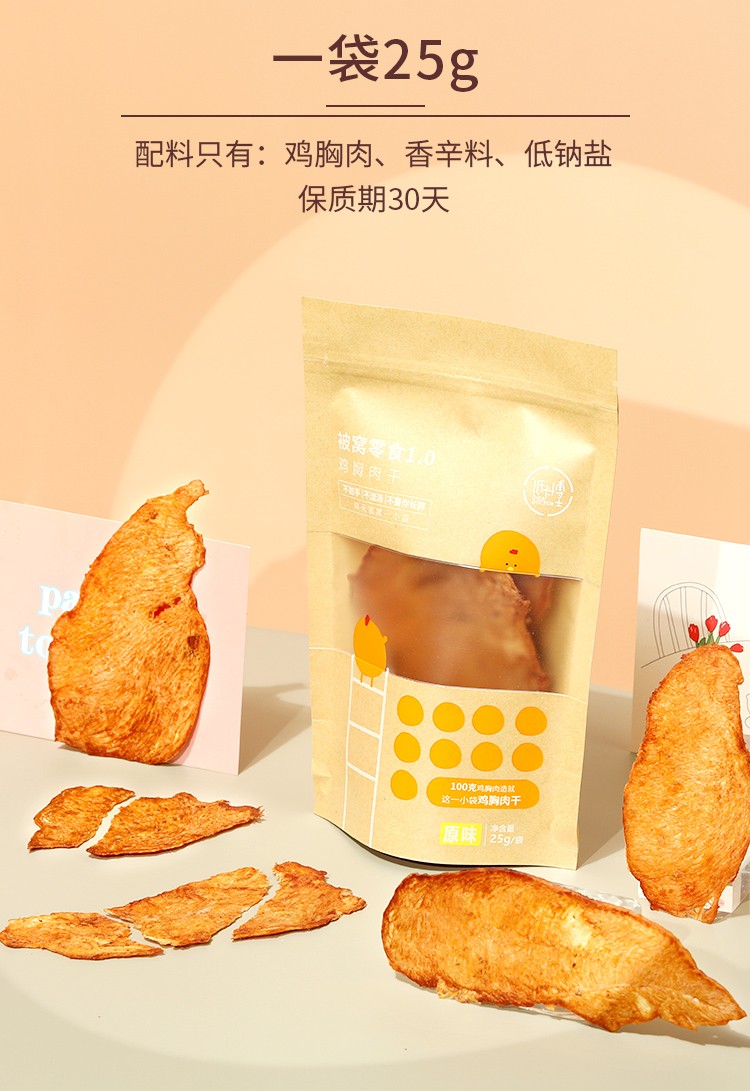 鸡胸肉干,用的是肉肉都精挑细选,25克一小袋,其实是有100克鸡胸肉哦!用高温铁板压烤工艺后,不仅无油健康低脂,更完美锁住肉肉的营养,基本都是蛋白质啦!配料表也是简洁明了,无油无糖,仅含香辛料与低钠盐,清新口感,不油不腻!