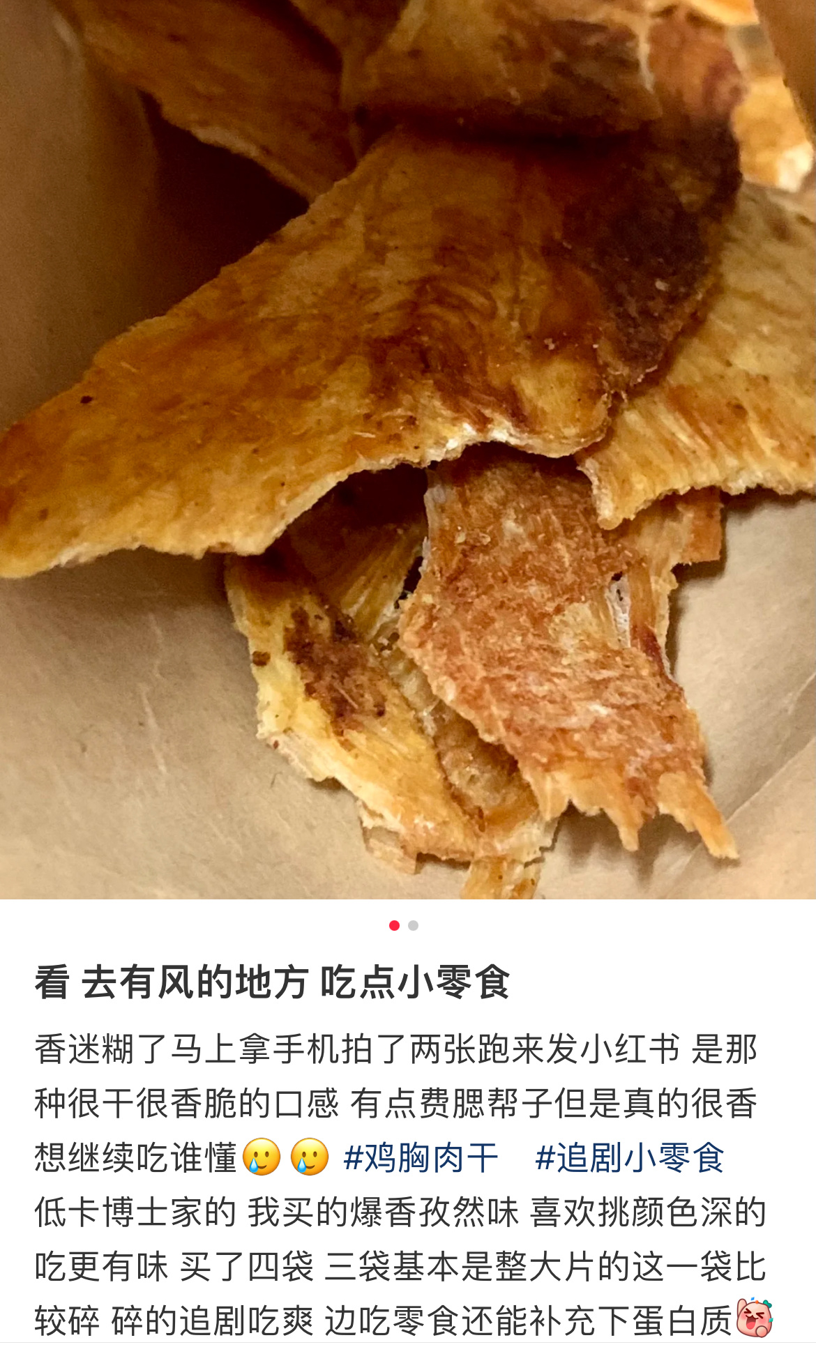 这个,低卡博士的鸡胸肉干,对于减脂人来说,是非常不错的被窝零食,练后,小加餐,或睡觉前有点小饿,都可以拆一袋,细嚼慢咽下味道还是不错的,酥脆,咸香,尤其的烧烤味,我个人比较喜欢,但和普通零食比,肯定就差一点了,毕竟低脂低卡,适合想吃又怕胖的老粉!