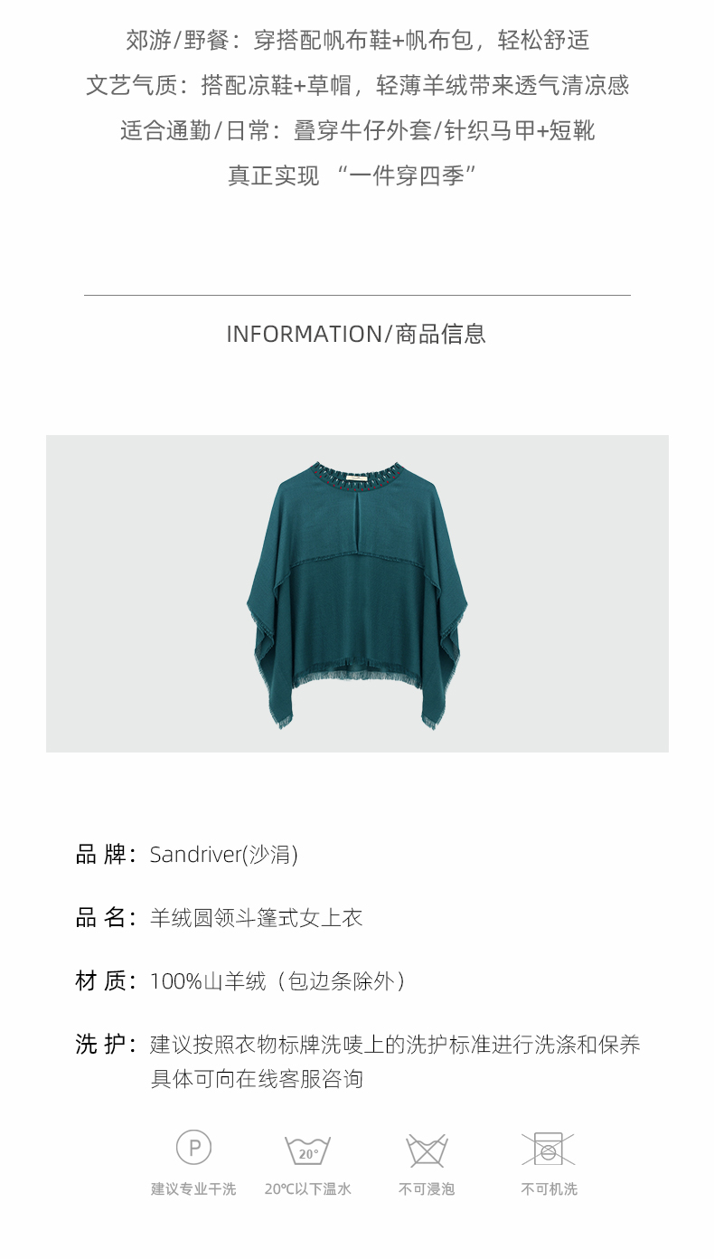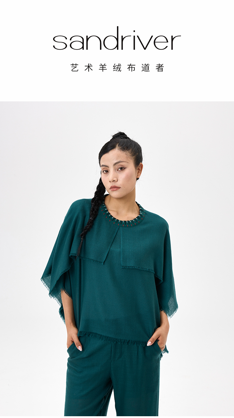历年在巴黎时装周亮相,享誉世界的艺术羊绒品牌[Sandriver 沙涓]由羊绒布道者郭秀玲女士创立。阿拉善自有牧场纯种羔羊绒,日本国宝设计师小筱顺子,上海自有基地精工细作。承载羊绒情怀,坚持匠人品质。