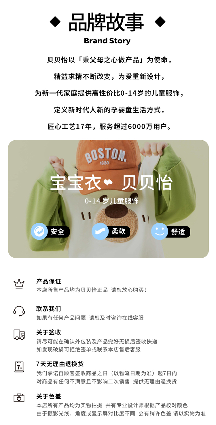 - 贝贝怡专注0-6岁婴幼儿服饰,坚持安全、柔软、舒适的产品理念,为千万中国家庭提供超高品质、安全可靠的婴幼儿服饰产品,妈妈放心,宝宝开心!