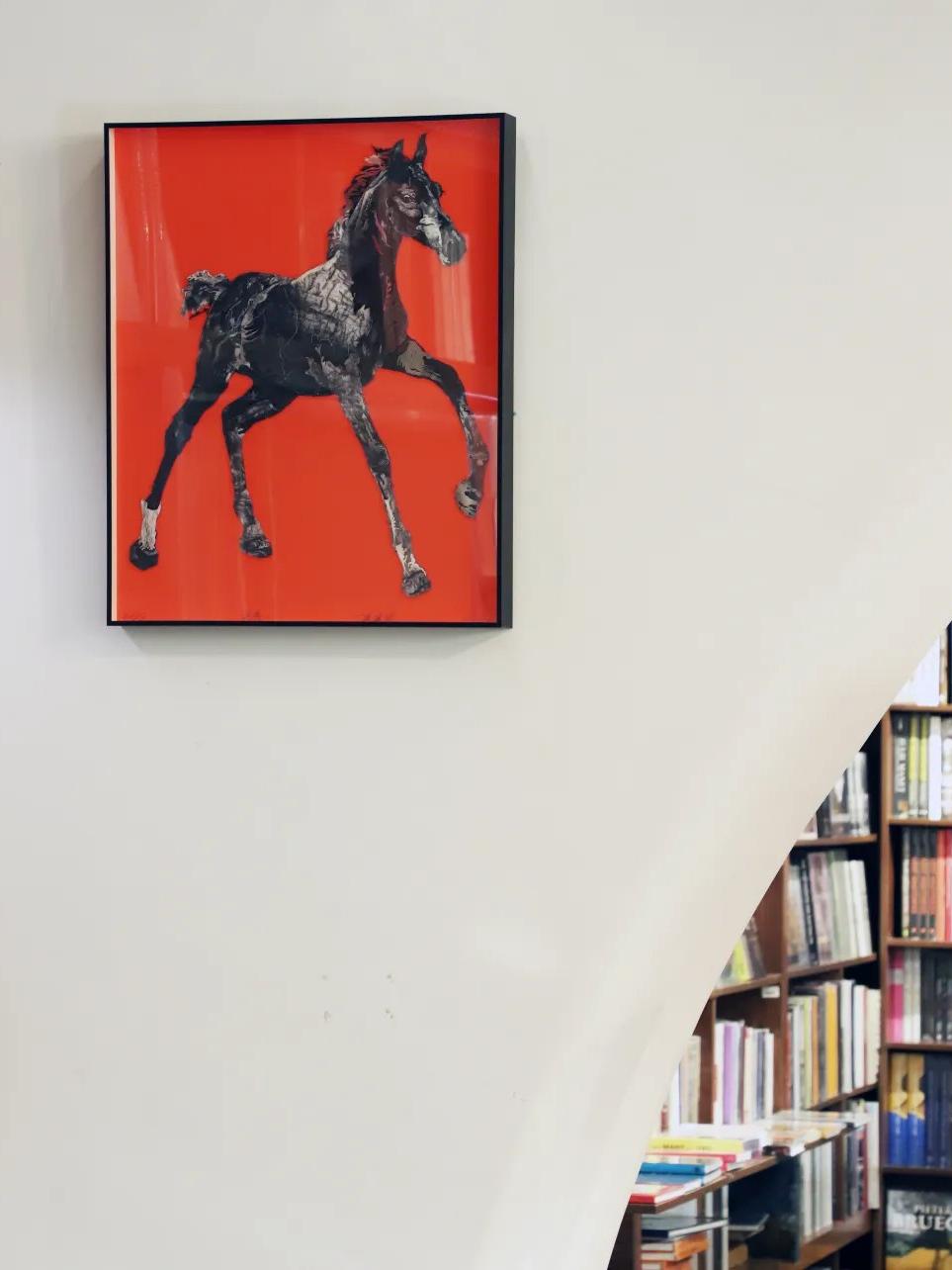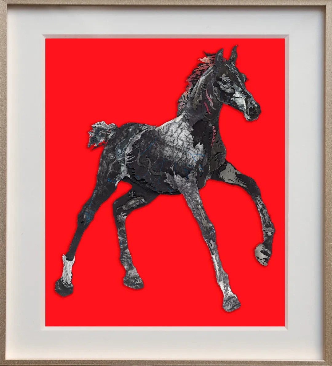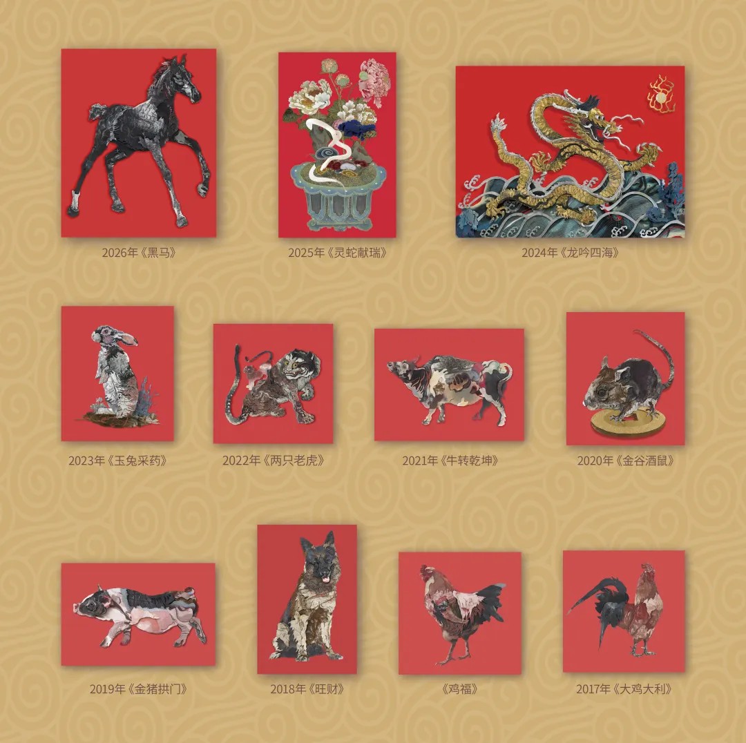在丙午马年的作品中,马静静立于画面中央。它没有鞍辔,也不依托山水场景,只被一片浓烈的红色包围。由碎片拼合的身体显得凝缩而未完成,仿佛仍处在生成之中。这并非奔腾或成功的姿态,而是一种尚未被指向结果的状态:关于潜能、关于未定的去向,也关于生命在被驯服之前所保有的原初力量。