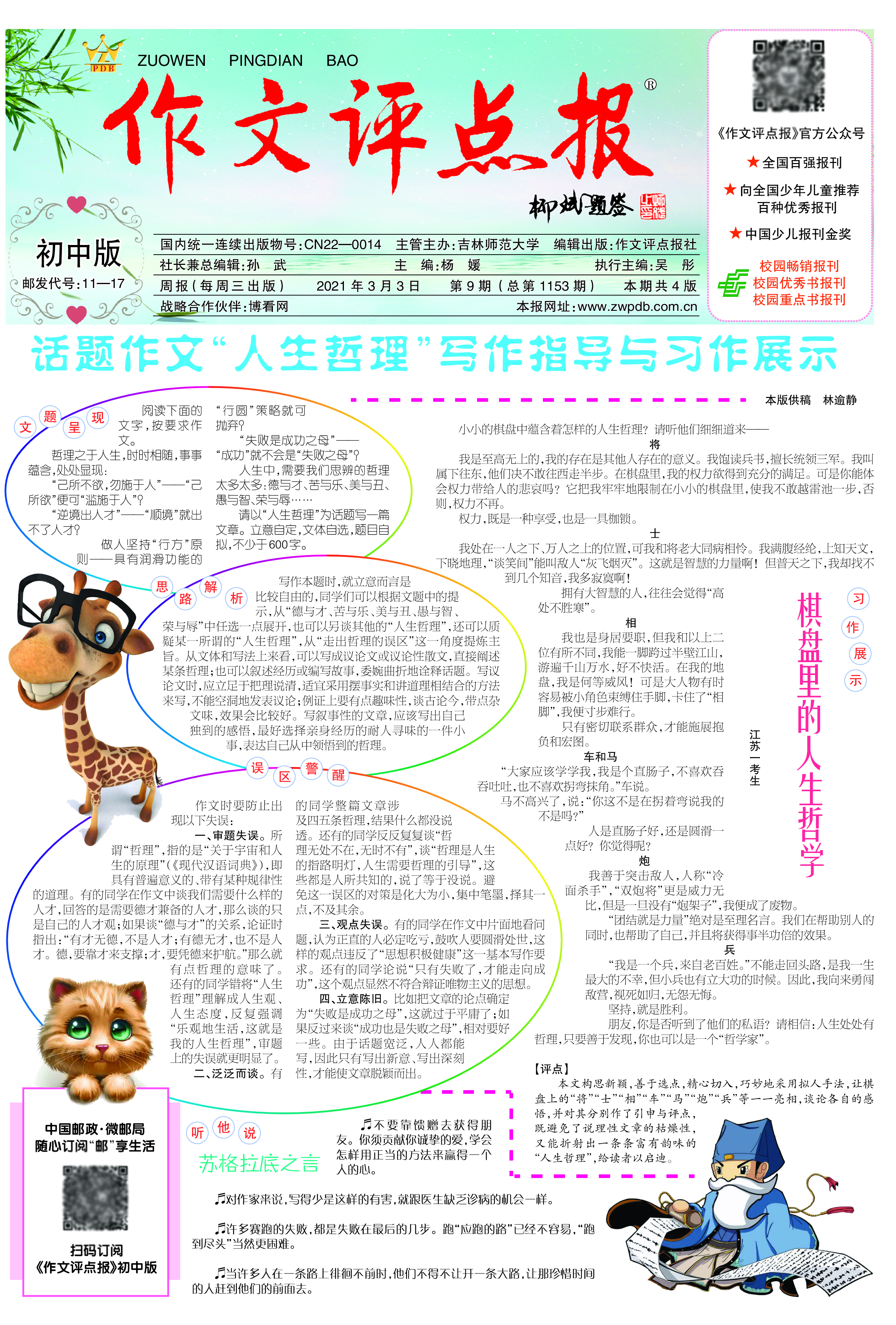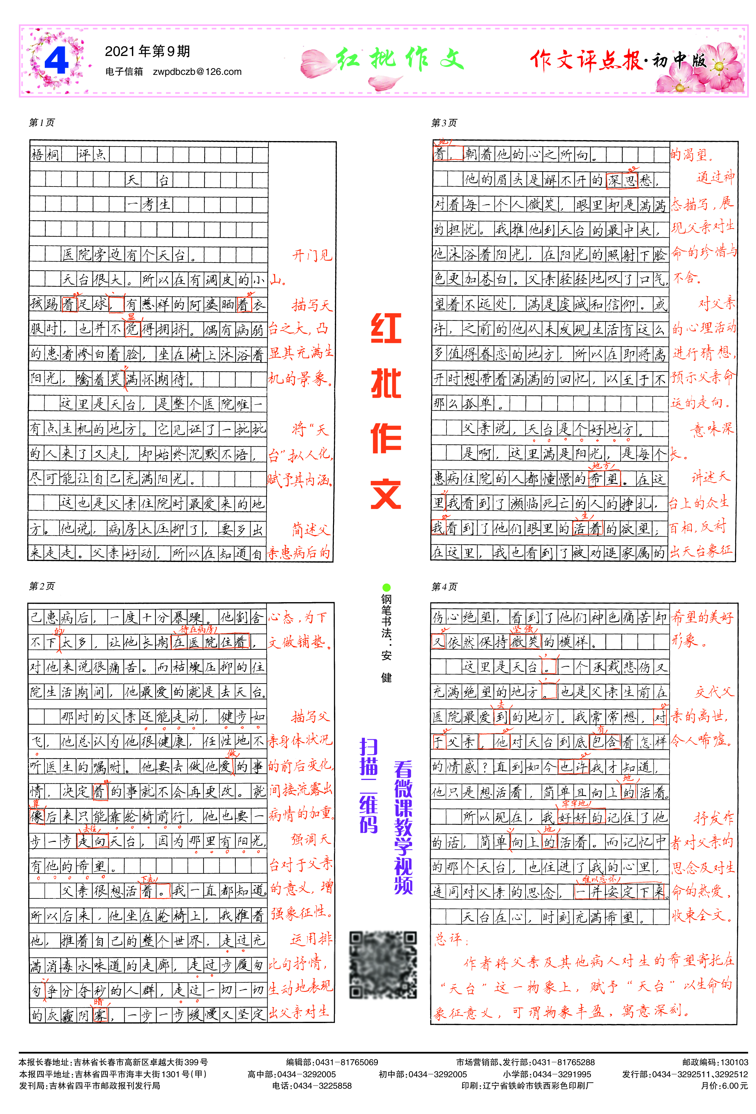 三、增值服务。订阅《作文评点报》,每月可获赠“作文支招”微课、作文素材包或中考、高考考前押题卷等,扫码获取。