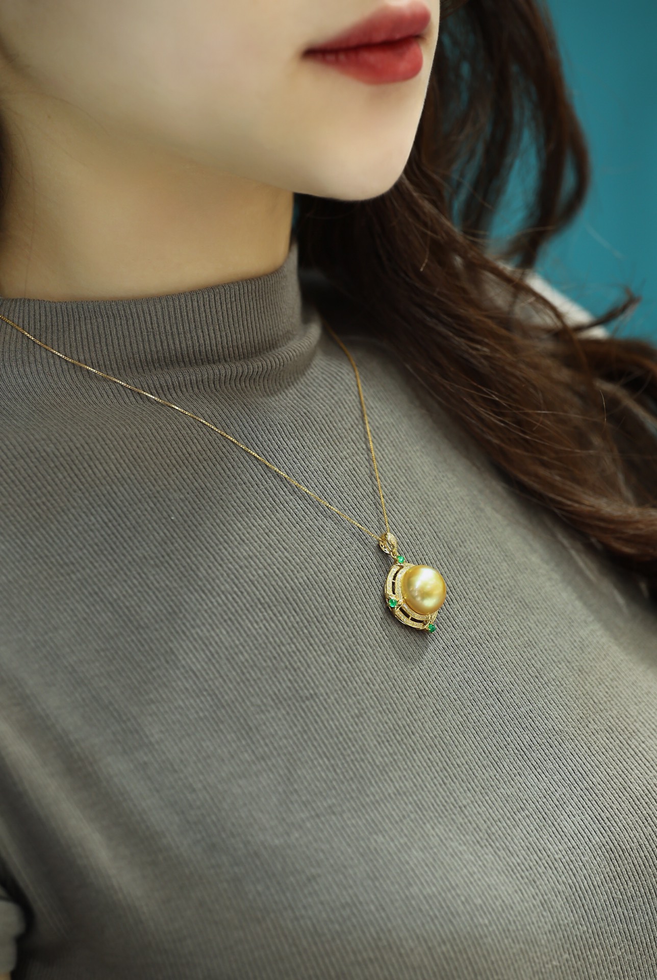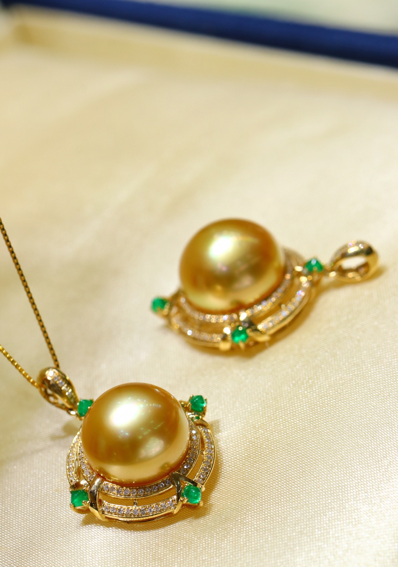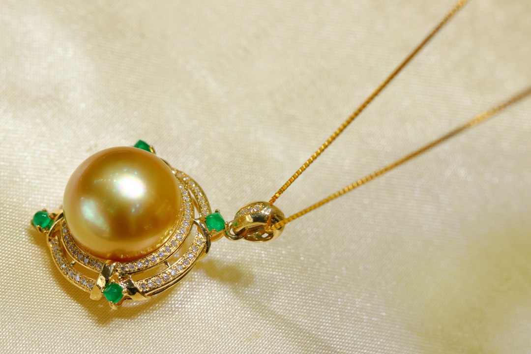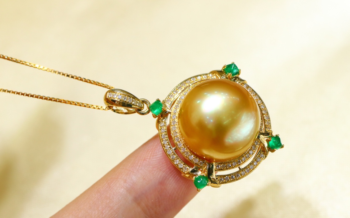 487011 18K南洋金珠吊坠 简洁大气的款式,14-15mm的尺寸,厚面包珠珠镶嵌,正面正圆强光浓金极微瑕,珠光颜色都超级美的,18k金镶嵌天然钻石💎搭配糖塔祖母绿, 超值价💰5780/一个