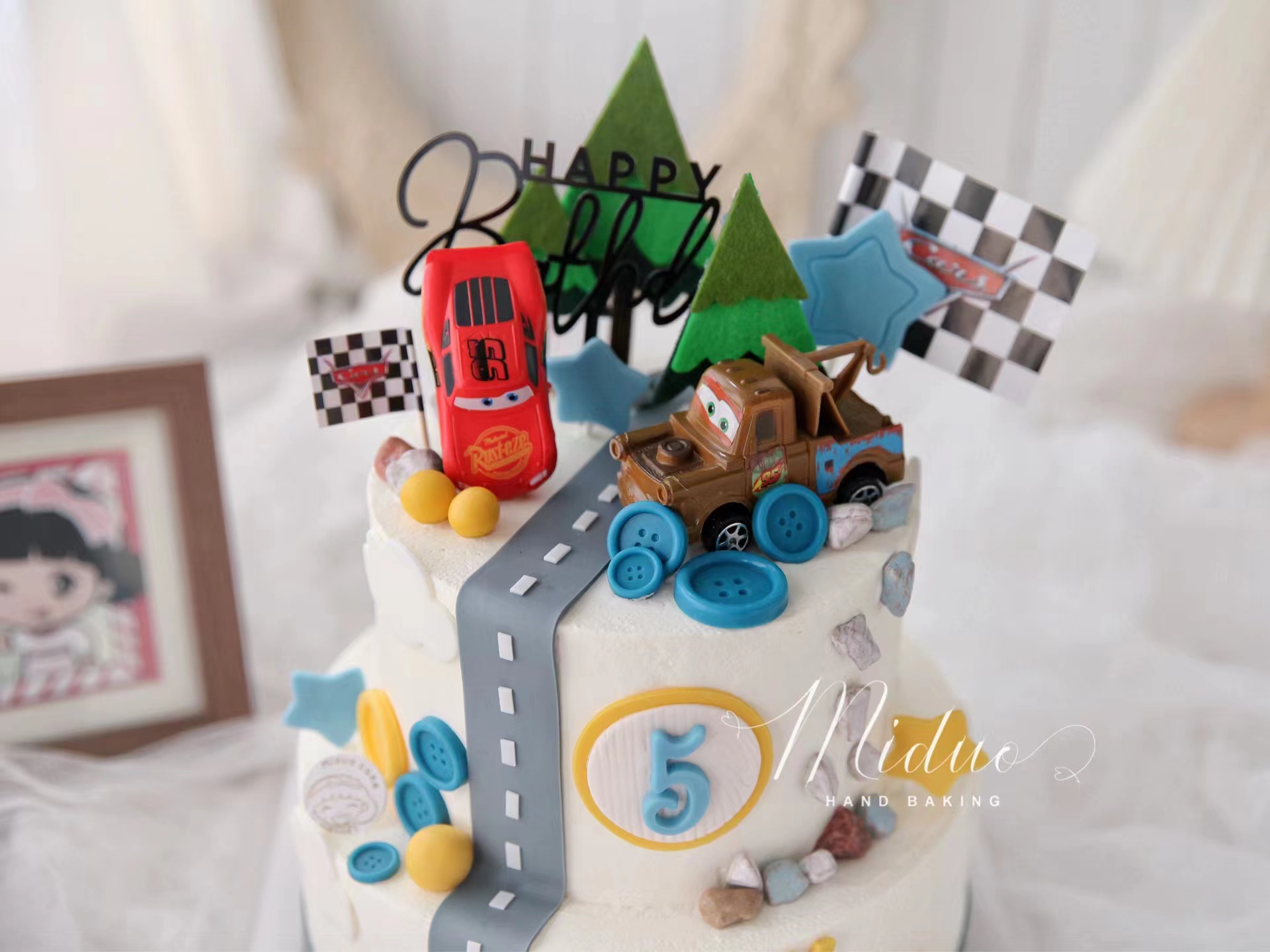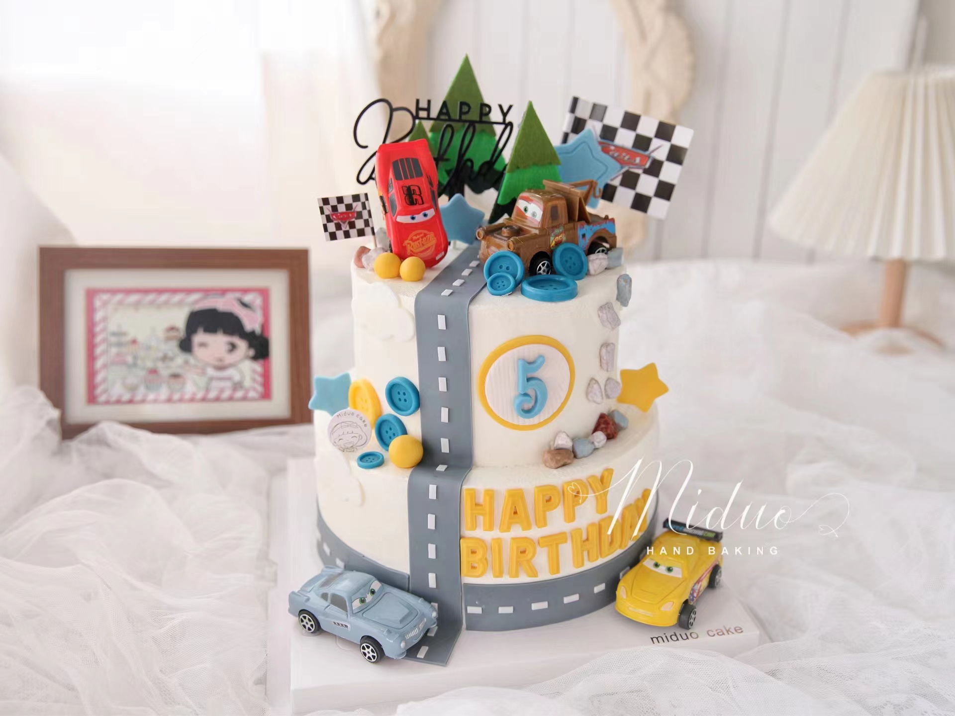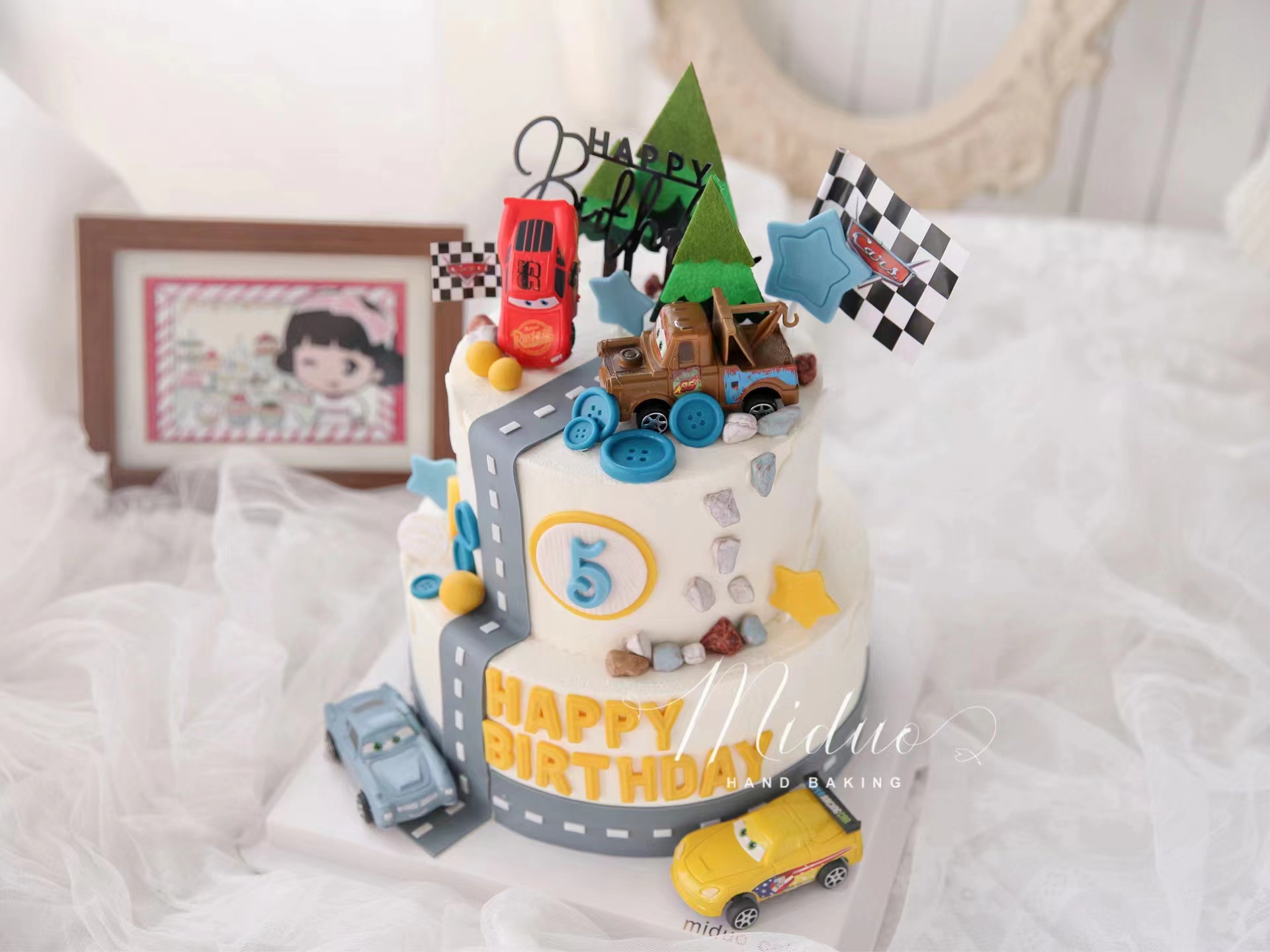 男孩款 麦昆 公路 卡通小汽车 糖牌 翻糖 周岁 双层蛋糕