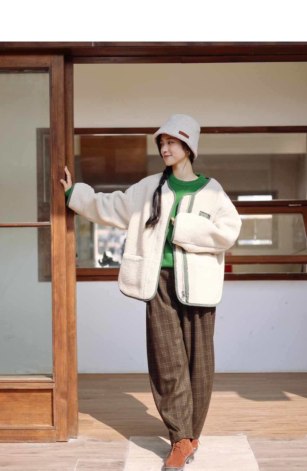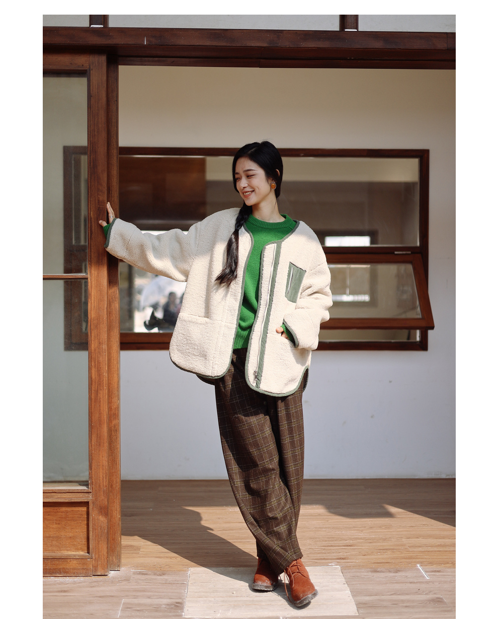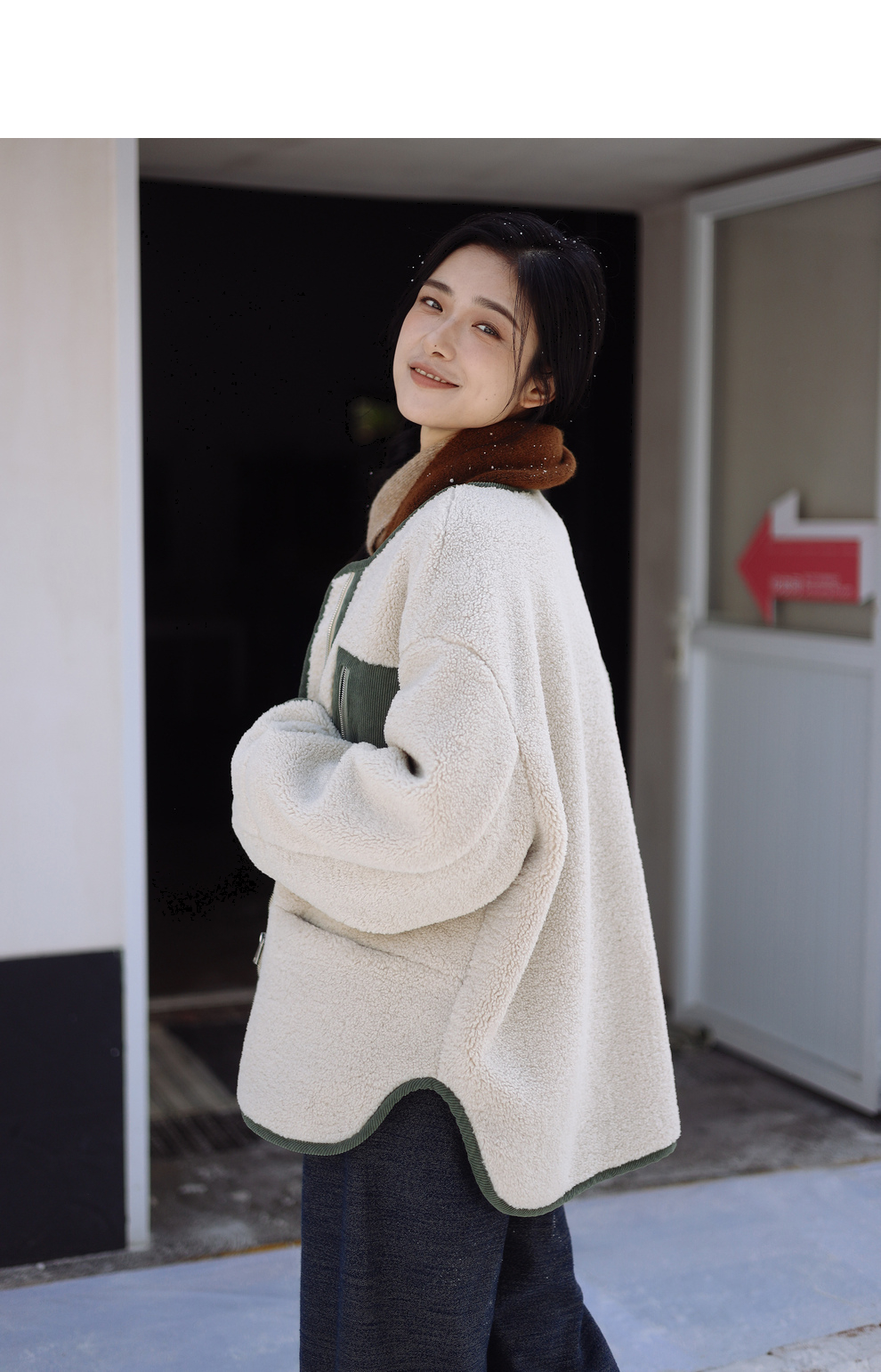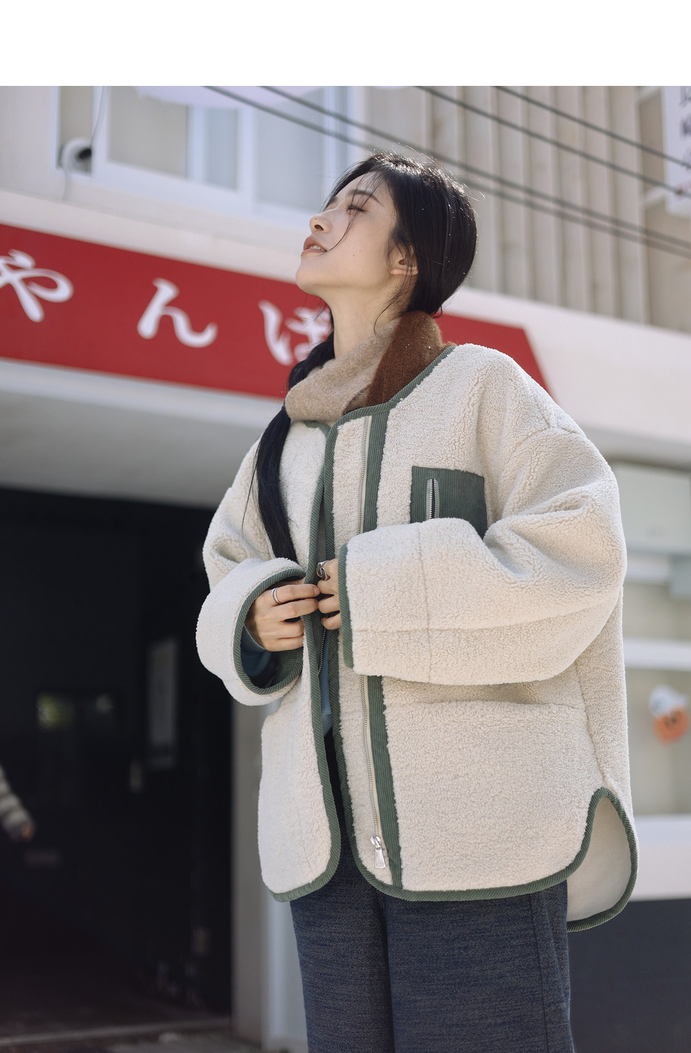 绽放981朵/杏仁色宽松复古文艺无领灯芯绒撞色包边拼接外套