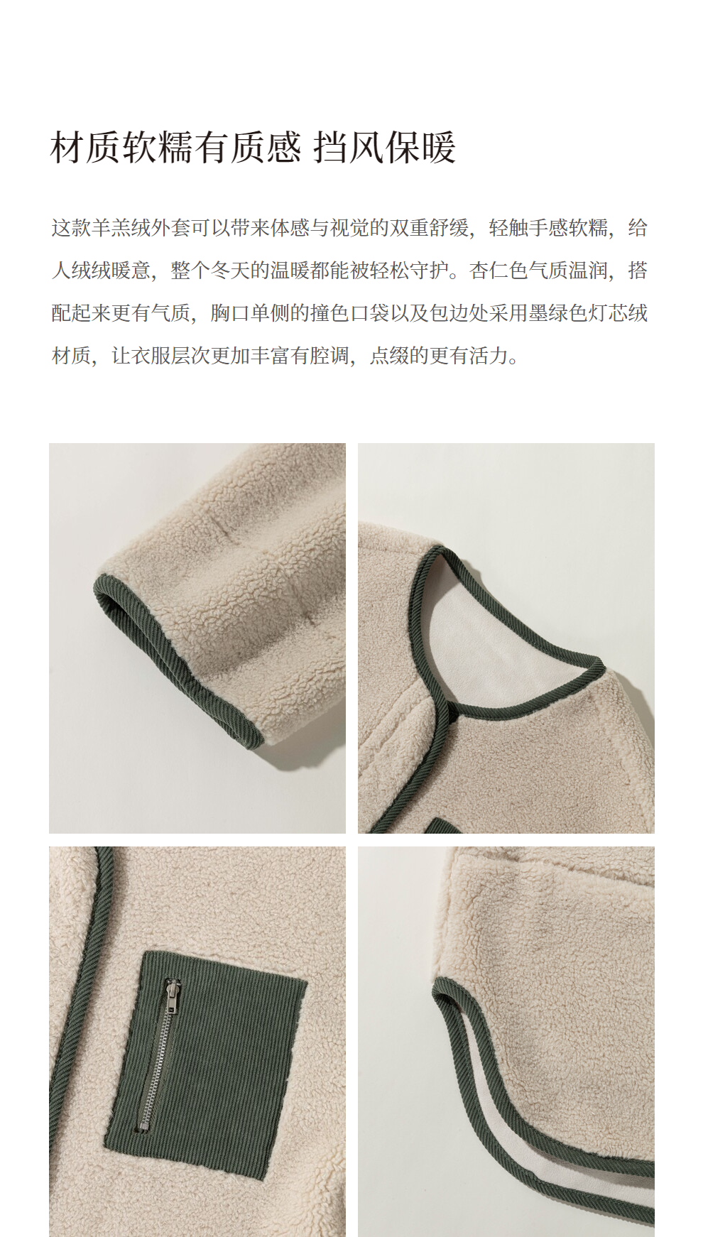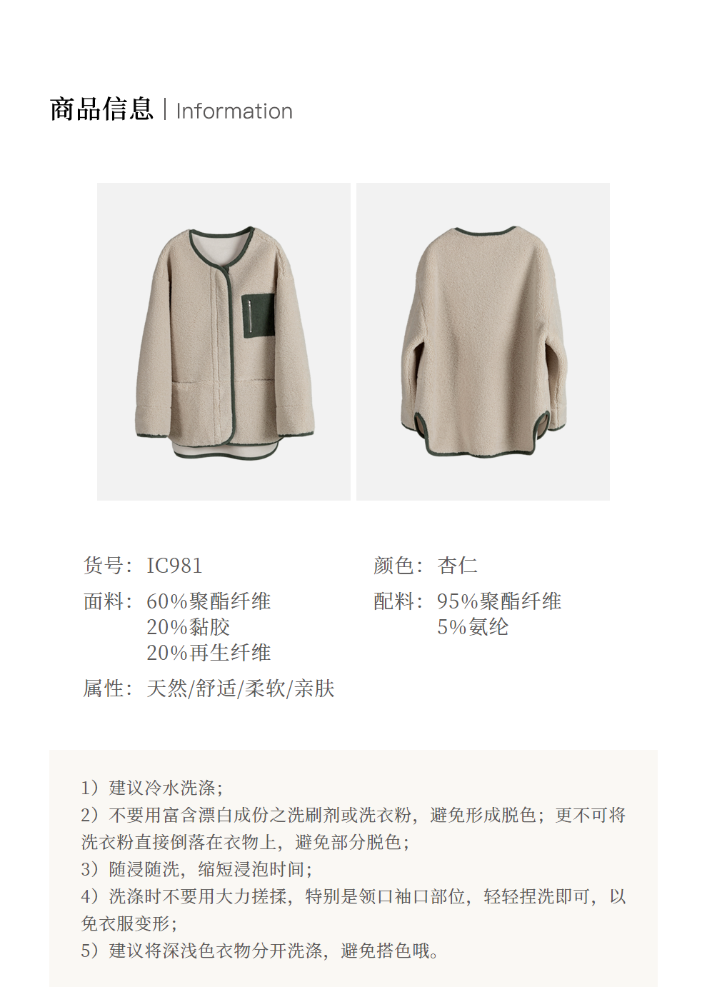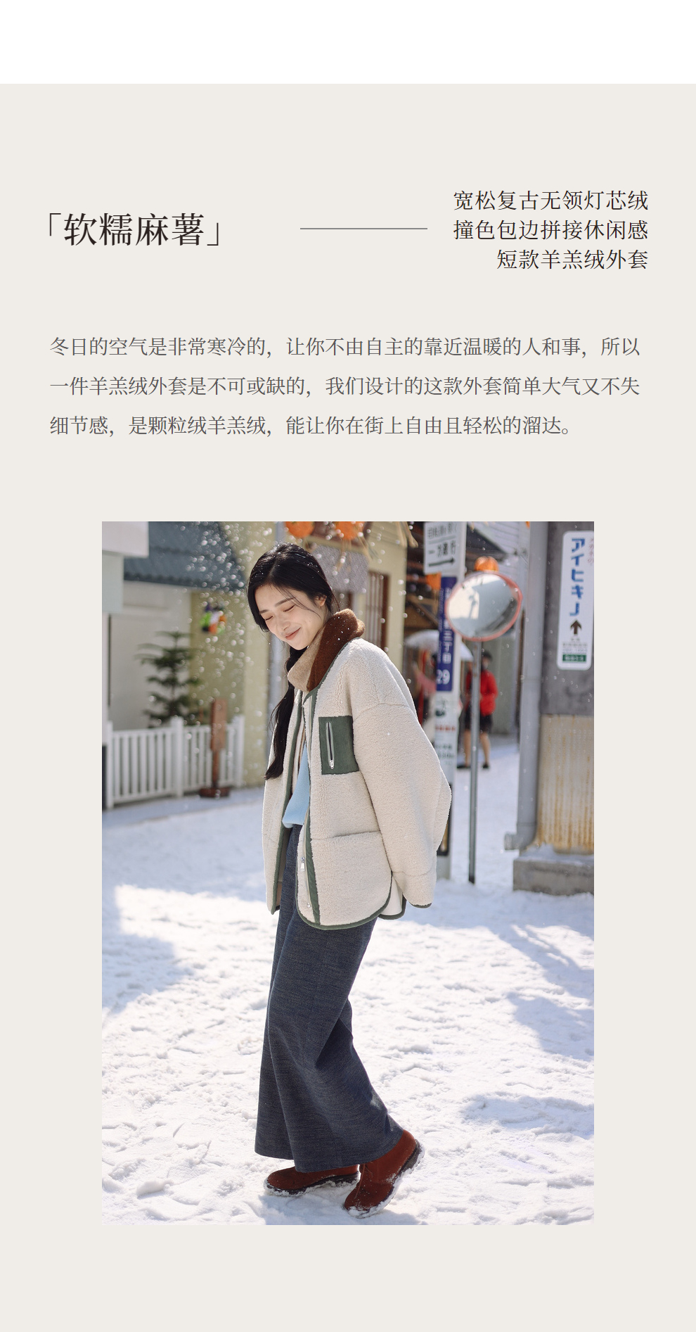 绽放981朵/杏仁色宽松复古文艺无领灯芯绒撞色包边拼接外套