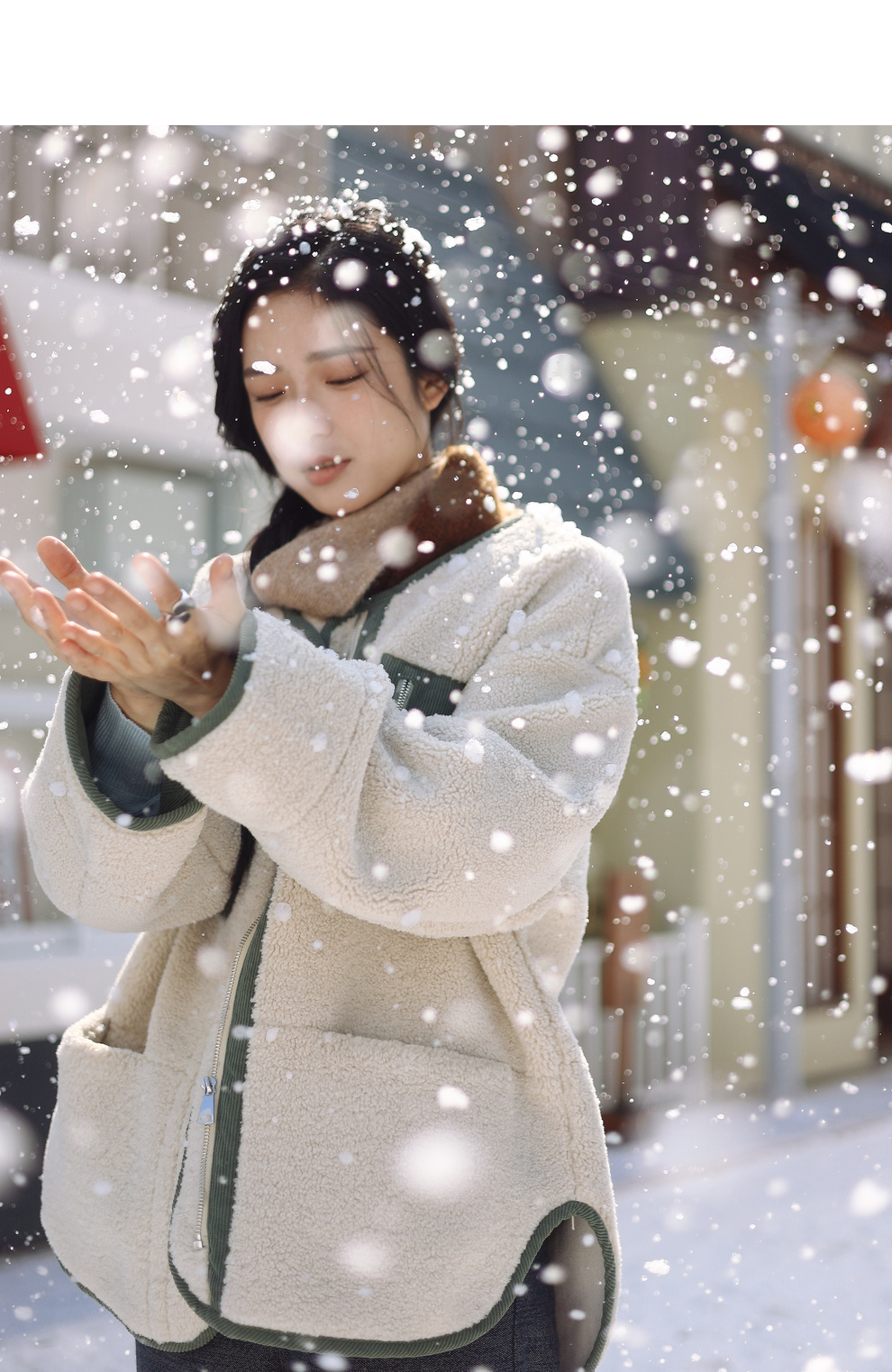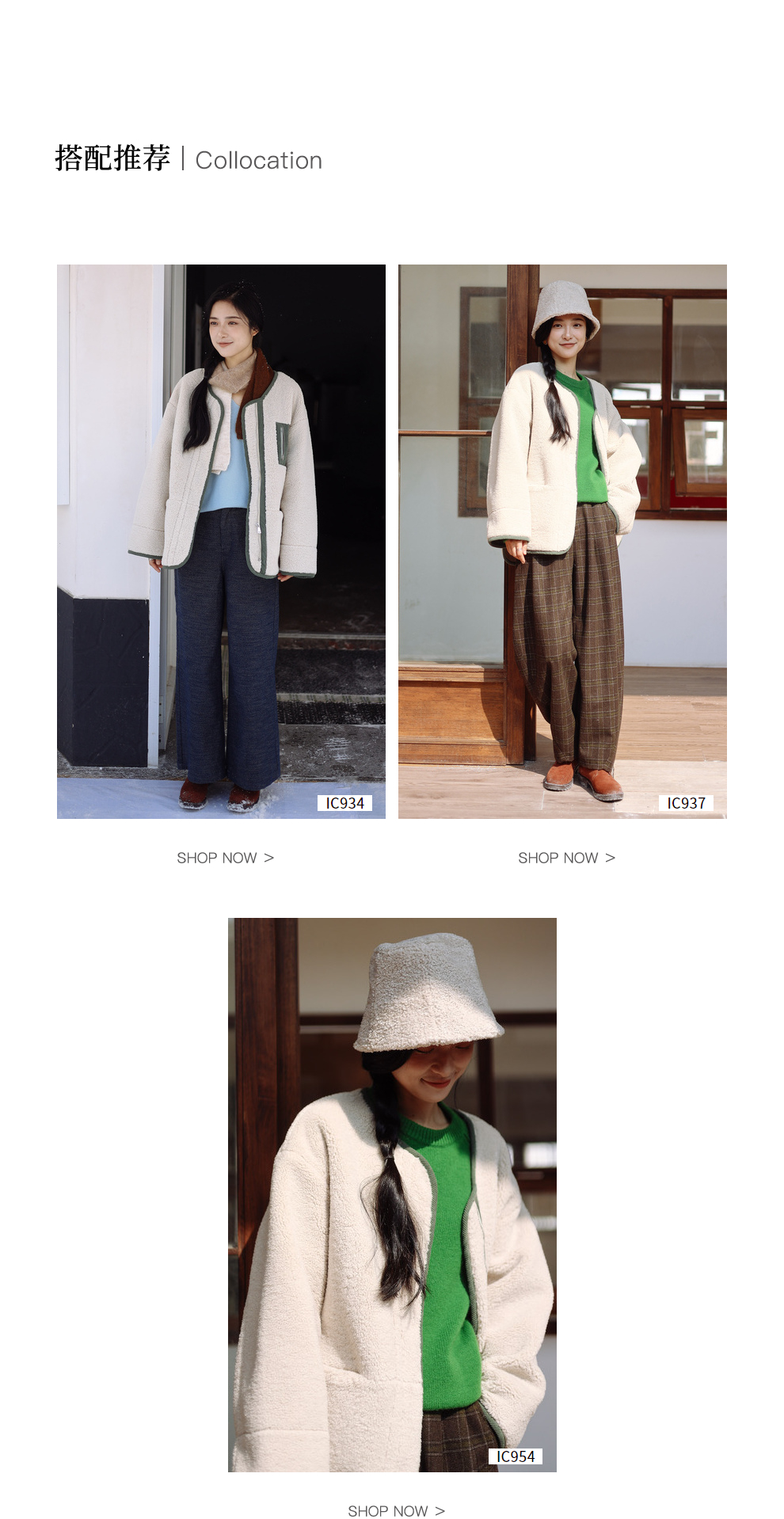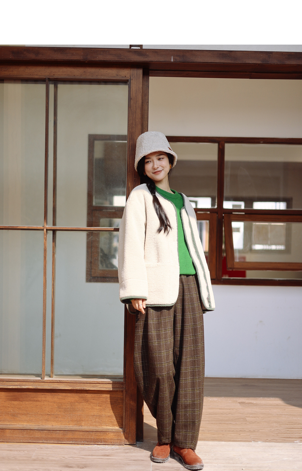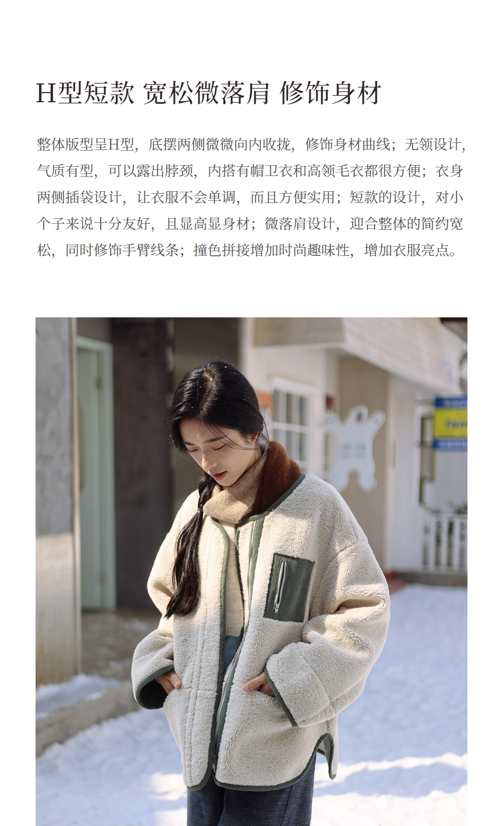 绽放981朵/杏仁色宽松复古文艺无领灯芯绒撞色包边拼接外套