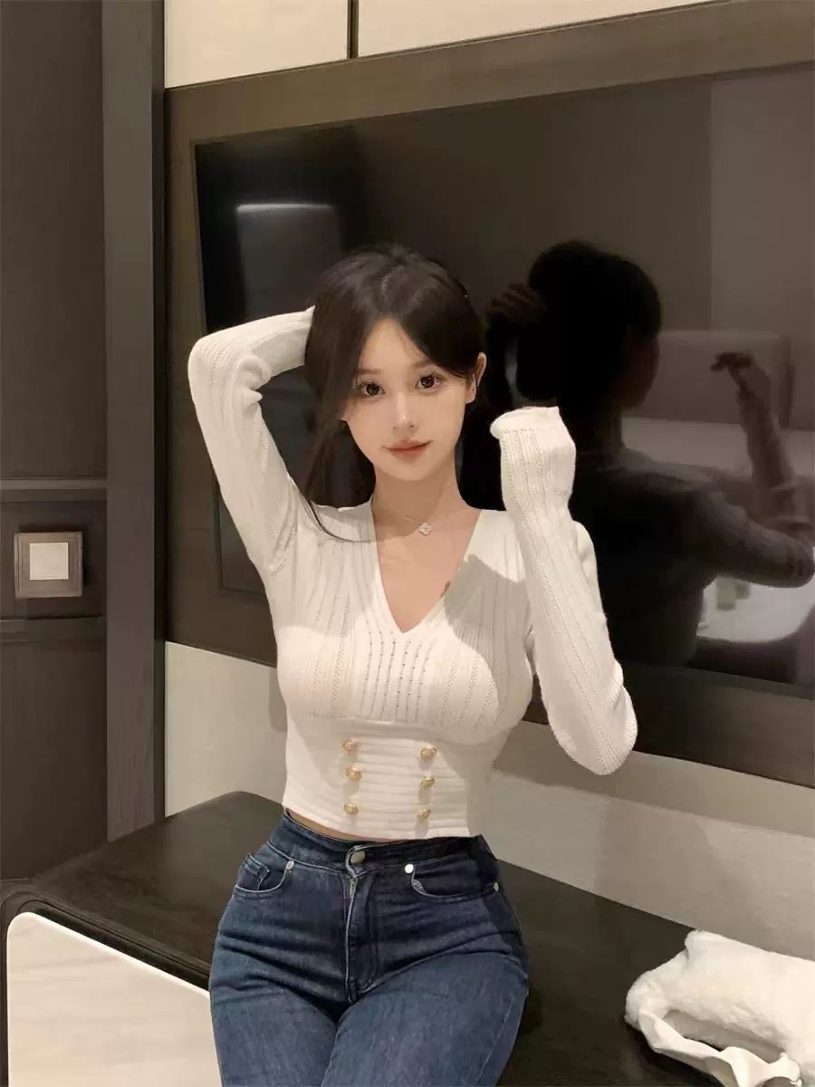 【超美❗️纯欲风收腰针织衫】修身显瘦,轻盈柔软,细腻温柔,辣妹长袖短款秋冬风紧身显瘦毛衣修身打底白色上衣