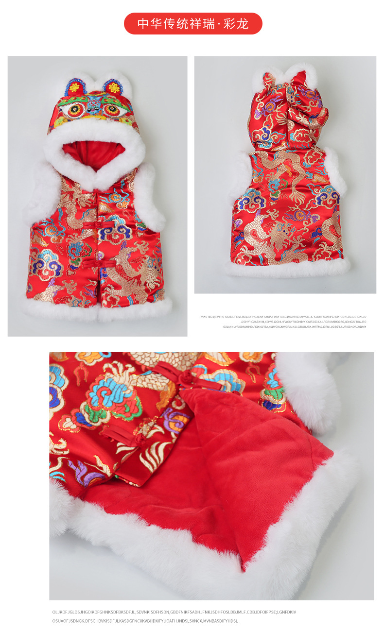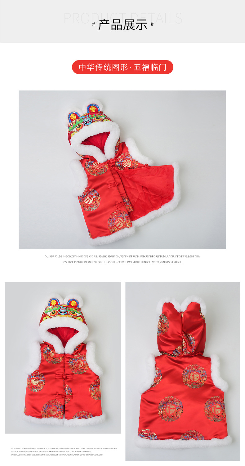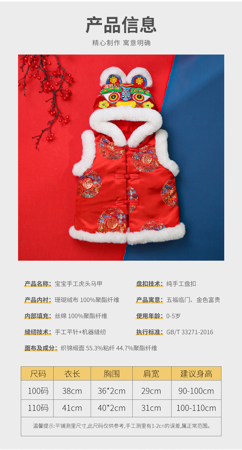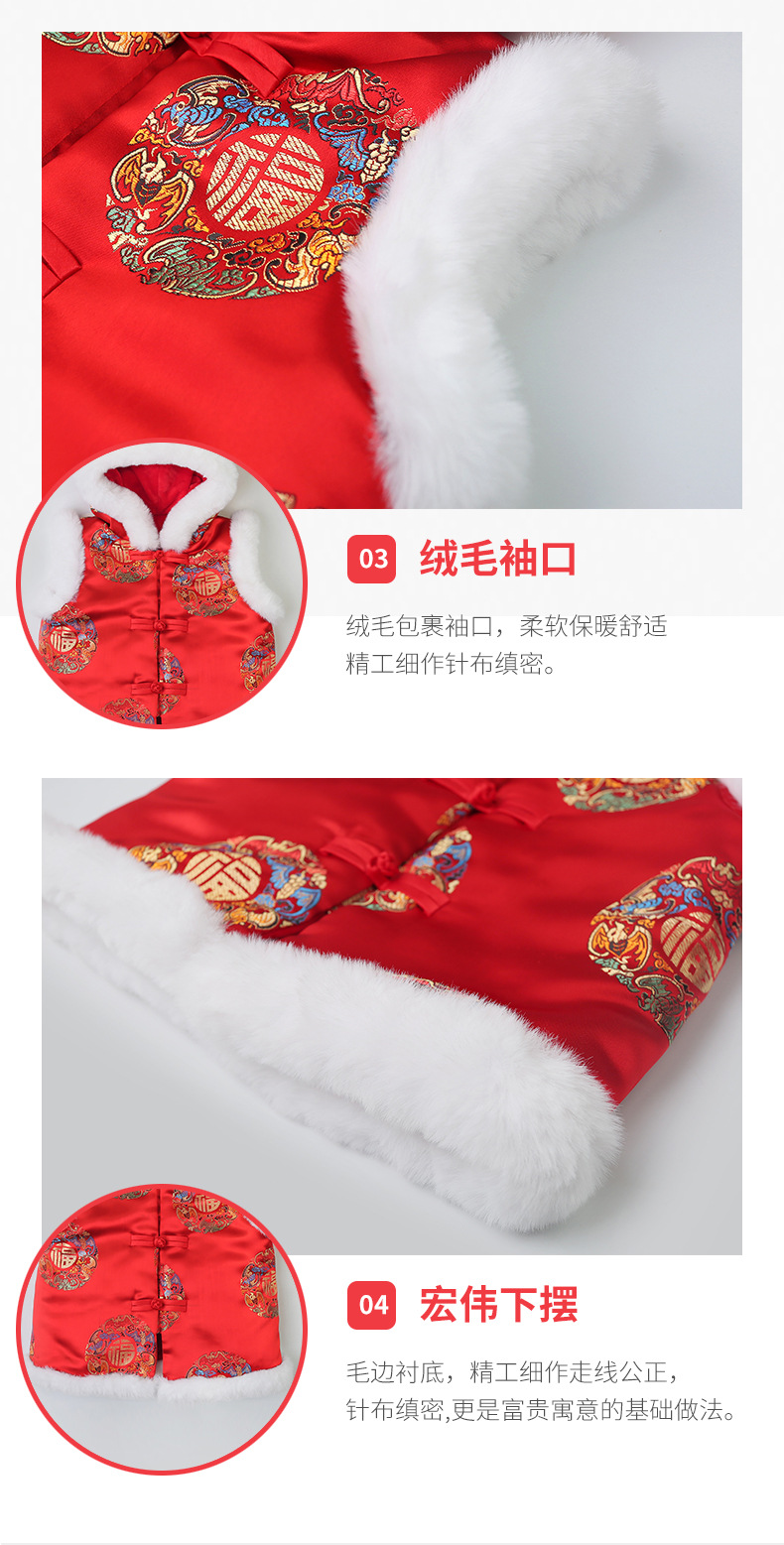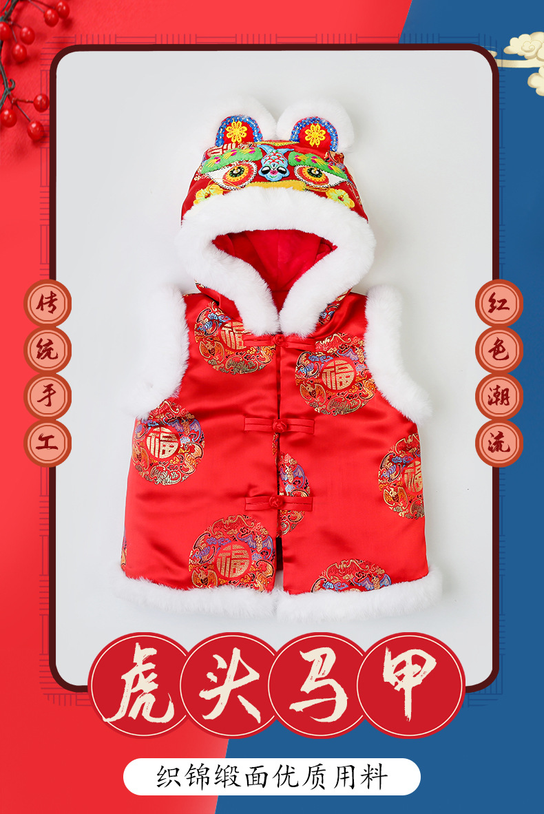 【采用优质织锦缎面 手工缝制 重工织造】新款宝宝虎头帽马甲织锦缎开衫中小童加厚马甲民族拜年唐装红坎肩