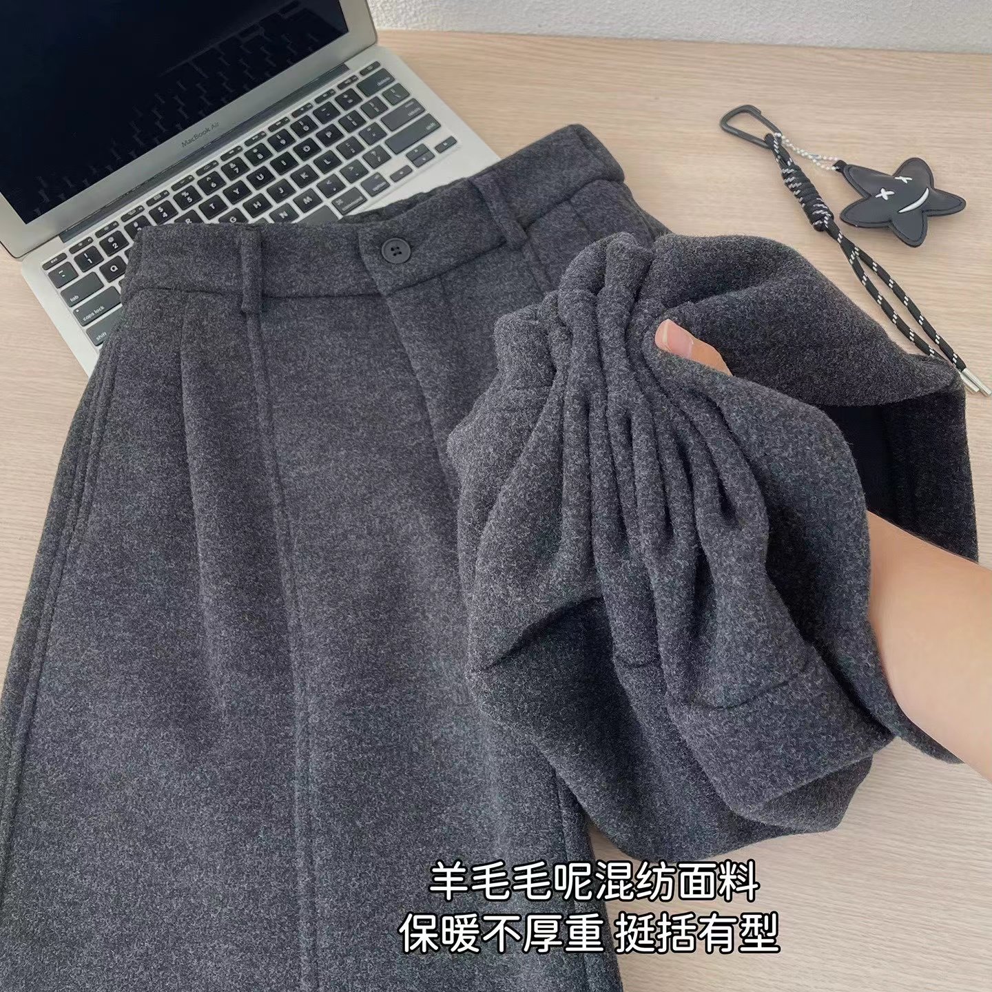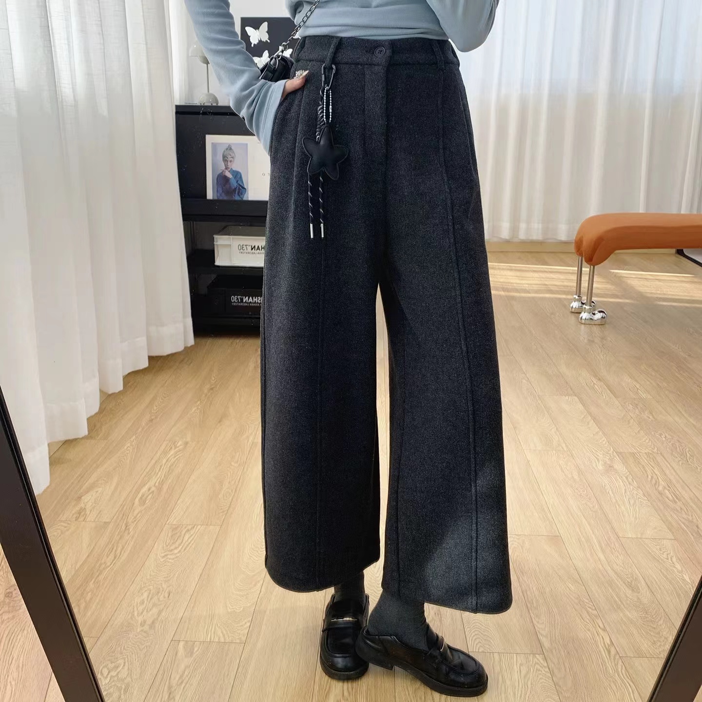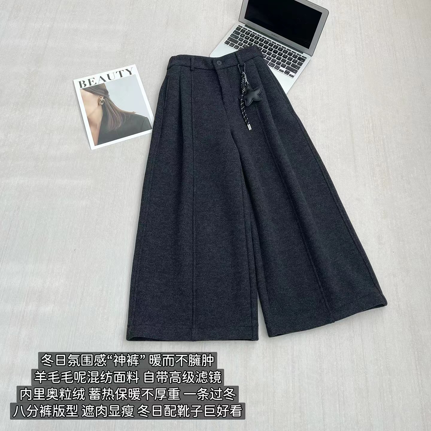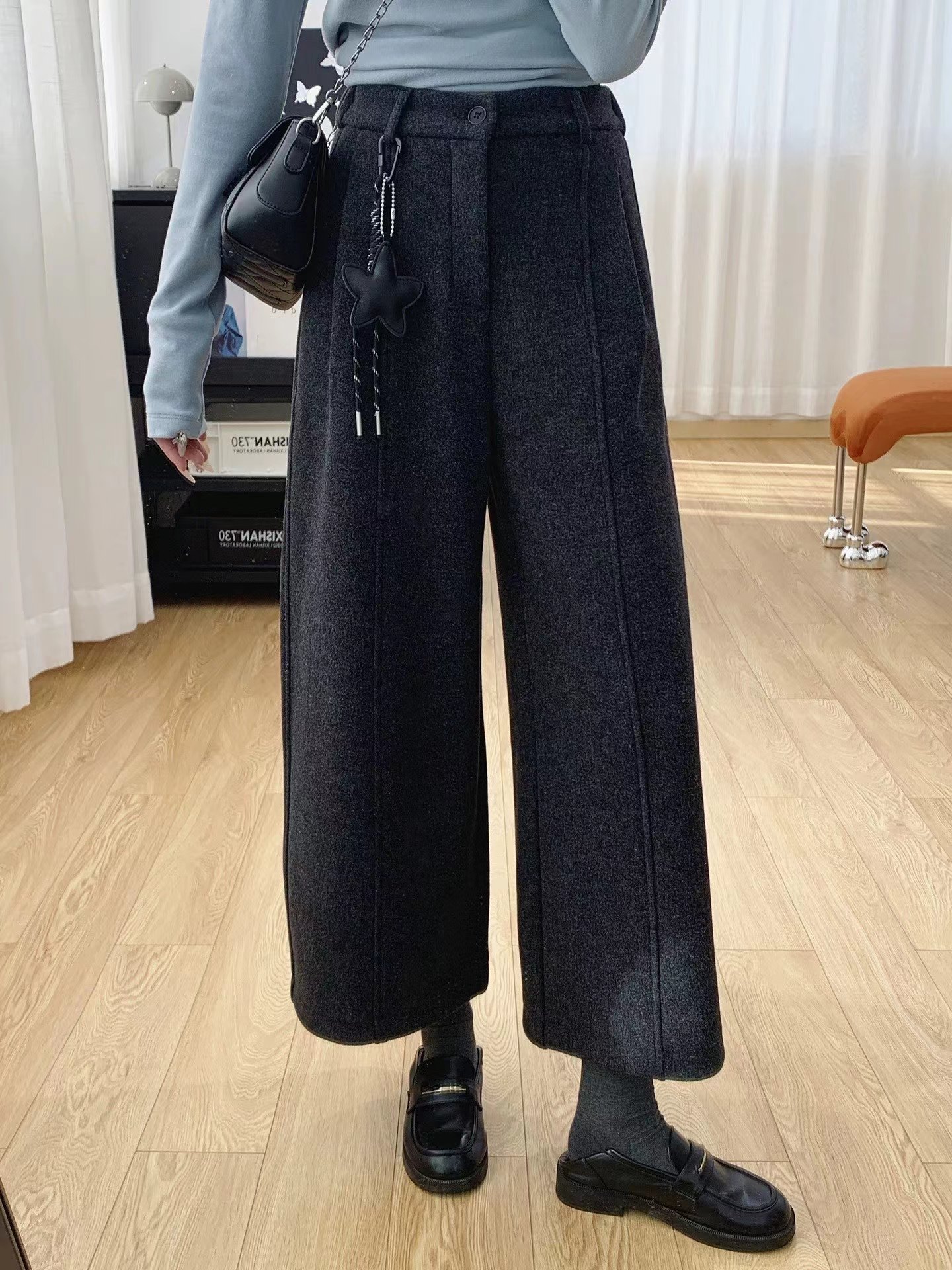 后半松紧腰毛呢羊毛裤宽松直筒加绒休闲阔腿裤女秋冬裤子八分裤冬,「冬日氛围感"神裤",暖而不臃肿」毛呢质感自带糕级滤镜,垂坠阔型藏肉显瘦八分长度刚好露脚踝,搭短靴利落又显高内里加绒锁温不厚重,冬天穿脱不冰腿日常通勤/休闲出街都适配,抽绳上的星星挂饰是小心机简约基础款也能穿出松弛时髦感~后半松紧腰的设计舒适不勒肚子(PS:这款属于高品质的含15%的羊毛,内里做工更是高规格超满意)