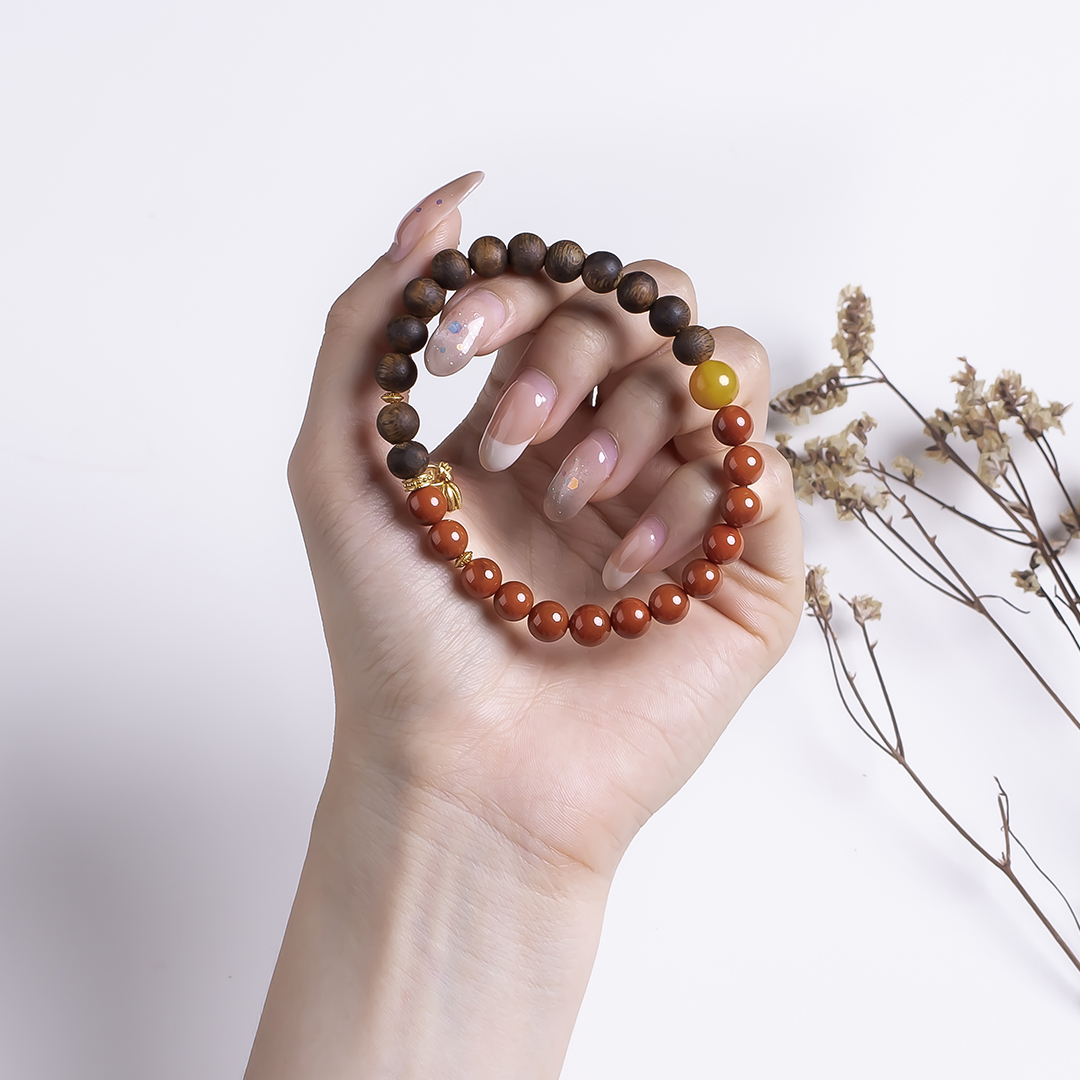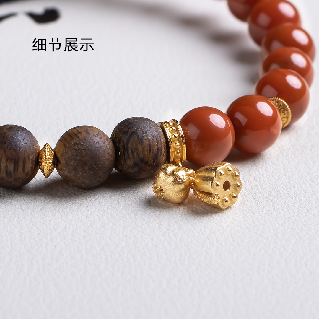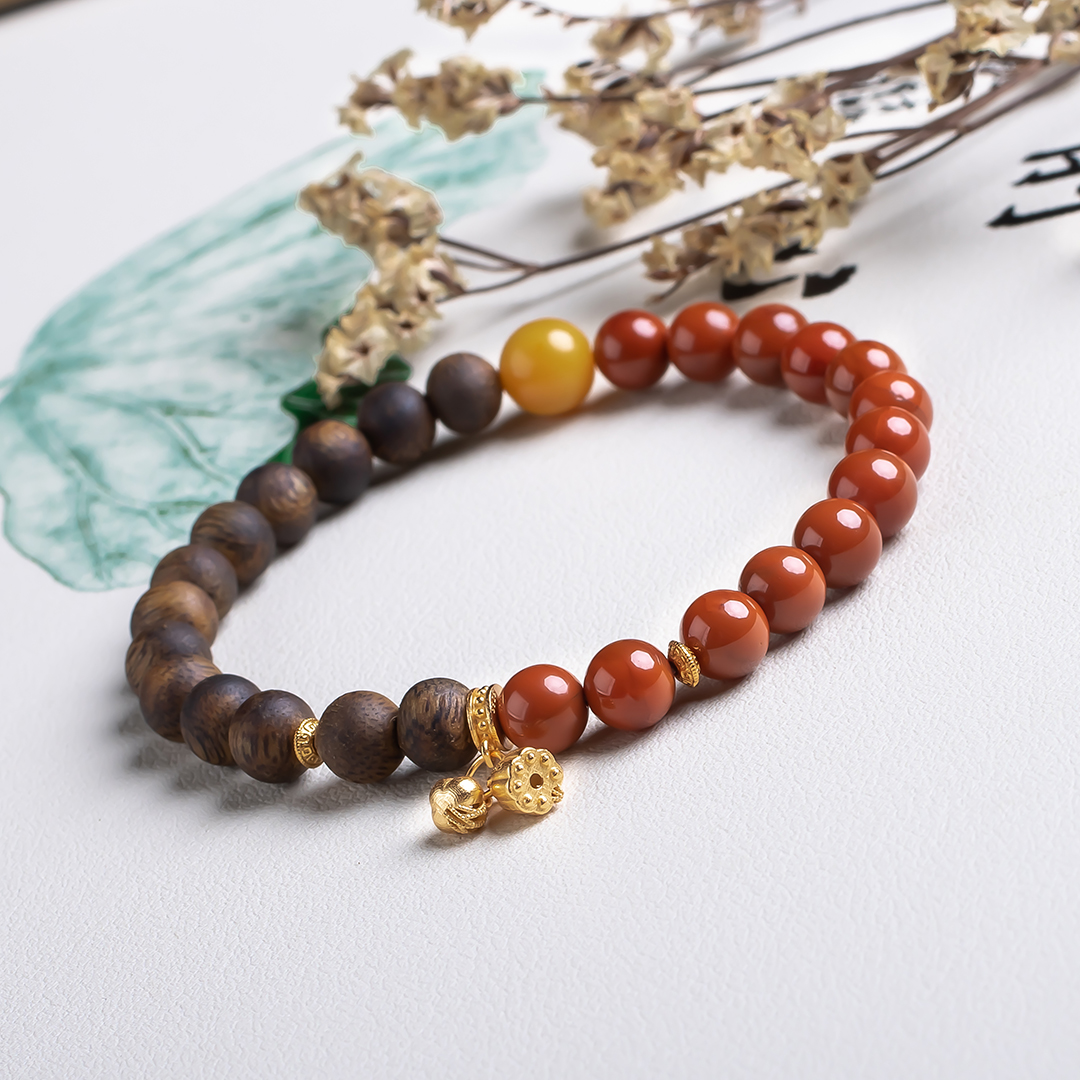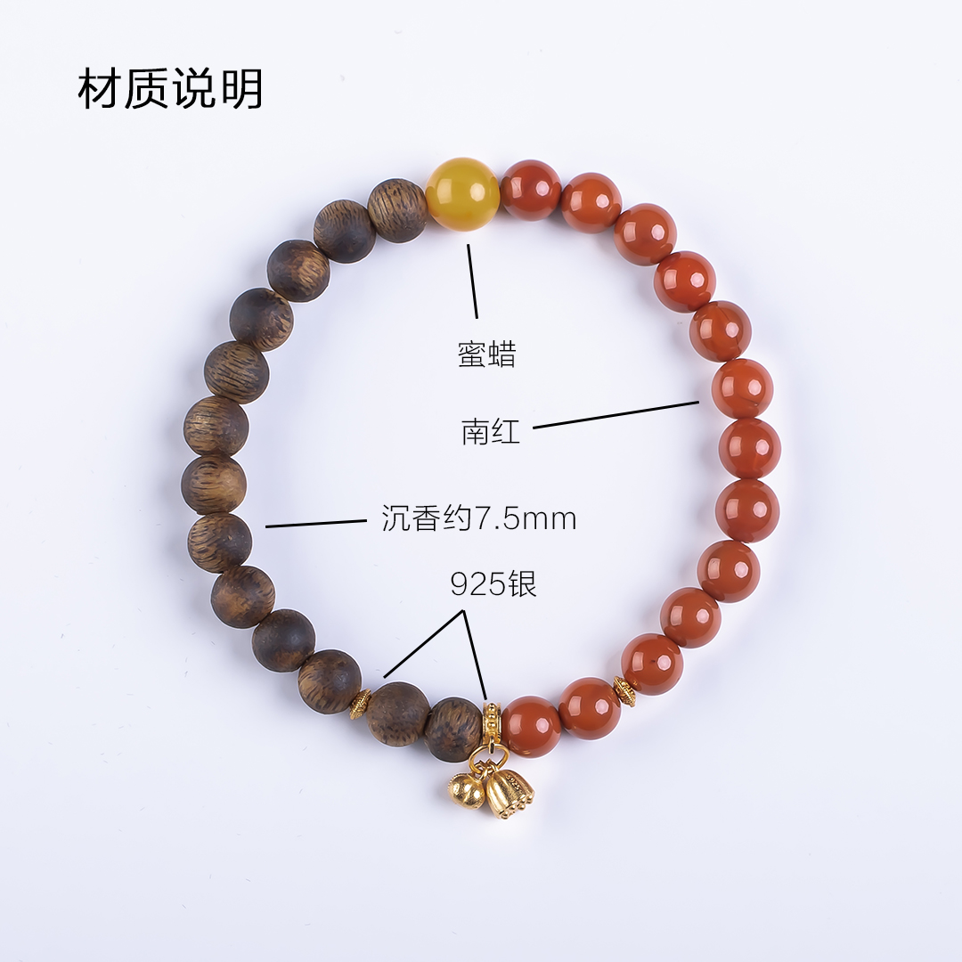 xy0524沉香+蜜蜡南红半山半水手串.银,天然沉香约7.5mm,原色原味,香味自然清甜,半圈的满色肉南红加一枚金黄蜜蜡点缀,富贵吉祥感拉满,半山半水款设计,莲蓬子小提溜搭配增加时尚灵动魅力。