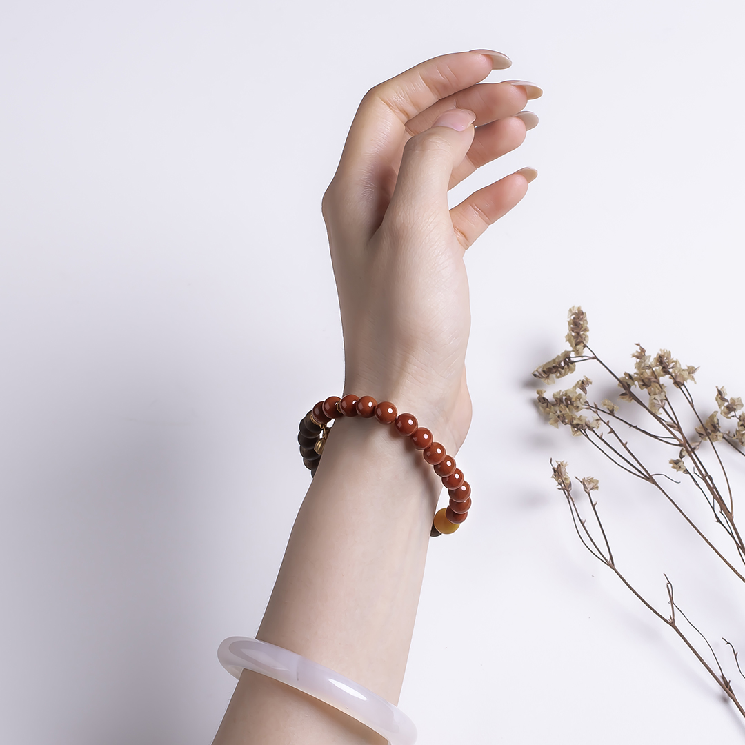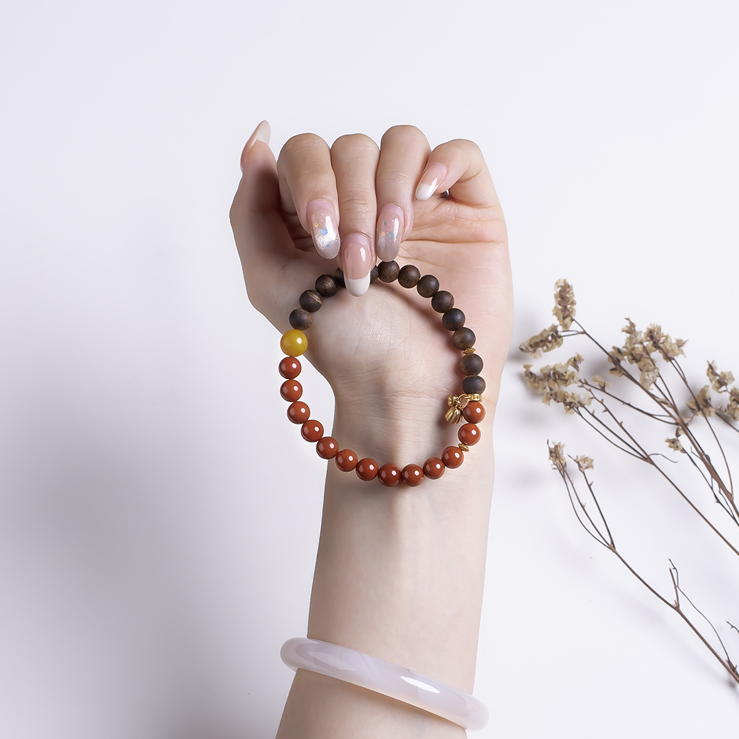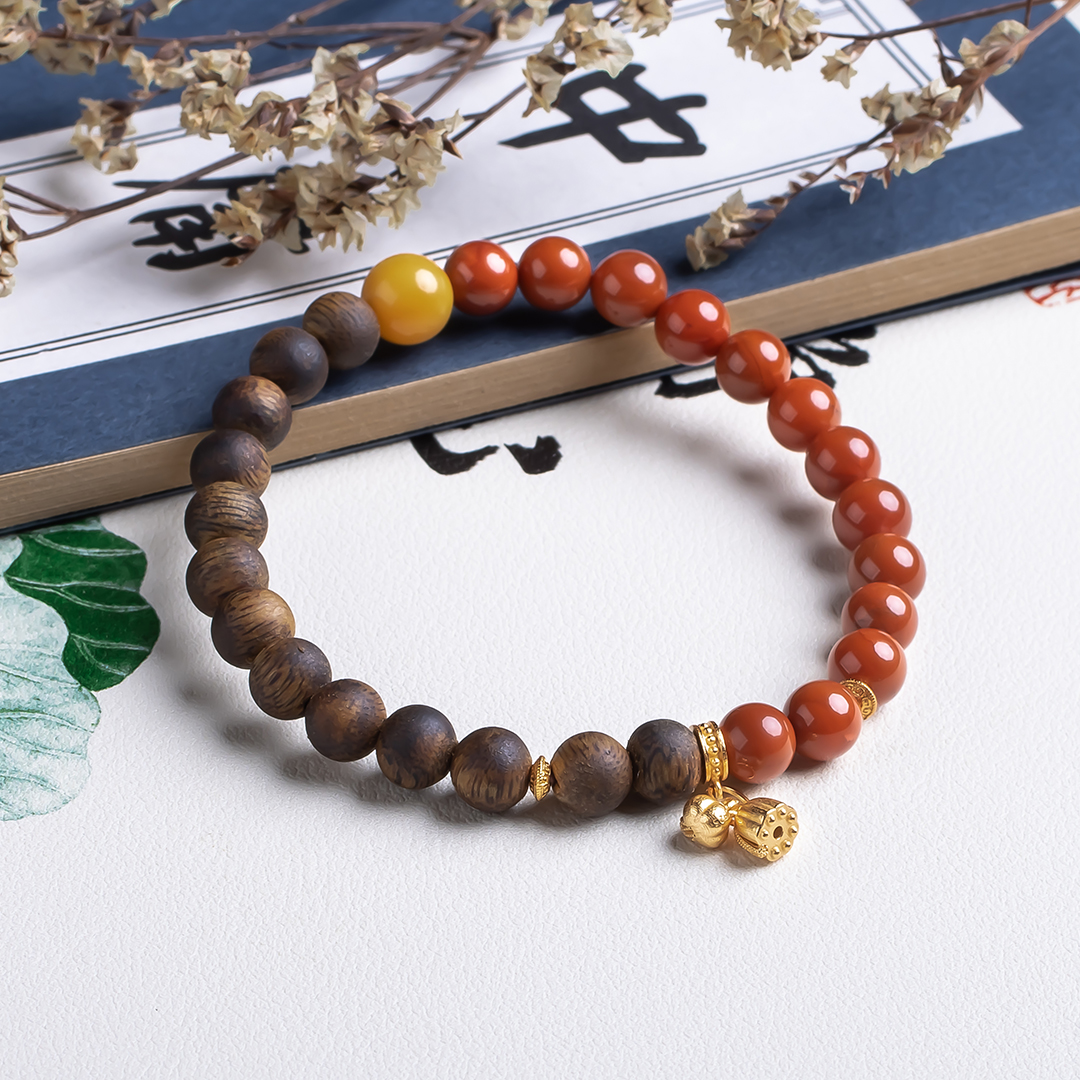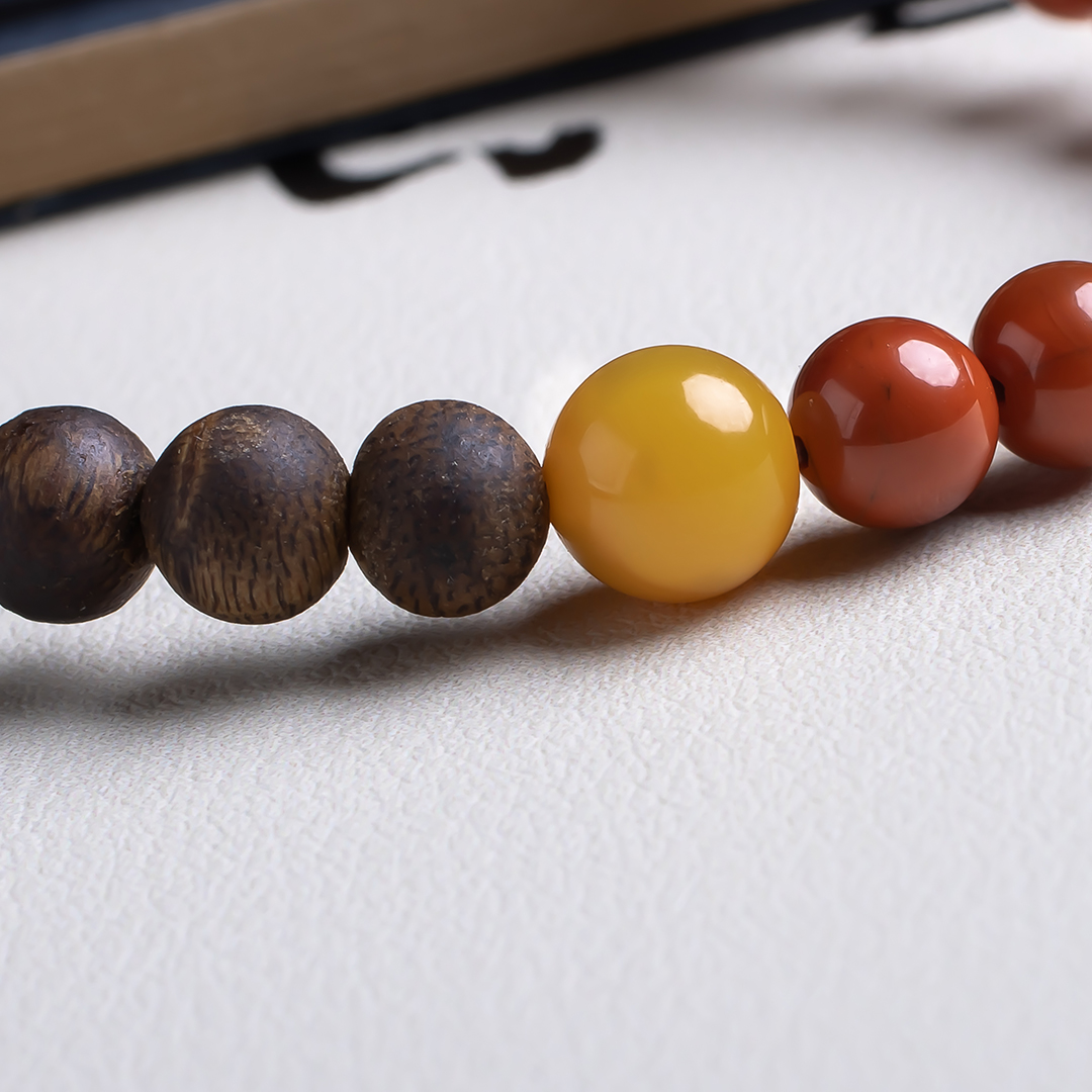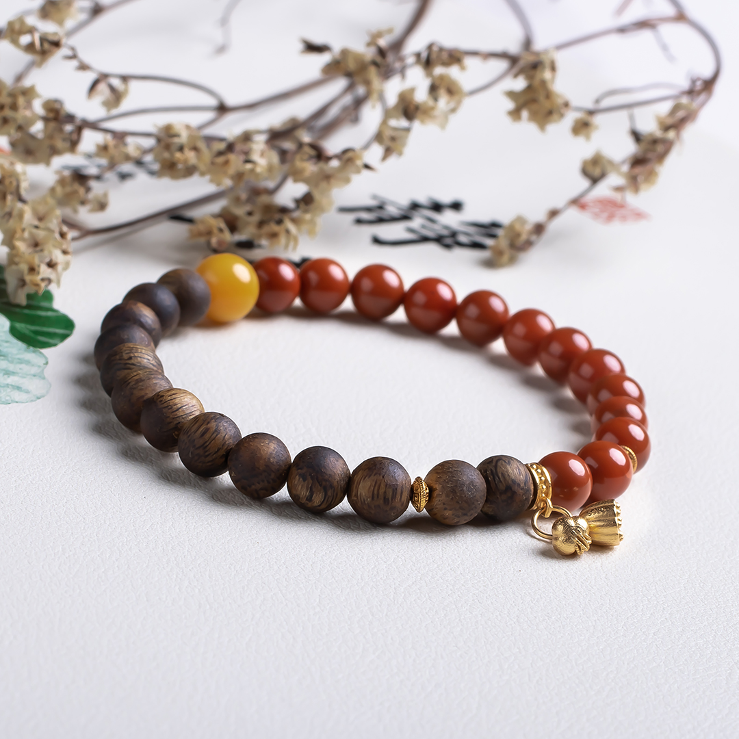 xy0524沉香+蜜蜡南红半山半水手串.银,天然沉香约7.5mm,原色原味,香味自然清甜,半圈的满色肉南红加一枚金黄蜜蜡点缀,富贵吉祥感拉满,半山半水款设计,莲蓬子小提溜搭配增加时尚灵动魅力。
