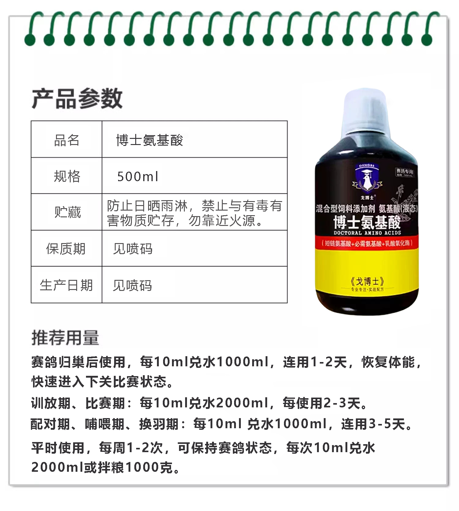 【博士氨基酸】500毫升,赛鸽补充能量体能蛋白【大西农戈博士)