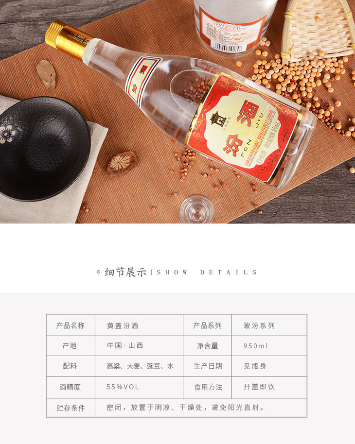 山西汾酒杏花村酒 玻汾酒55度 黄盖汾酒950ml清香型国产白酒
