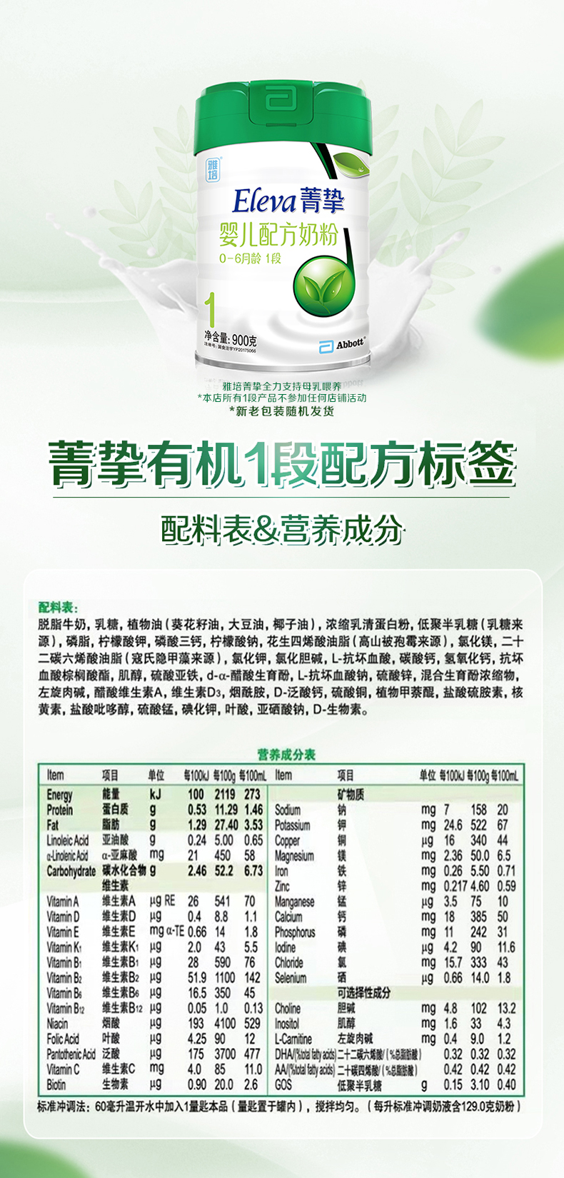 雅培菁挚原菁智有机1段奶粉900g