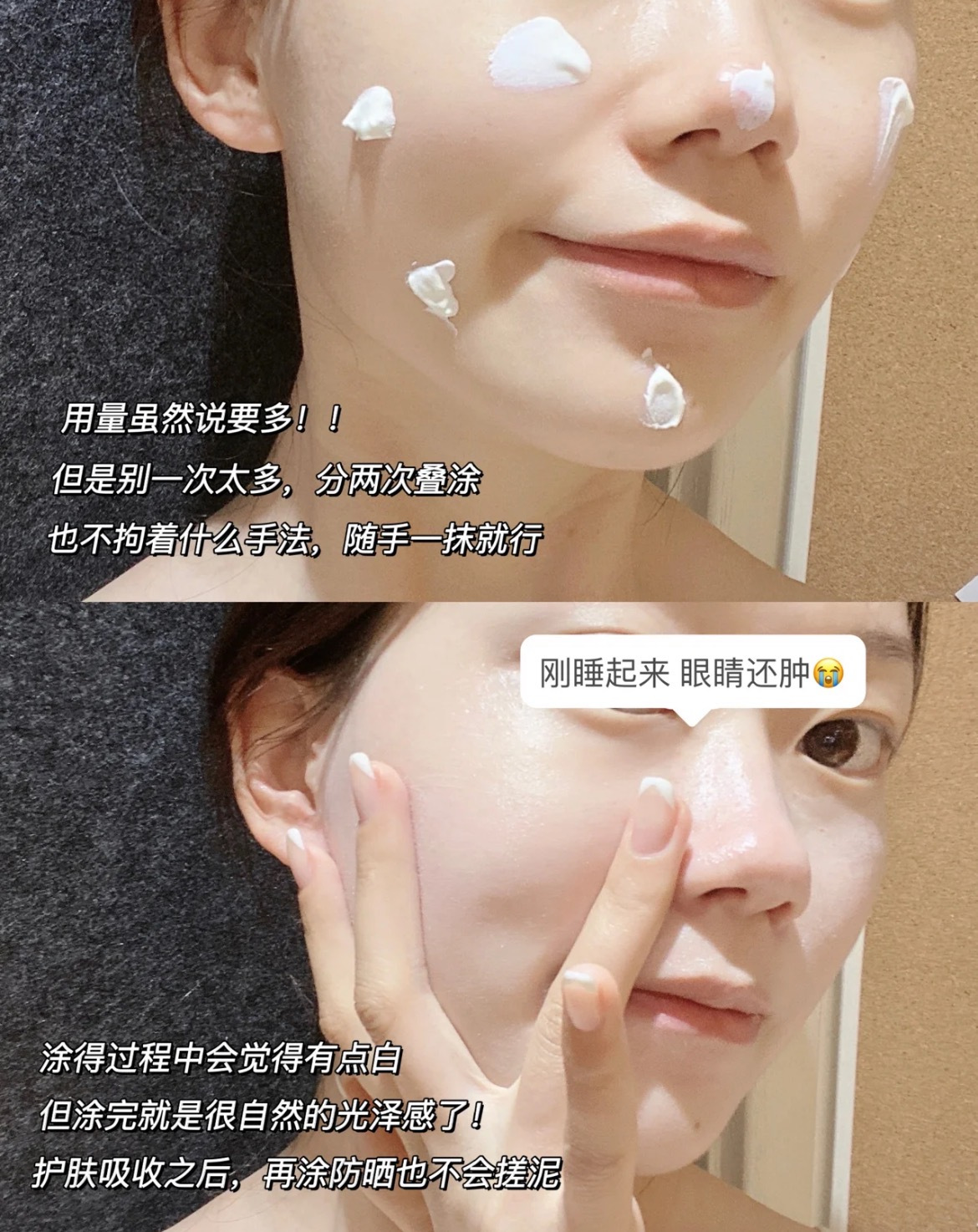 但这款防晒霜很良心,上手上脸就秒成膜,从此不用等到成膜再出门,边涂防晒边出门都不怕啦~