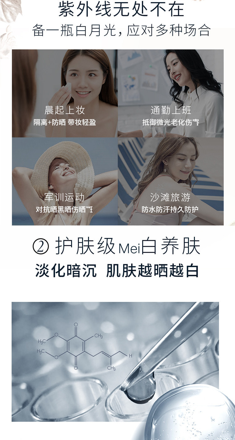 此外,白月光防晒里添加国际公认美白成分烟酰胺、光果甘草提取物,以及抑制黑色素生成的倒地铃…等多种生物养肤成分,舒缓敏感,晒后修护,妥妥的“学霸型”防晒!一瓶双效,边防晒边美白!