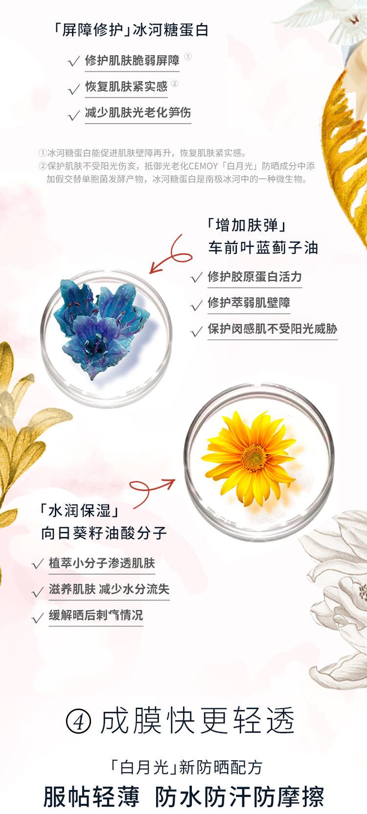 大多数防晒对敏感肌都不友好,而白月光里添加了多种修护成分,上脸温和柔润,敏感肌也能放心用!