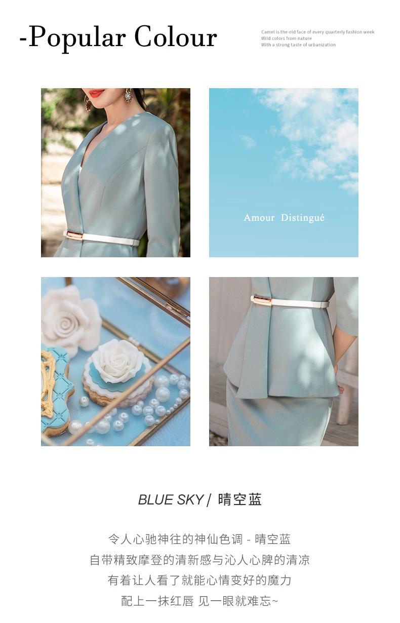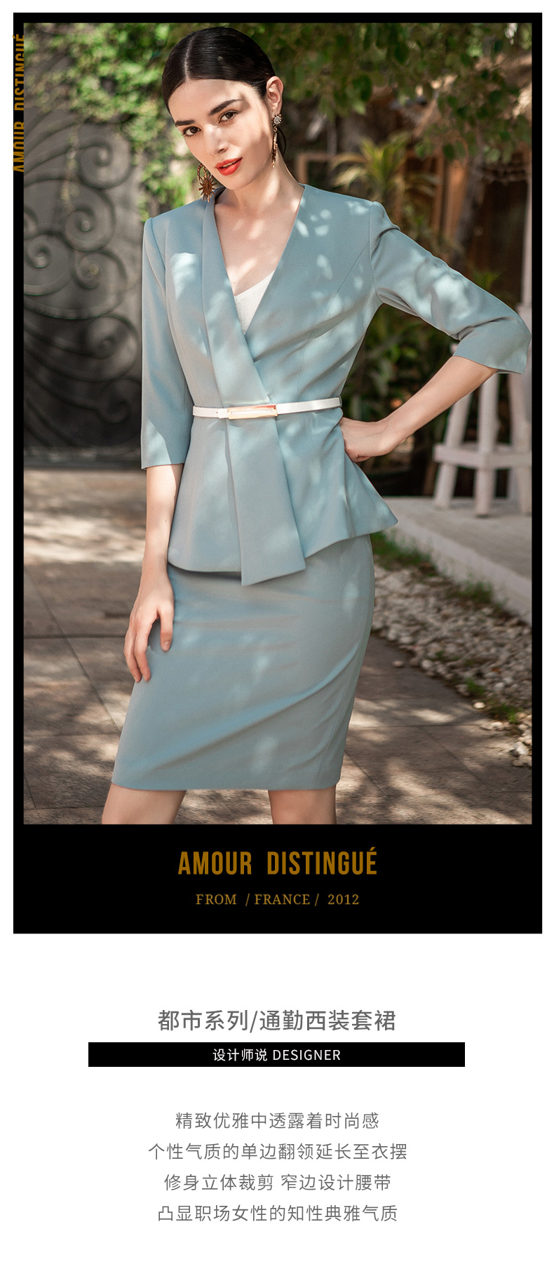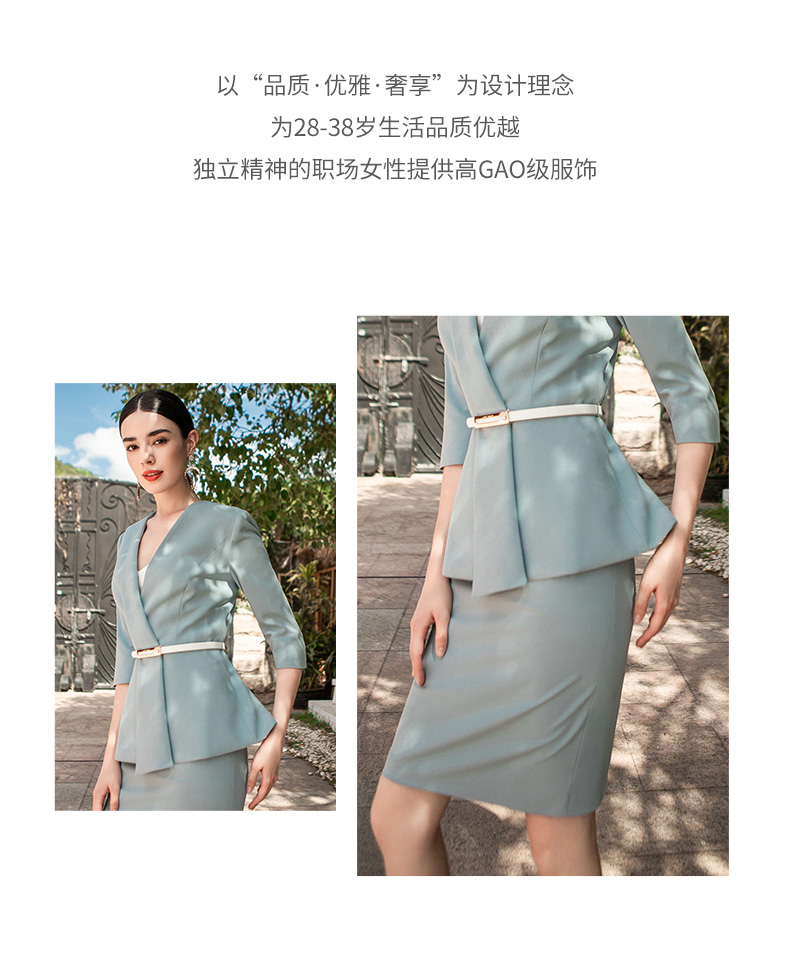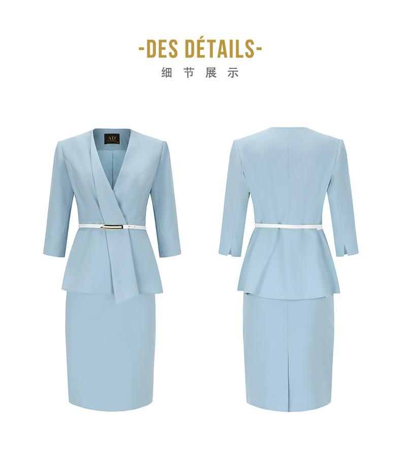 AD高端气质蓝色职业装套装女秋季不规则设计七分袖西装套裙正式装