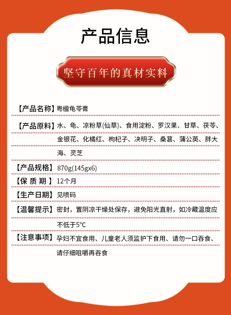 产品原料】水、龟、凉粉草(仙草)、食用淀粉、罗汉果、甘草、茯苓、金银花、化橘红、枸杞子、决明子、桑葚、蒲公英、胖大海、灵芝