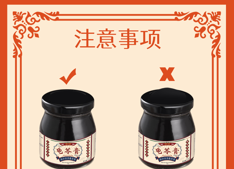 龟苓膏为玻璃瓶运输,虽有泡沫箱防护,但偶尔有破损发生,而且龟苓膏胶质较多,漏了会整个箱子黏黏的,再加上没有防腐剂,尤其夏天容易有异味,如收到货当天有发现破损请24小时内联系客服处理。
