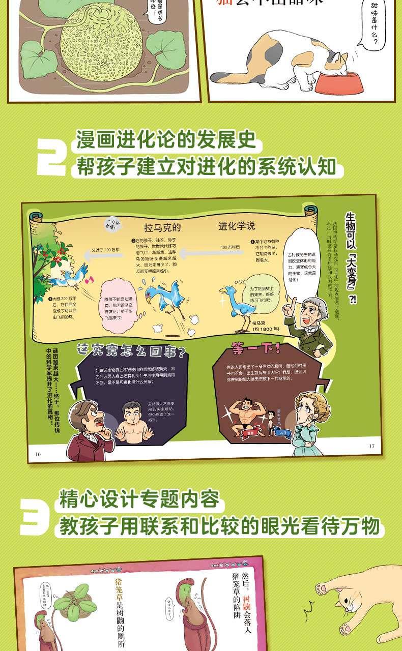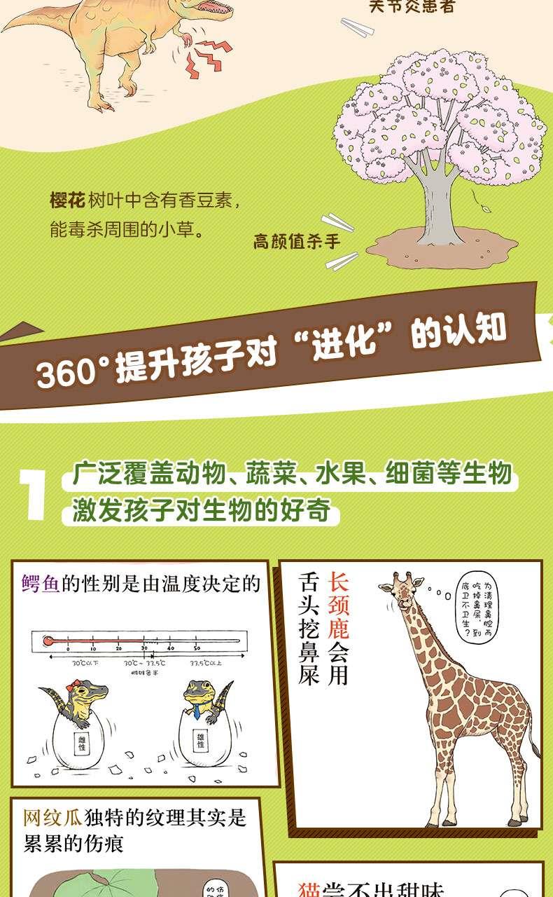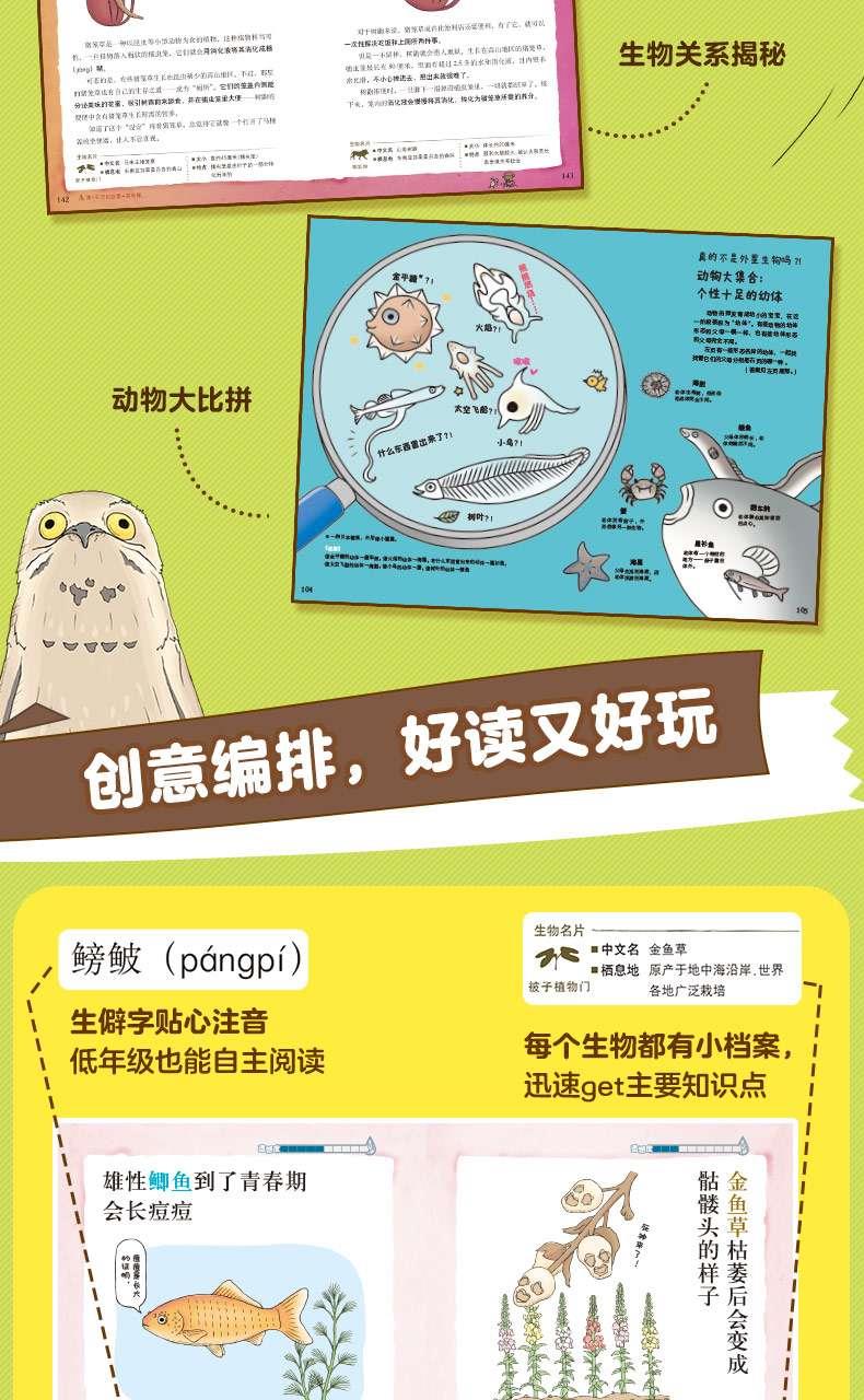 6.收录各类动物、水果、蔬菜、宠物、细菌等内容,精心设计进化史漫画、生物大比拼、生物关系大揭秘等专题,全*方位提升孩子的认知,助力思维升级!