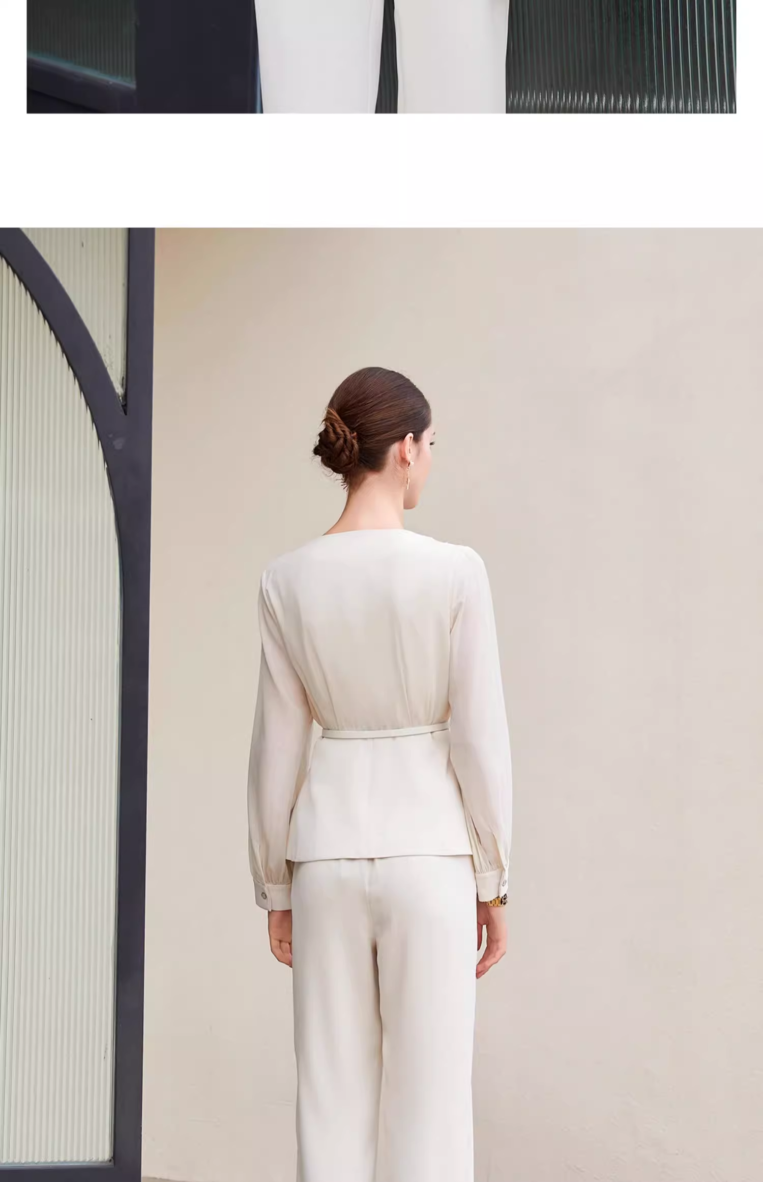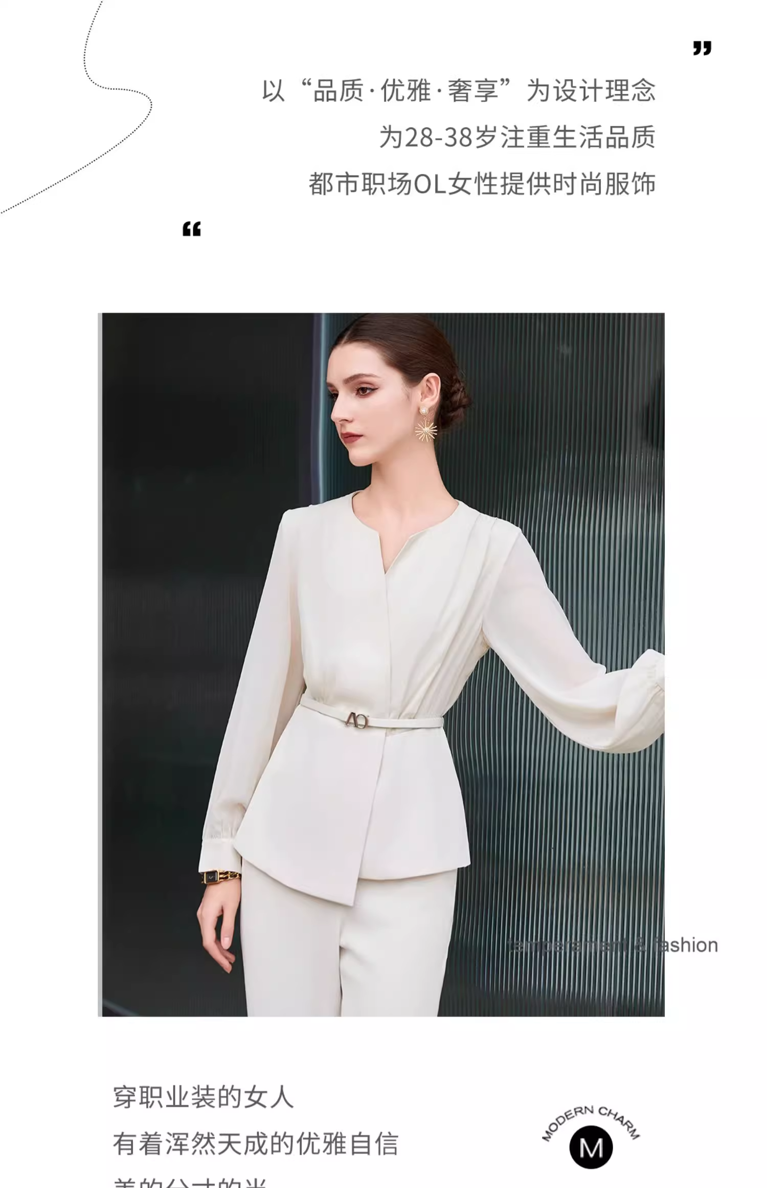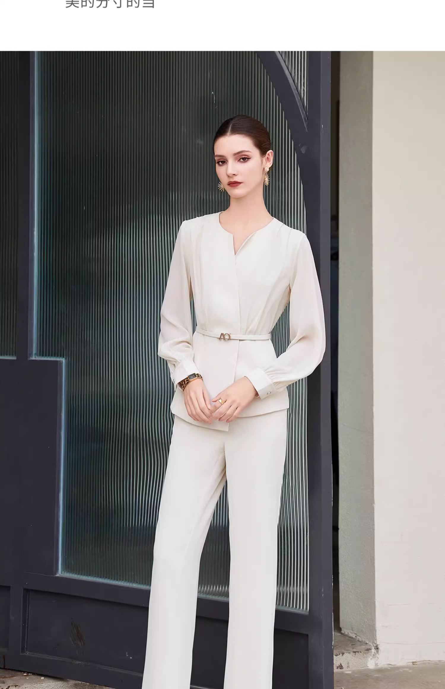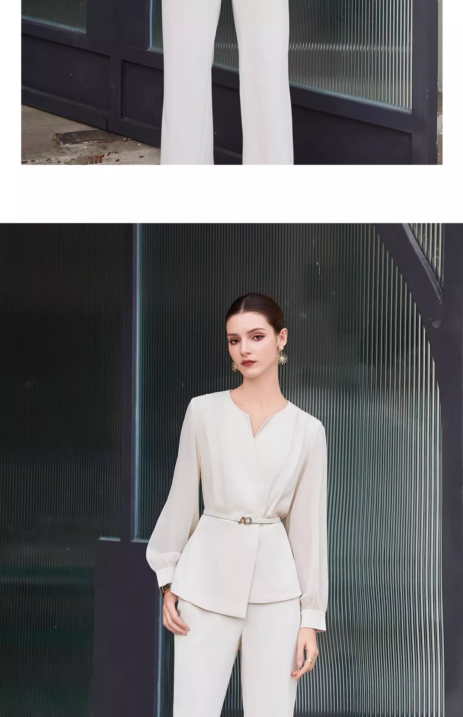 AD设计感小V领接拼雪纺衬衫上衣女高端职业两件套时尚阔腿裤套装