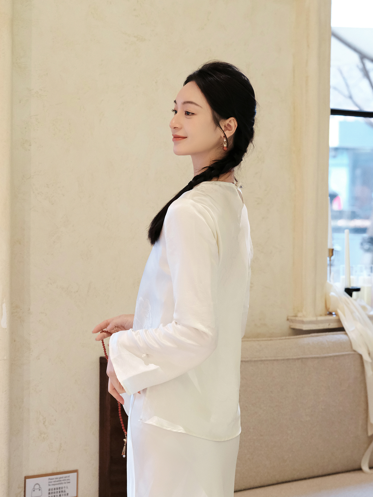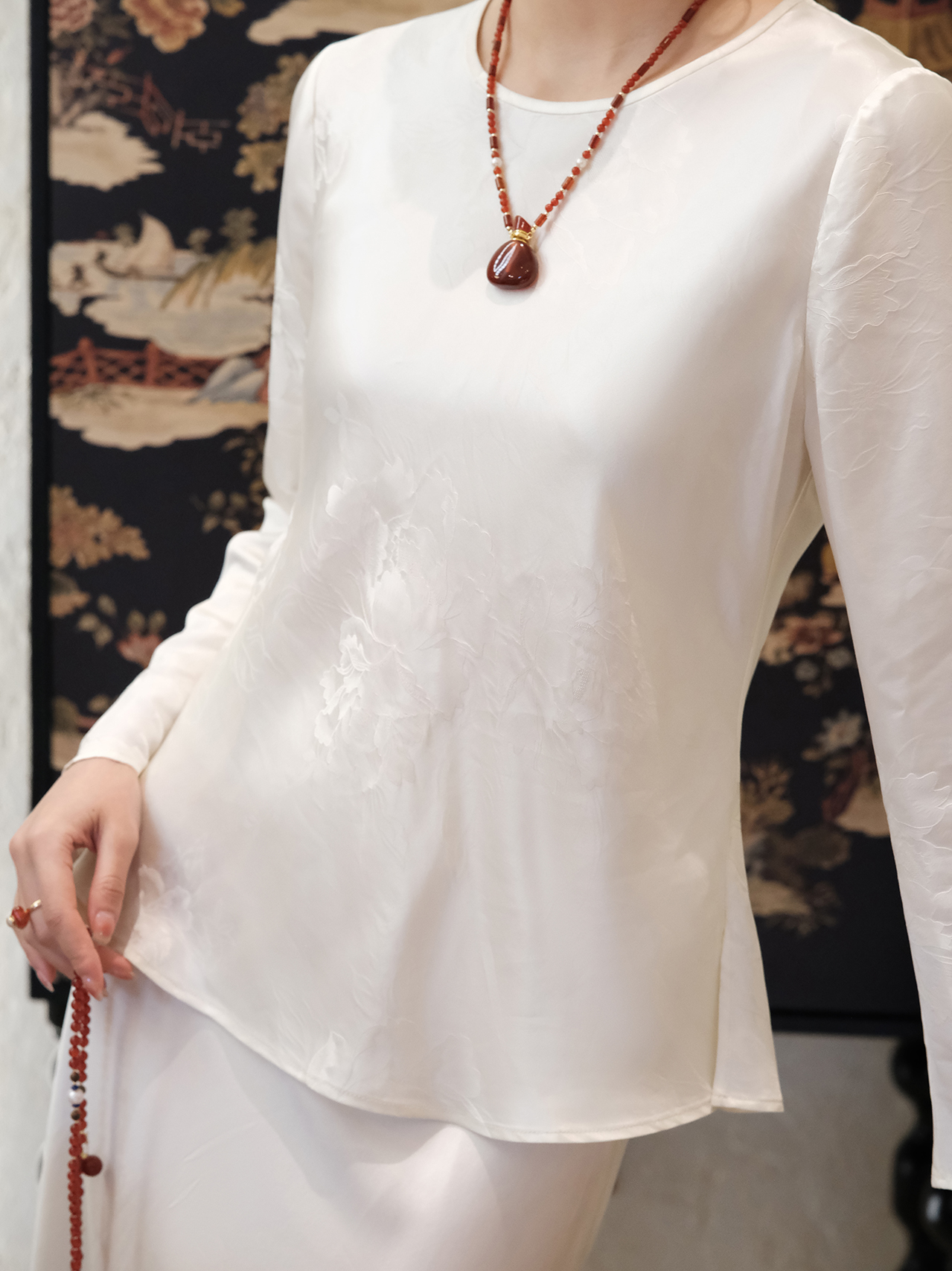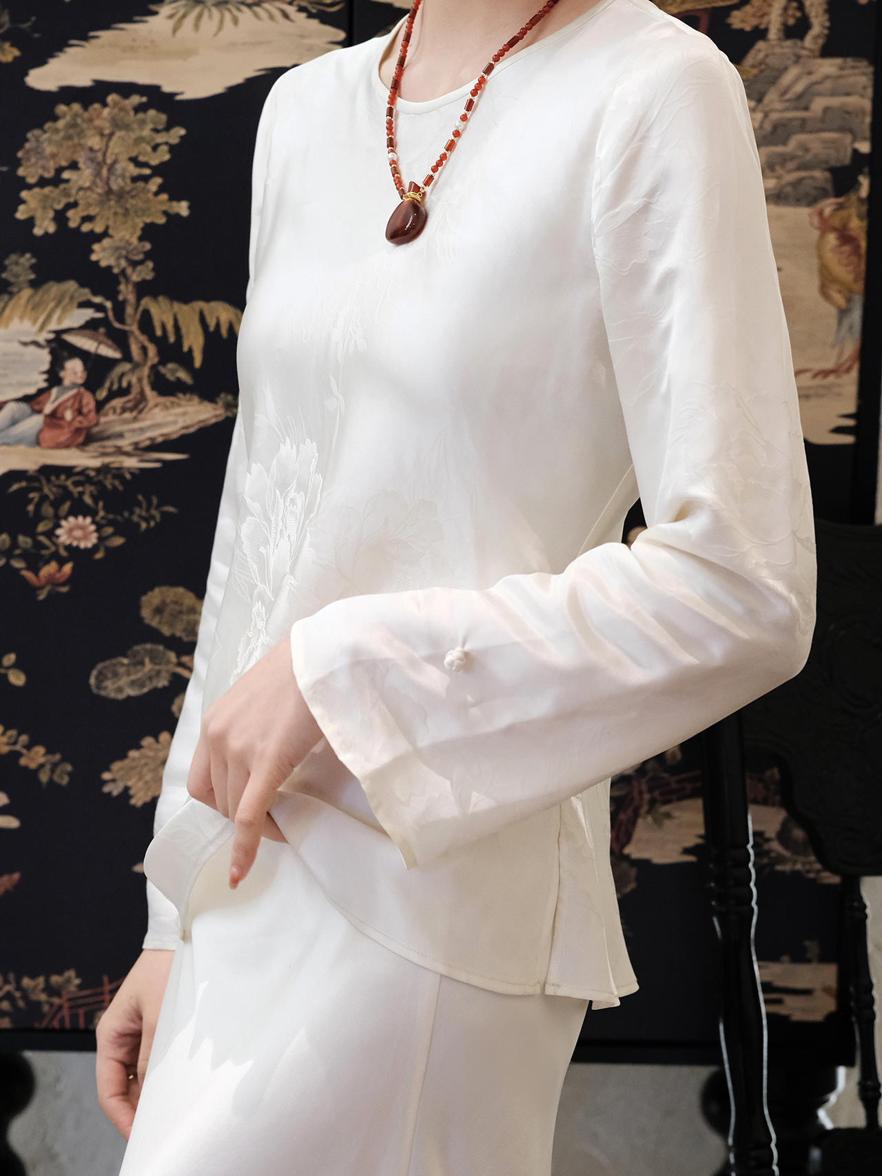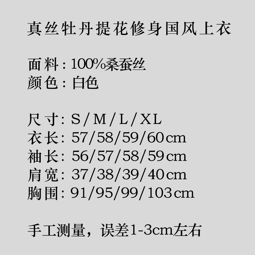 盛唐婧 |真丝牡丹提花修身国风上衣-白色