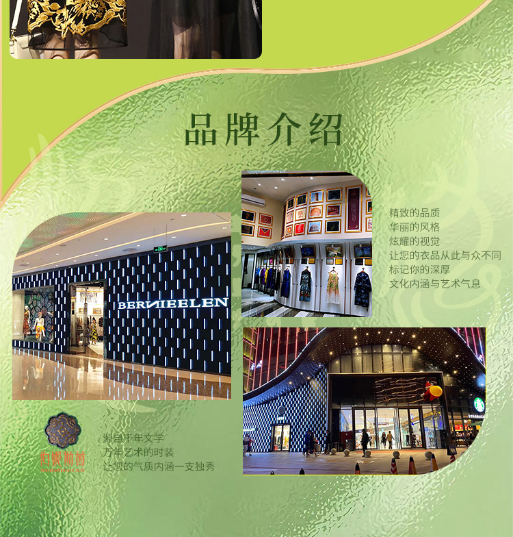 行业首家从事文创研发的女装品牌-伯妮斯茵 品牌风格:源自千年文学和万年艺术的时装,让你的气质内涵一枝独秀,精彩的品质,华丽的风格,炫耀的视觉,让你的衣品从此与众不同,标记你深厚的文化内涵与艺术气息。