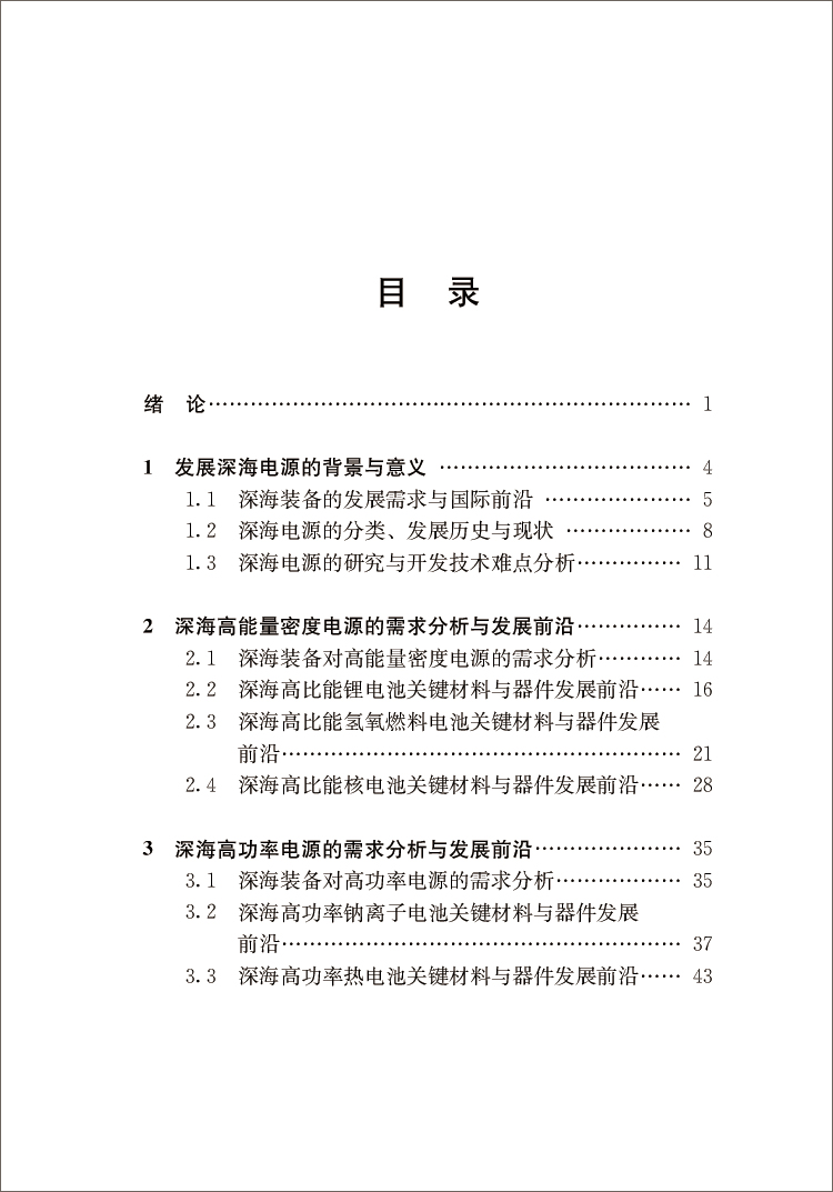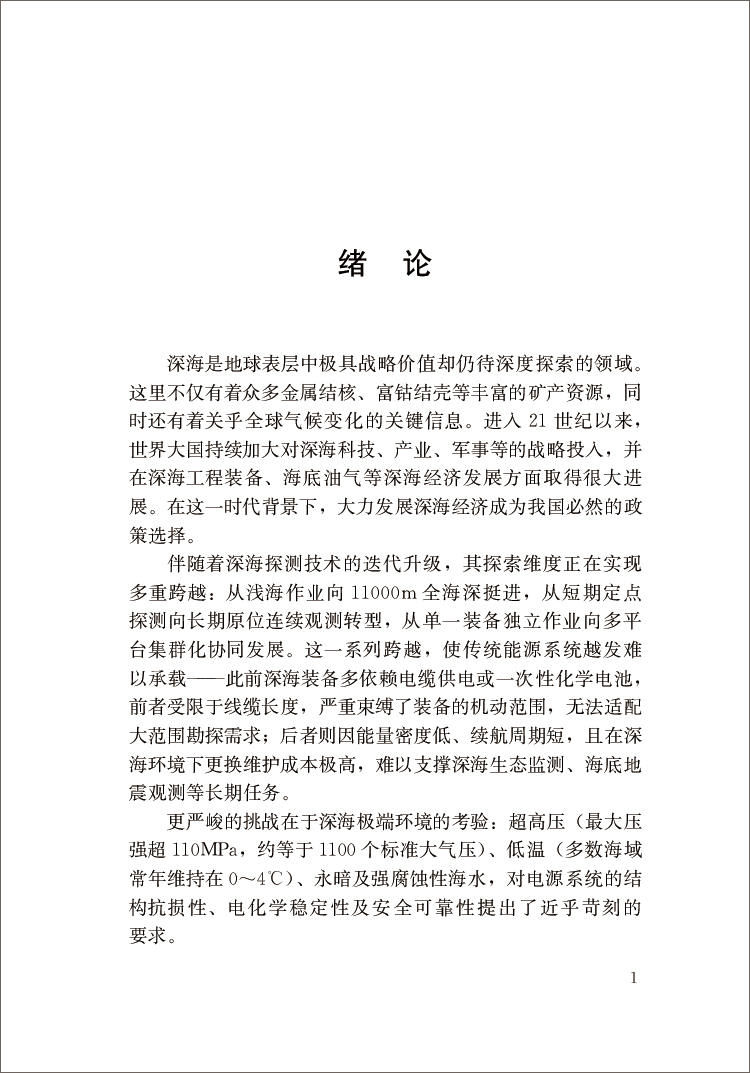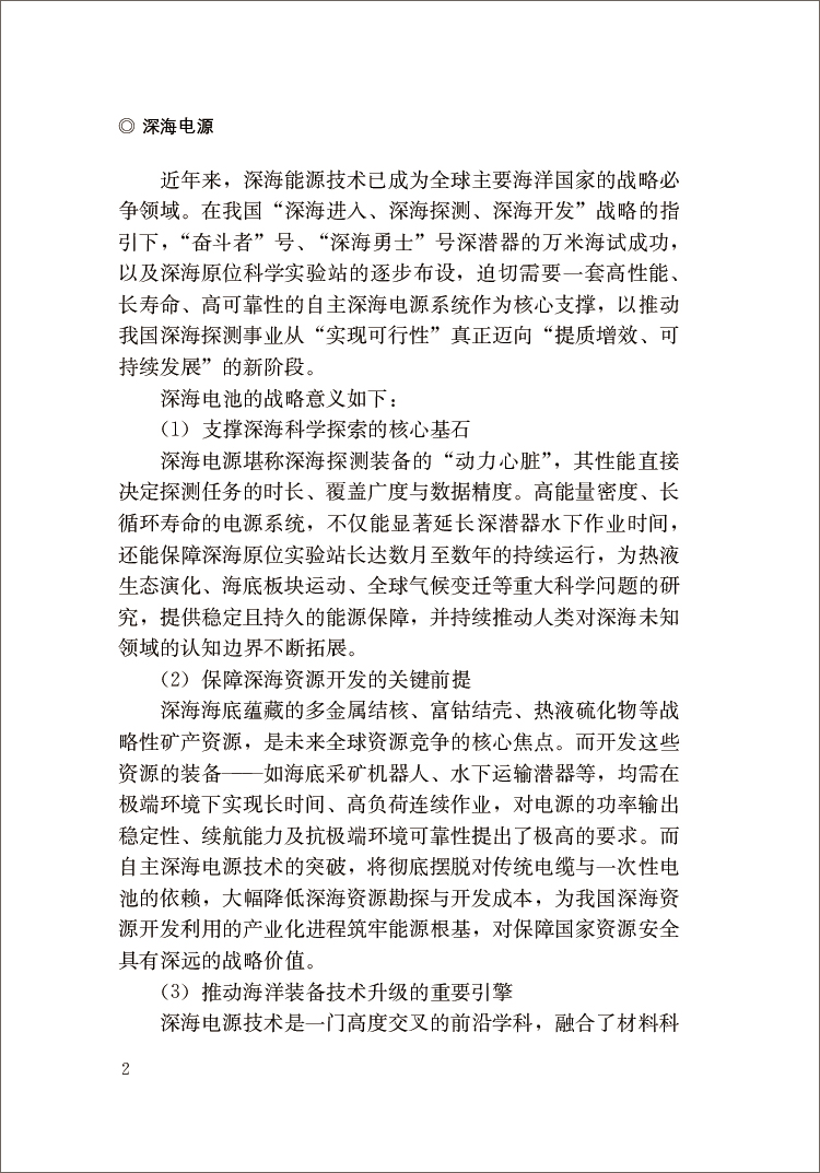 第2章 阐 述 了 深 海 高 能 量 密 度 锂 电池 、 燃 料 电 池 、 核 电 池 的 研 究 进 展 , 第 3章 阐 述