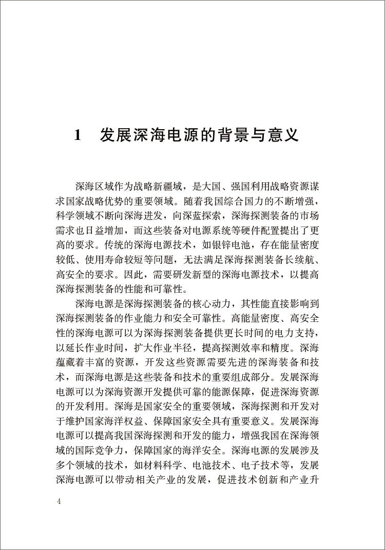 了 深 海 高 功 率钠 电 池 、热 电 池 的 研 究 进 展 , 第 4章 阐 述 了 深 海 长 寿 命 锂 -氟化 碳 电