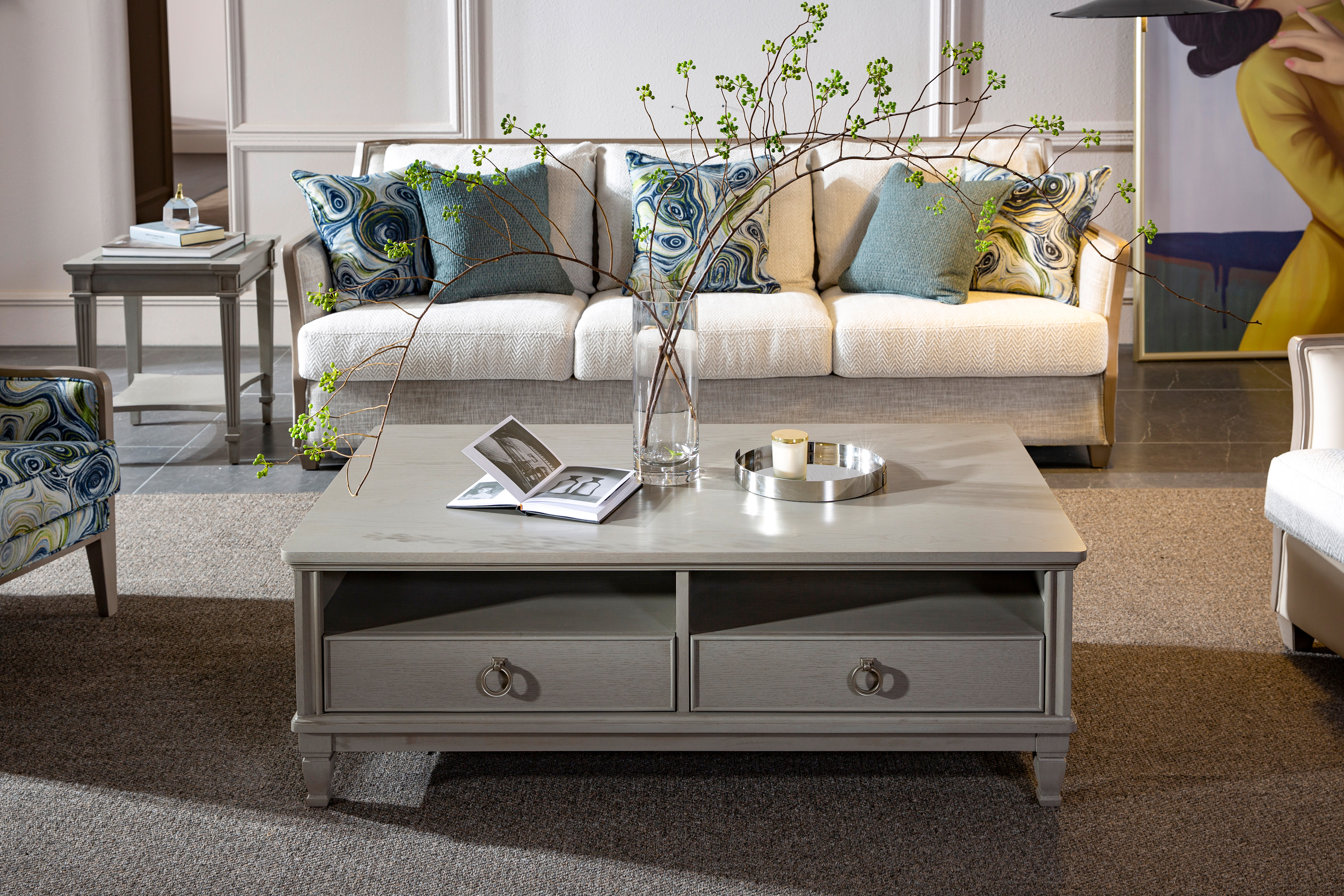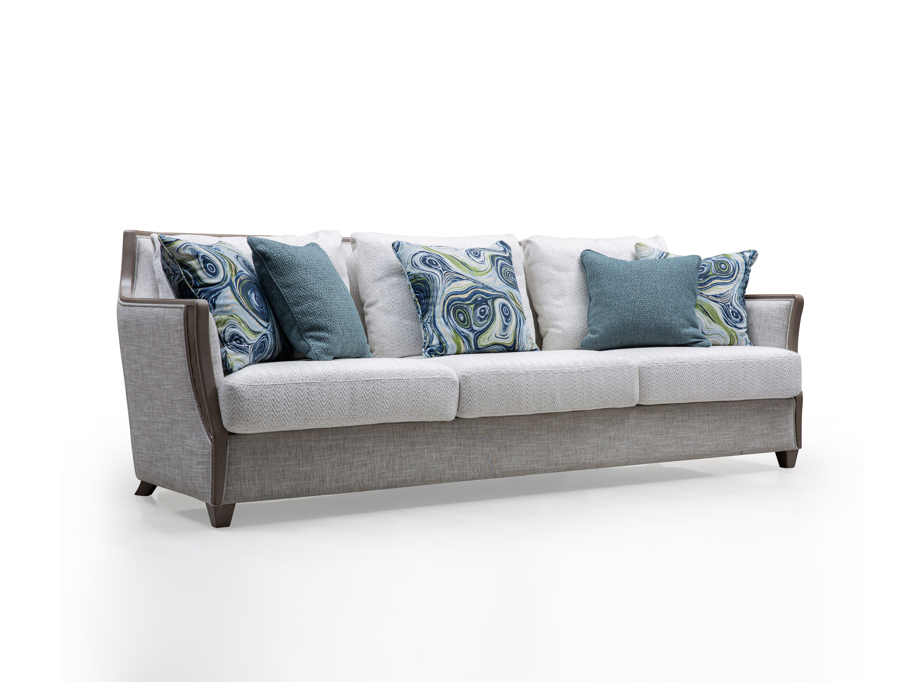 主材:实木框架+人字纹暗花布艺+高回弹海绵