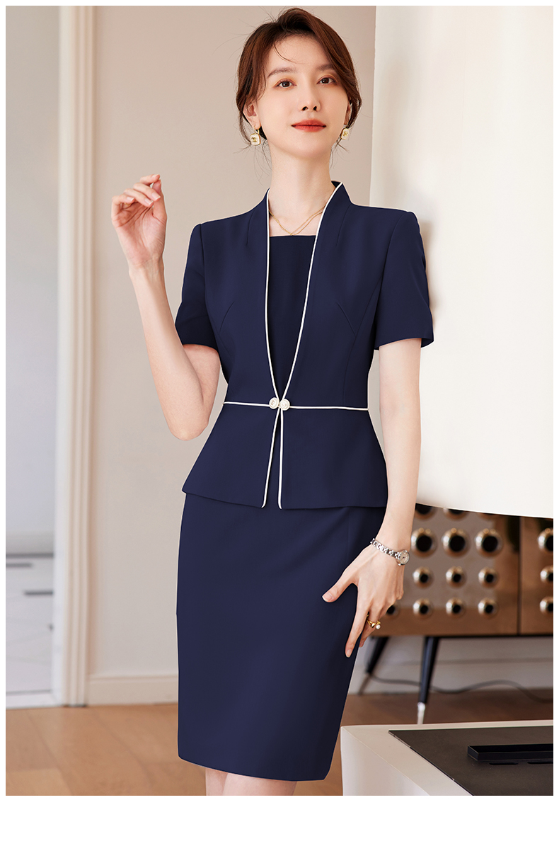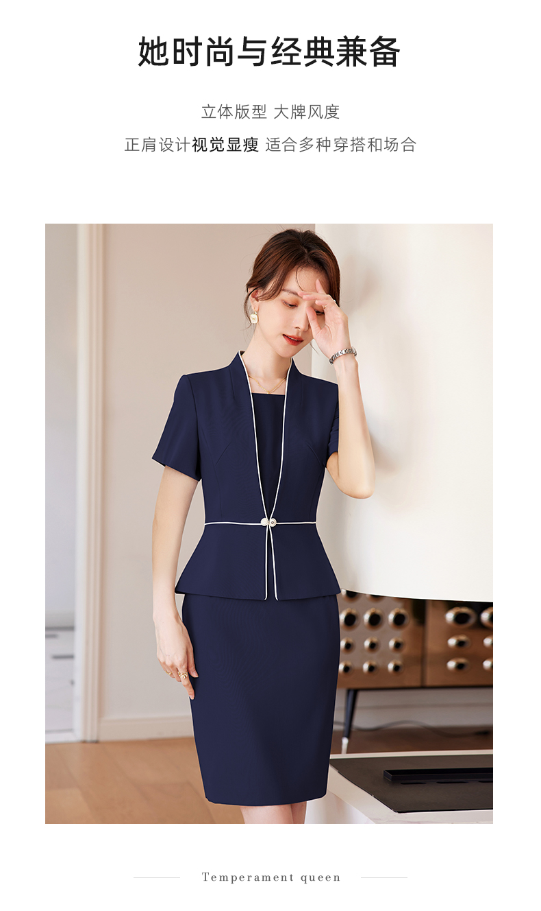 艾尚臣短袖职业洋装女薄夏修身显瘦藏青上班服中长裙子前台接待
