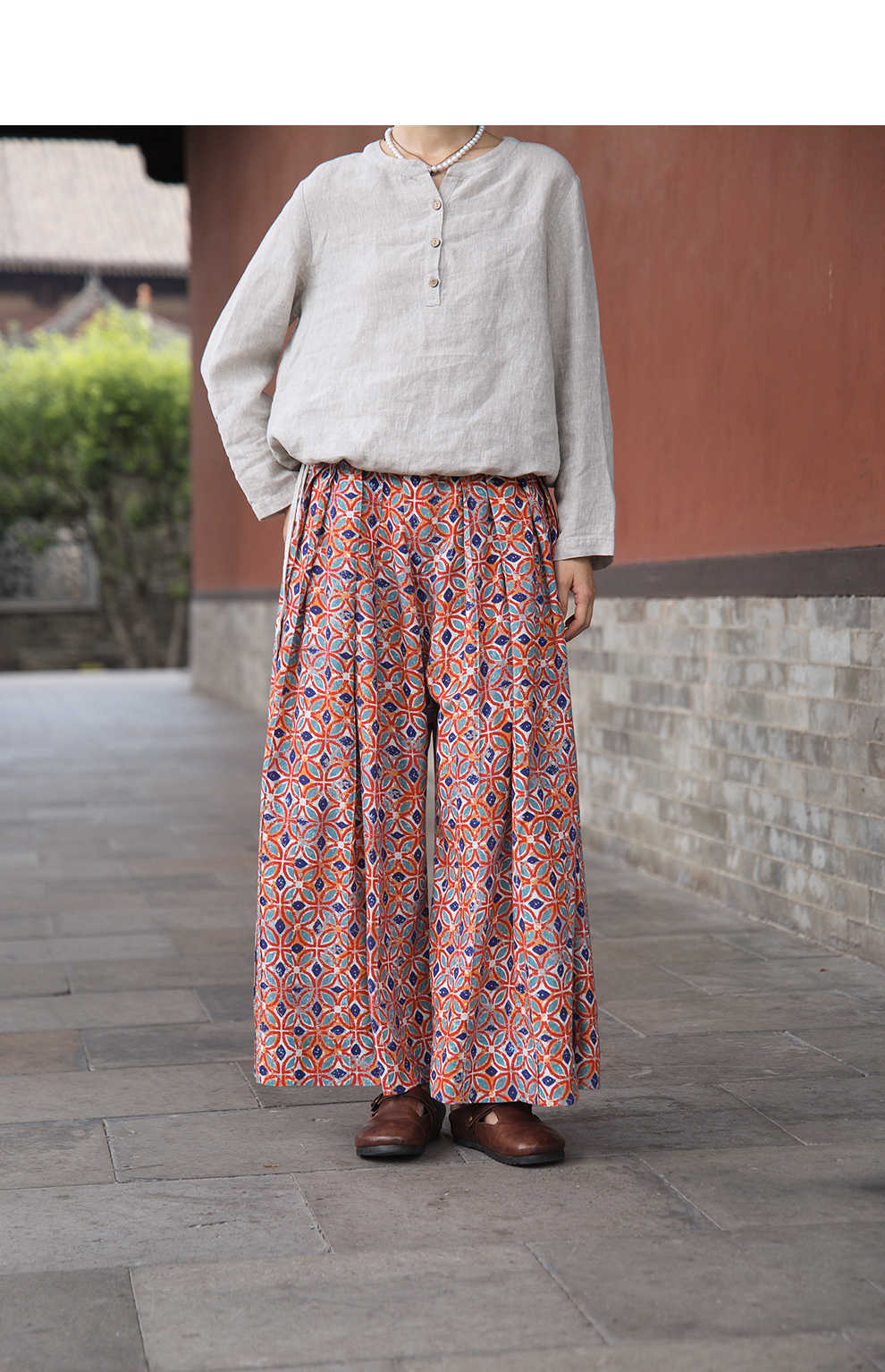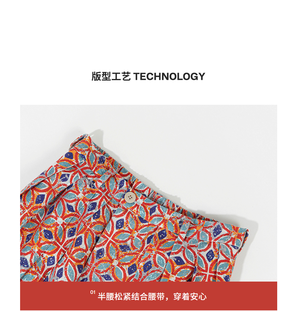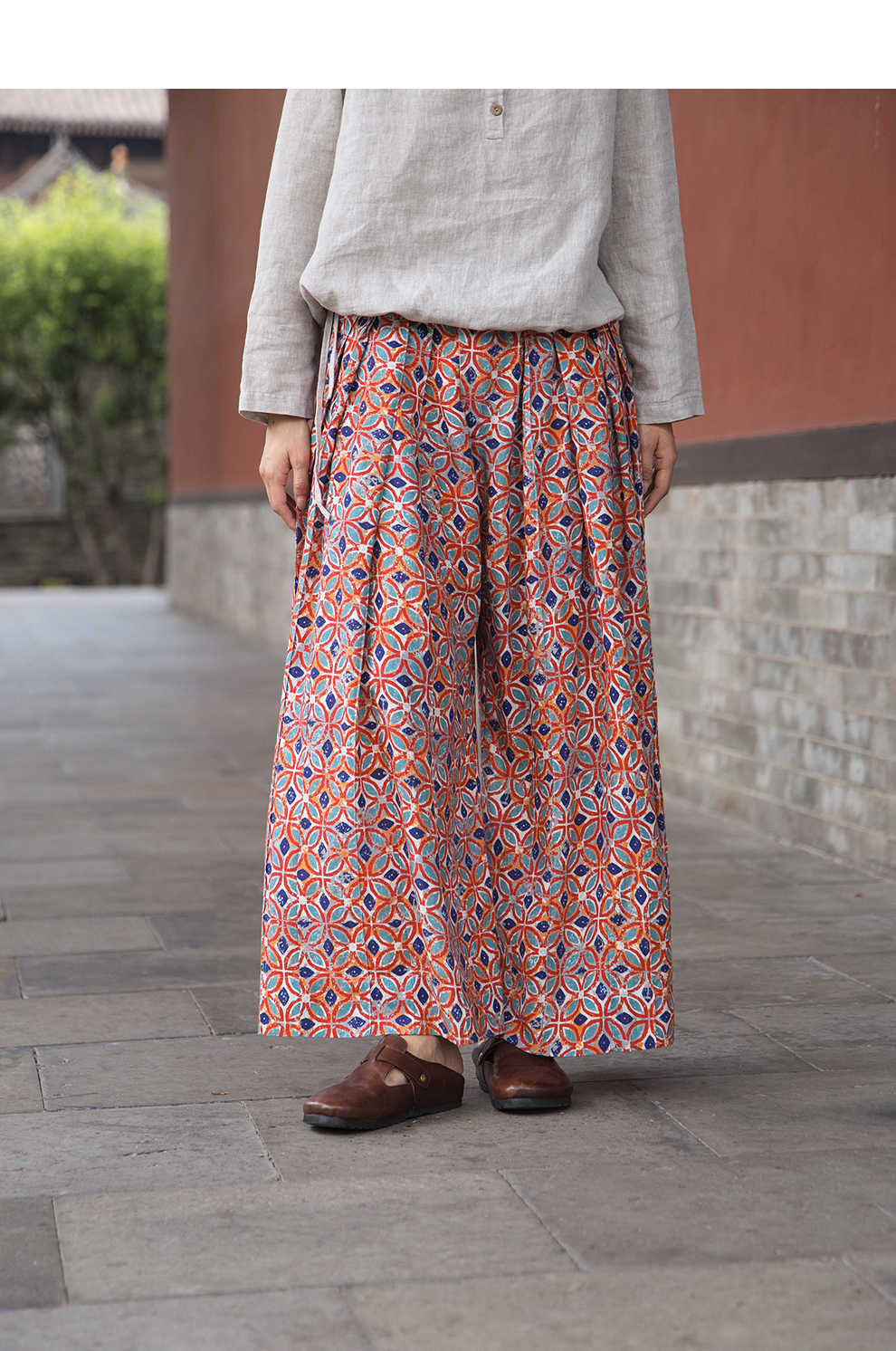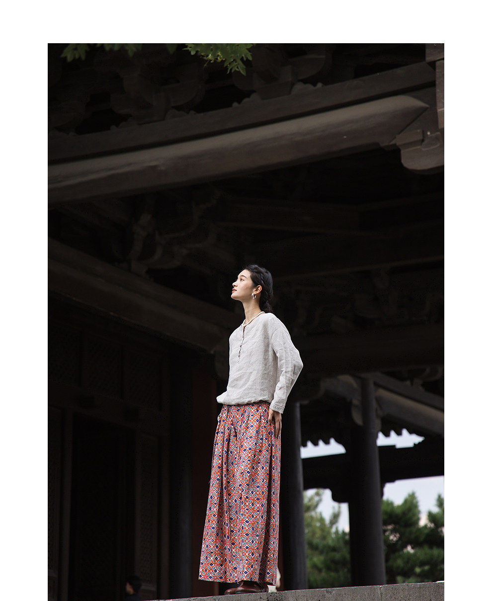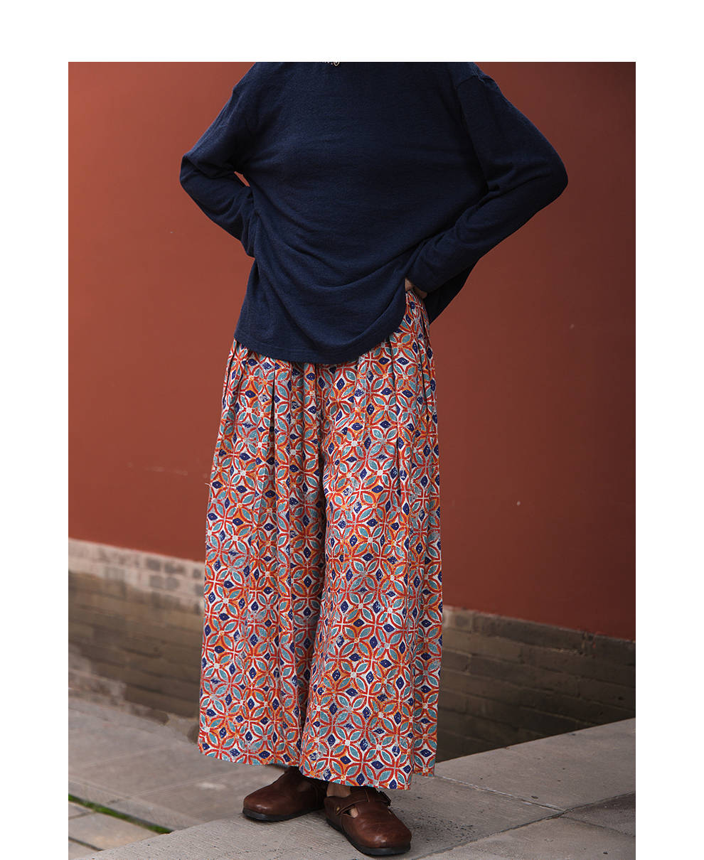 绽放旅行女装600朵/天丝亚麻设计感印花武士裤百搭宽松休闲裤长裤