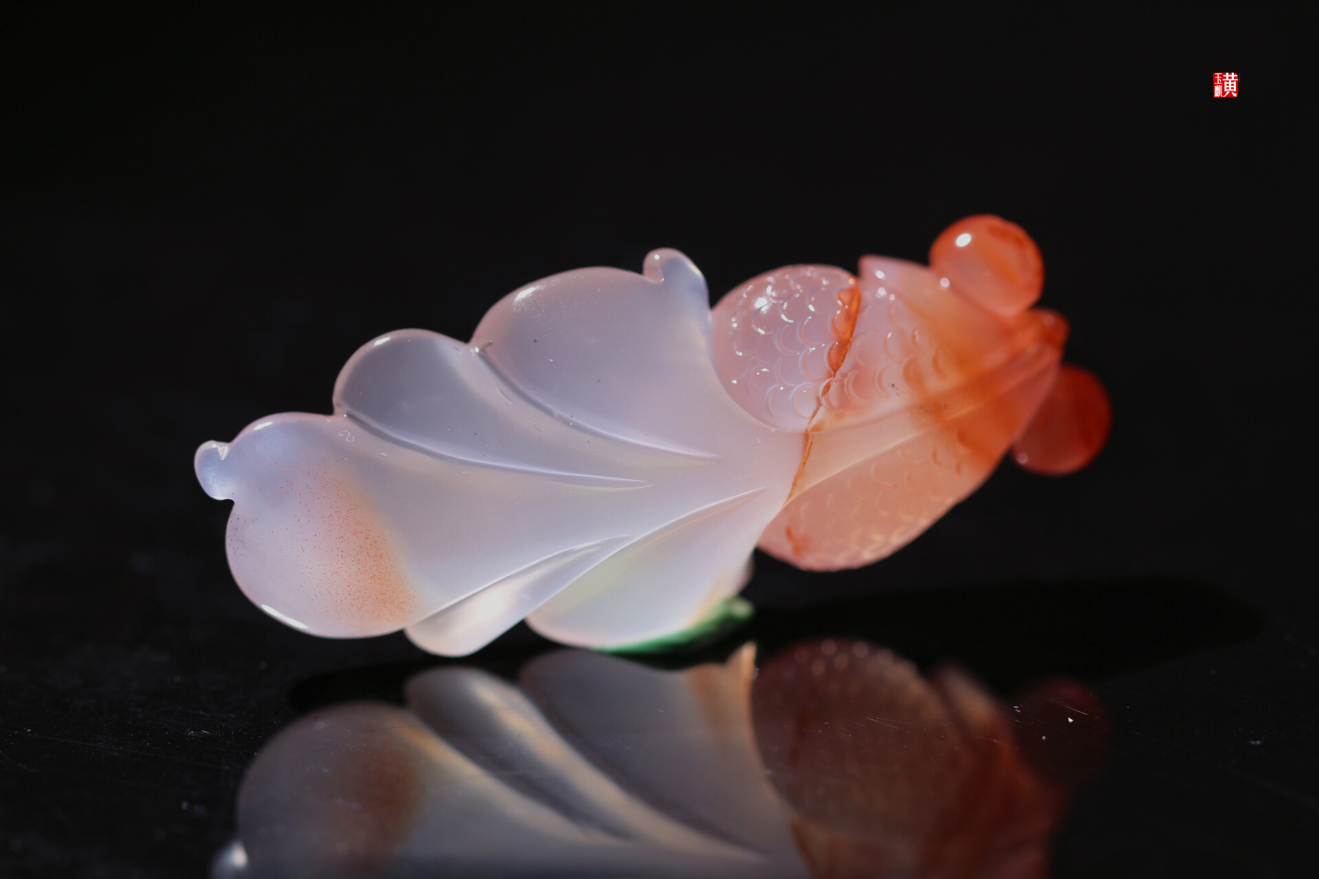南红冰飘金鱼,冰透水润,晶莹剔透,飘红灵动漂亮,雕工精美,惟妙惟肖,寓意年年有余,金玉满堂。