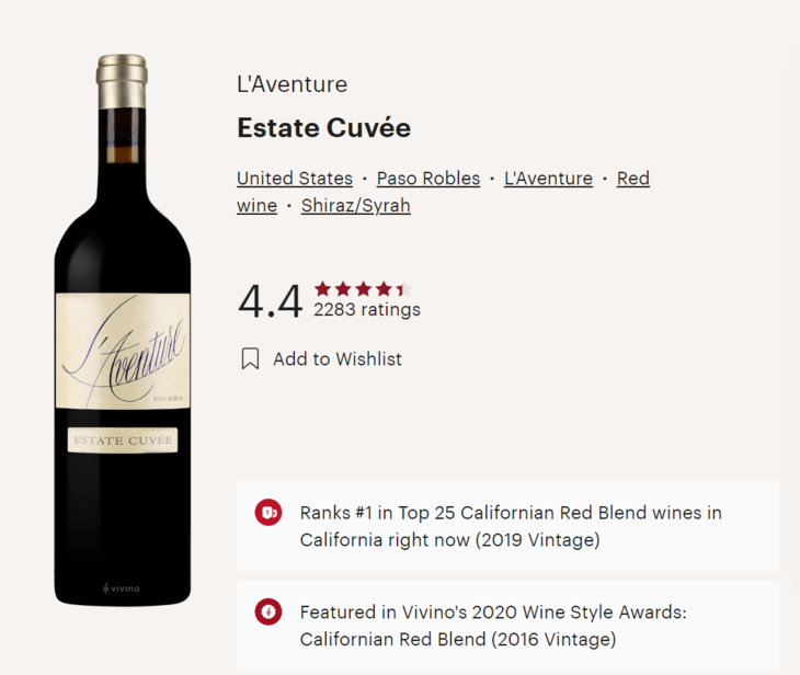 今天重磅推荐:2018 年奇遇酒庄特酿干红(L'Aventure Estate Cuvee Paso Robles )。