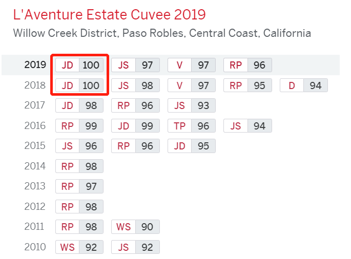2018 年份的此酒斩获了杰布·邓纳克 100 分,詹姆斯·萨克林(James Suckling)98 分和《葡萄酒志》(Vinous) 97 分。