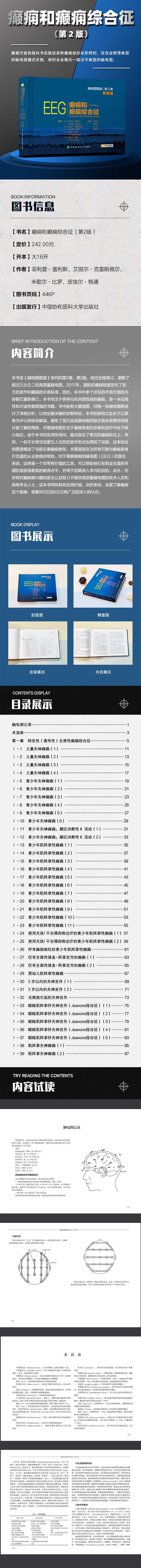 本书是《脑电图图谱》系列的第2卷,第2版,经过全面修订,更新了超过三分之二的高质量脑电图。2017年,国际抗癫痫联盟发布了官方的发作和癫痫的分类标准,因此,本书中多个涉及的术语方面的内容都已重新修订。本书专注于多样化和异质性高的癫痫,是一本实践性和可读性都很强的书籍。书中配有大量插图,对每一张脑电图都进行了详细分析,以突出最关键的诊断特征。本书的独特之处在于以患者为中心的综合解读,避免了因只呈现脑电图而缺乏临床背景而导致片面了解的局限,尽管脑电图在关于癫痫患者的诊断和治疗中处于核心地位。由于本书的实用性导向,重点放在了常见的癫痫形式上;然而,一些不太常见但更引人注目的发作形式也得到了说明,这本综合的图谱概述了当前主要癫痫类型。本图谱旨在为所有可能与癫痫患者打交道的从业者提供帮助。对于需要接触到脑电图(EEG)的医生来说,这将是一个有价值的工具,可以帮助他们在职业生涯的早期阶段获得更高的教育水平,并用于后期深入学习的目的。此外,对所有对癫痫感兴趣的医生以及致力于提供高质量脑电图的技术人员和其他专业人士,这本书同样具有应用价值。总的来说,全面了解癫痫这个疾病,需要对它们的EEG有广泛的深入的认识。